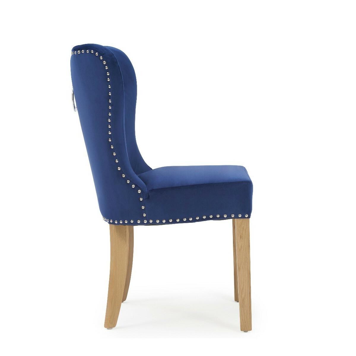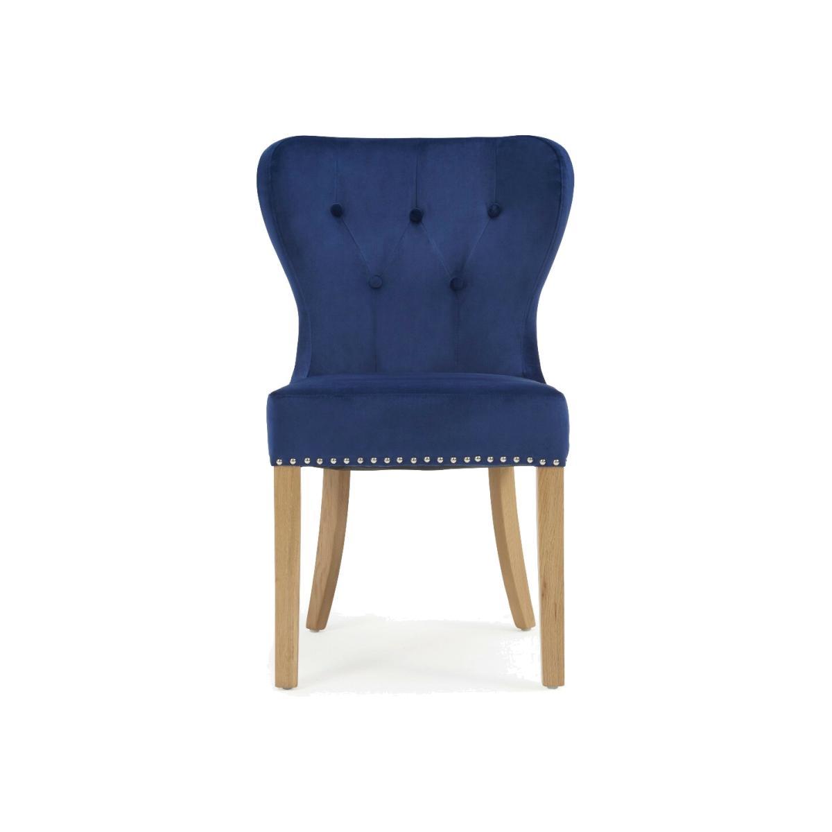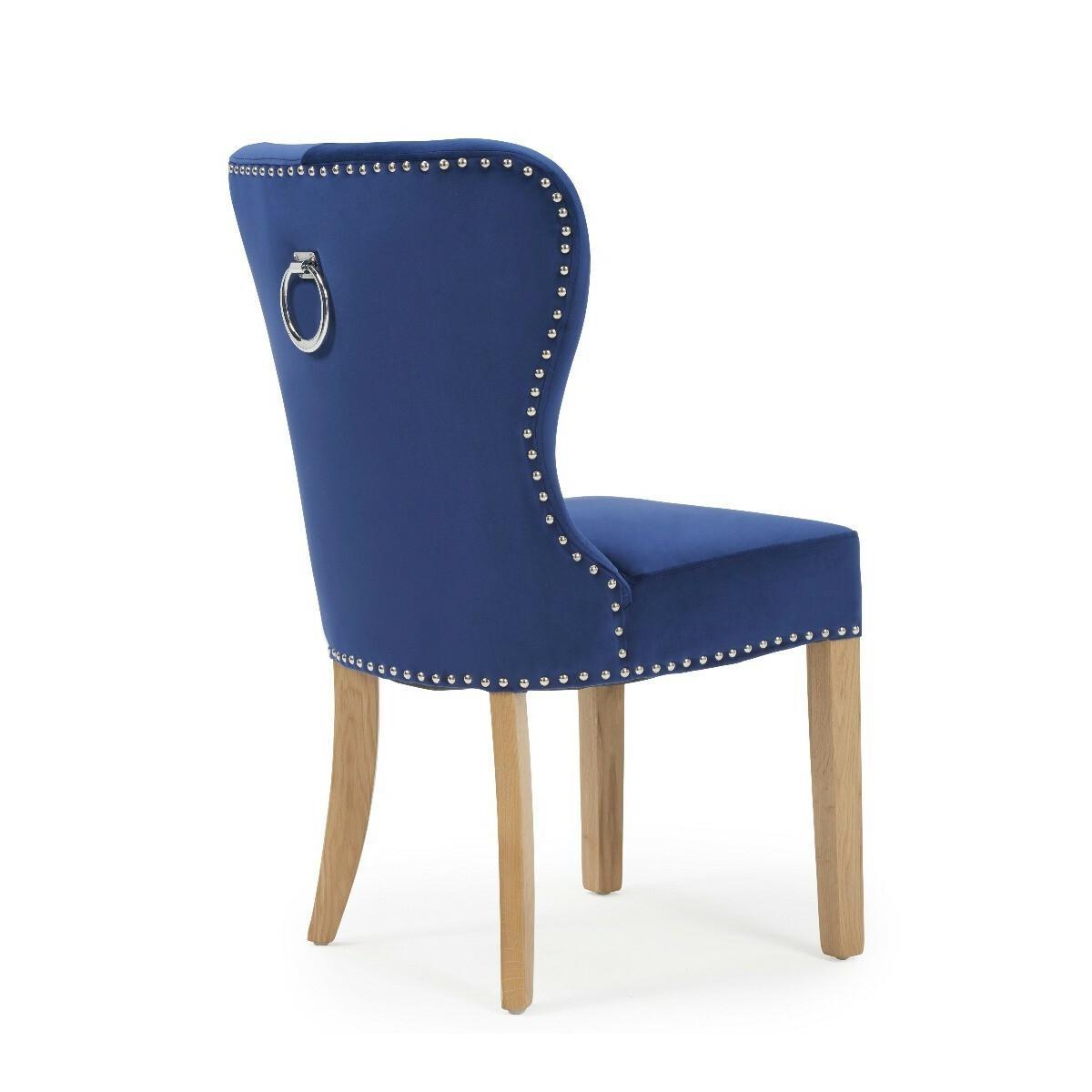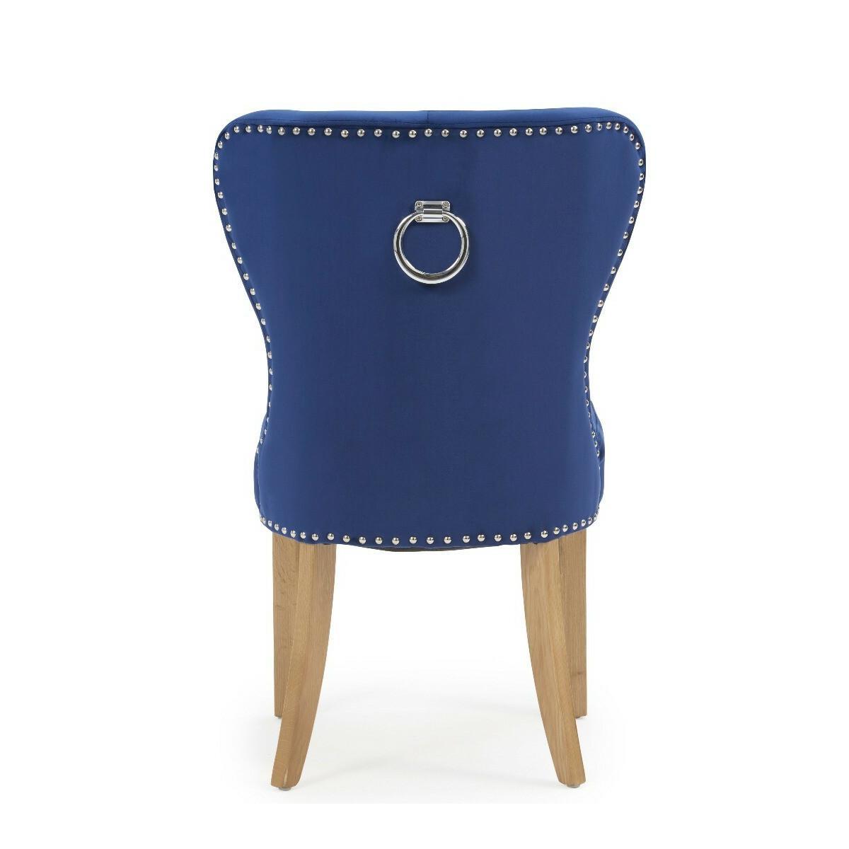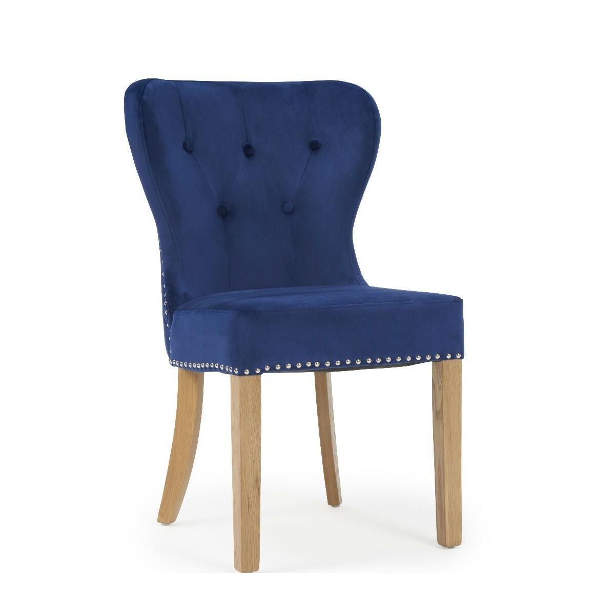 Radiating opulence, the Knightsbridge Studded Blue Velvet Fabric Oak Leg Dining Chairs are striking in appearance and undeniably comfortable. Featuring contemporary and on-trend studded detailing with smooth velvet fabric, the chairs will suit any décor thanks to their neutral tone. Pairing beautifully with almost any table, the Knightsbridge Chairs will undoubtedly be a stand-out piece in your home and are ideal for both causal meals and dinner parties. PLEASE NOTE: This is an ex-display item. All Ex-display items are non-refundable (excluding delivery damage and manufacturing faults).Ex-display items may show signs of standard wear and tear, however any significant marks or damages will be specifically stated below.