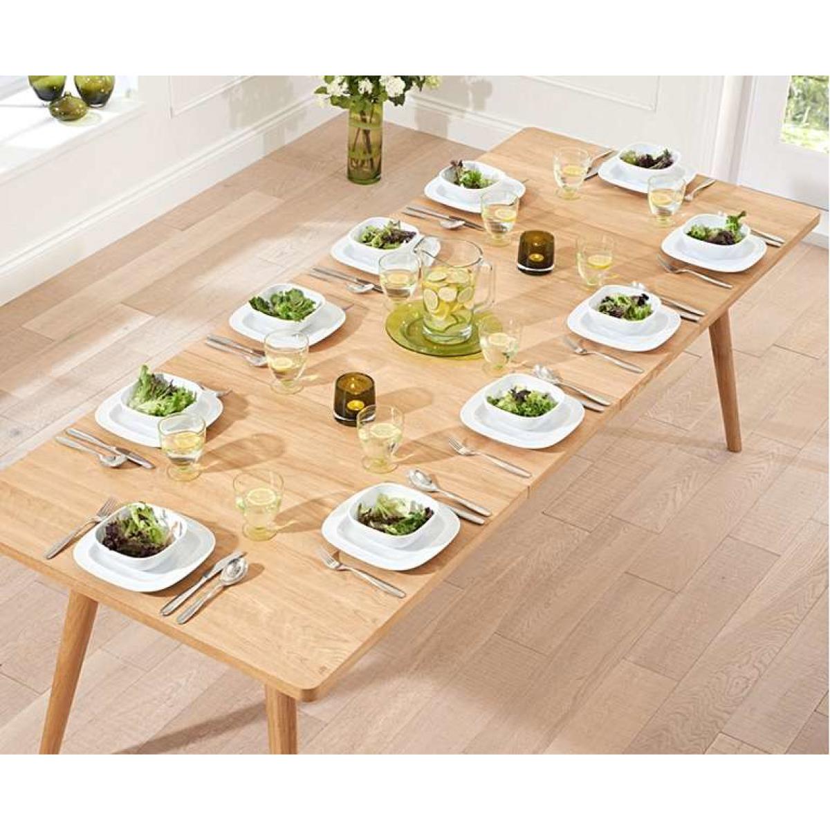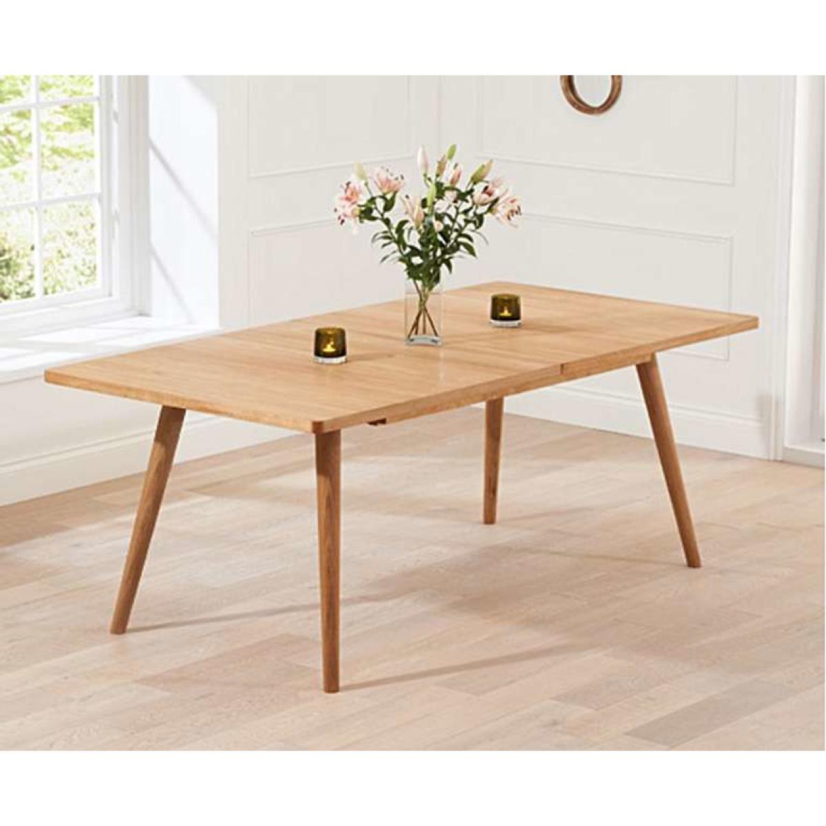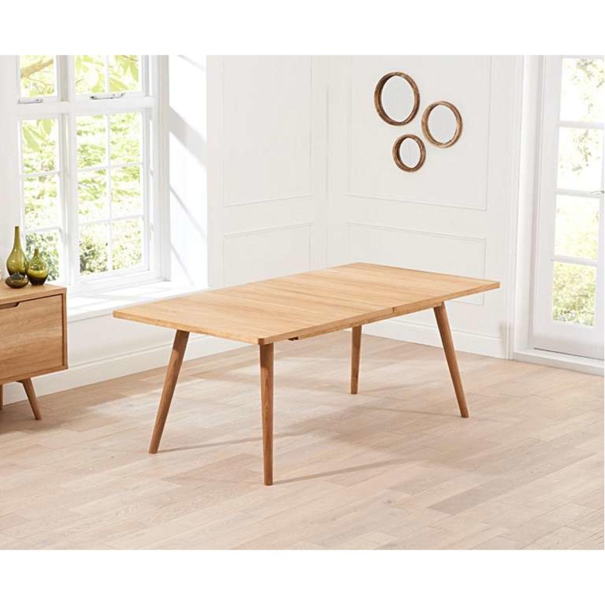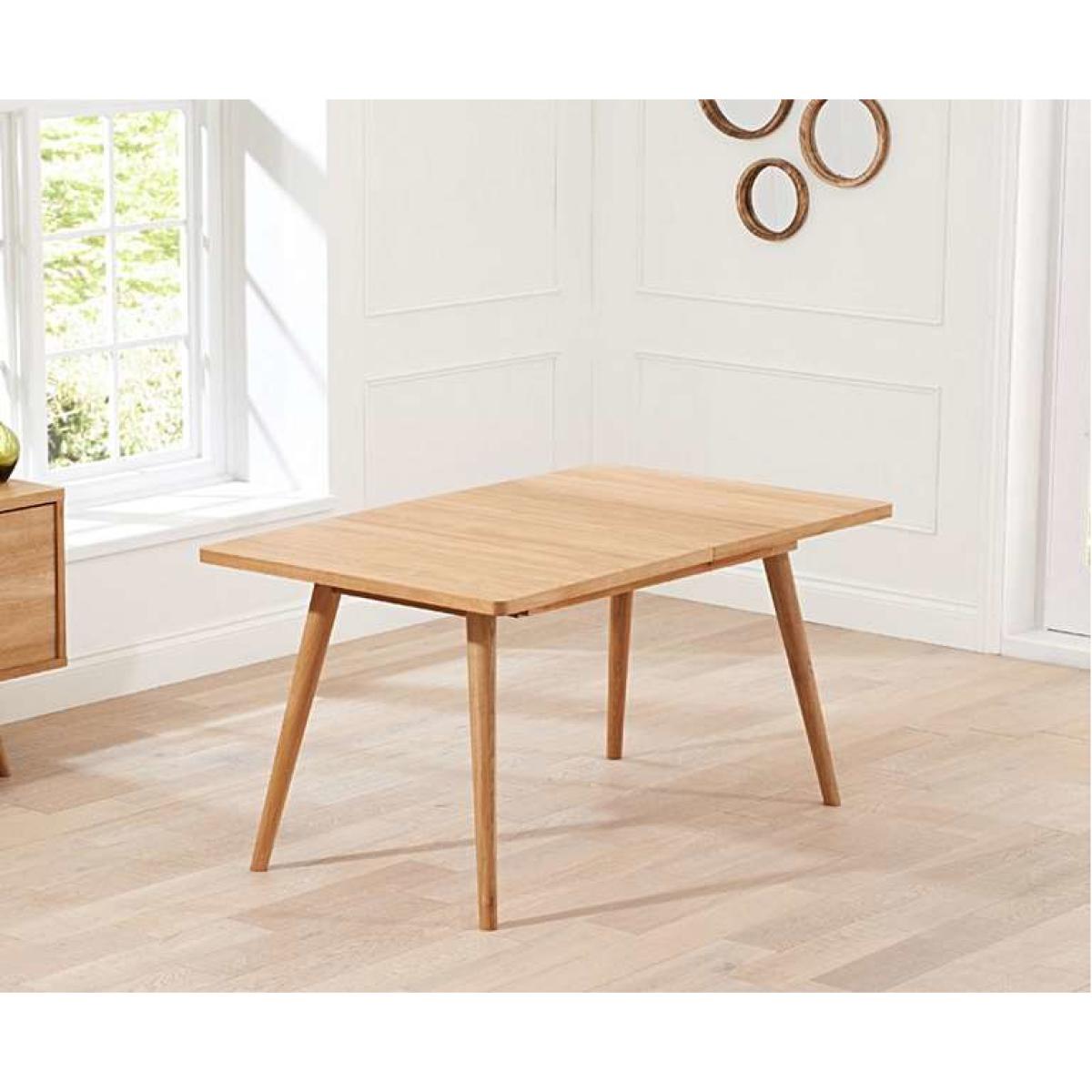 The Tivoli 150cm Oak Extending Dining Table is a stylish and impressively versatile addition to your dining area. Seating 6 diners, the oak dining table adapts to suit any occasion as it extends to seat 10.The extending dining table has been carefully crafted from oak and finished with a smooth oil that highlights the oak grain. The dining table features an oak veneer table top supported by tapered solid oak legs for a distinctly retro look. The oak dining table extends via an extension feature with two 45cm panels that store discreetly within the table when not in use. The extending leg design of the Tivoli table allows the legs to move away from the frame as it extends, increasing the seating capacity in moments. PLEASE NOTE: This is an ex-display item. All Ex-display items are non-refundable (excluding delivery damage and manufacturing faults).Ex-display items may show signs of standard wear and tear, however any significant marks or damages will be specifically stated below.