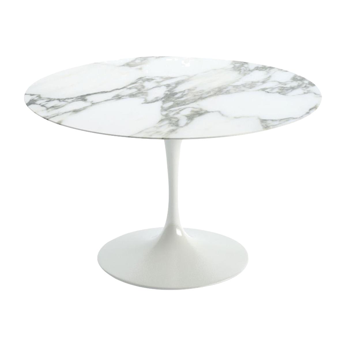 The Tulip Dining Table with an Arabescato marble top and white base is an icon of mid-century design, manufactured exclusively by Knoll and carrying Eero Saarinen's signature as a mark of authenticity. Conceptualised at the behest of mid-century modern design entrepreneur Florence Knoll, Saarinen vowed to address the "ugly, confusing, unrestful world" he observed underneath chairs and tables - a so-called "slum of legs. "A five-year design investigation led him to create the revolutionary Pedestal collection, first introduced in 1956. A hero product of the collection is this simple yet elegant Tulip Dining Table, whose sweeping silhouette provides the perfect antithesis to the typical clutter found under chairs and tables. The sturdy and sculptural white aluminium base sweeps elegantly from the floor to support a uniquely veined Italian Arabescato marble top, which is sealed with a transparent polyester coating to provide a stain-resistant and wipe-clean finish. Please note: This is an ex-display piece and therefore may show signs of wear proportional with use. The utmost effort is made to accurately showcase each intricacy and imperfection, and this piece is sold as seen.