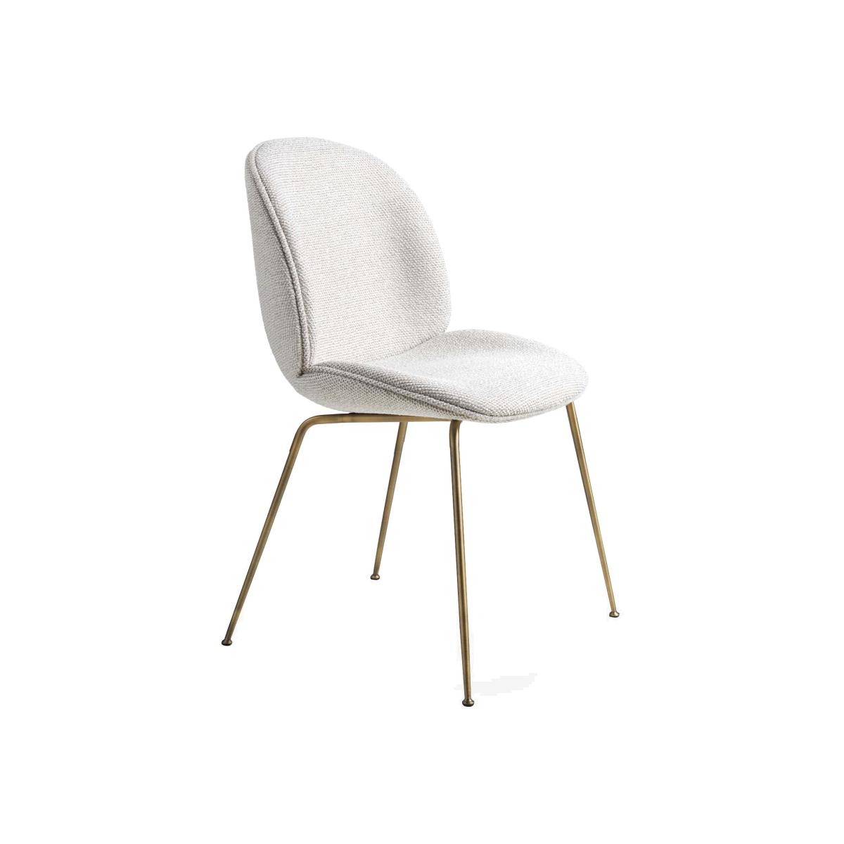 GamFratesi's iconic Beetle Dining Chair, inspired by the shape, shell and structure of the eponymous insect, is newly updated by the young design duo in sumptuous beige Safire two-tone upholstery, only at The Conran Shop. Stine Gam and Enrico Fratesi found the anatomy of the beetle captivating; the structure is composed of different plates separated by thin sutures, and it is this external shell that supports and protects the animal's body. All of these elements are perfectly linked and work together in a way that fascinated the designers. The design of the chair reinterprets the characteristic elements of the beetle's body: rigid on the outside and soft within, while maintaining optimum comfort and superior functionality. The seat and back of the Beetle are created using laminated moulded veneer. One of four new releases, this version showcases a thick bouclé and chenille upholstery, offering a layered two-tone effect. Atop antique brass legs, the chair evokes a minimal and modern architectural aesthetic.