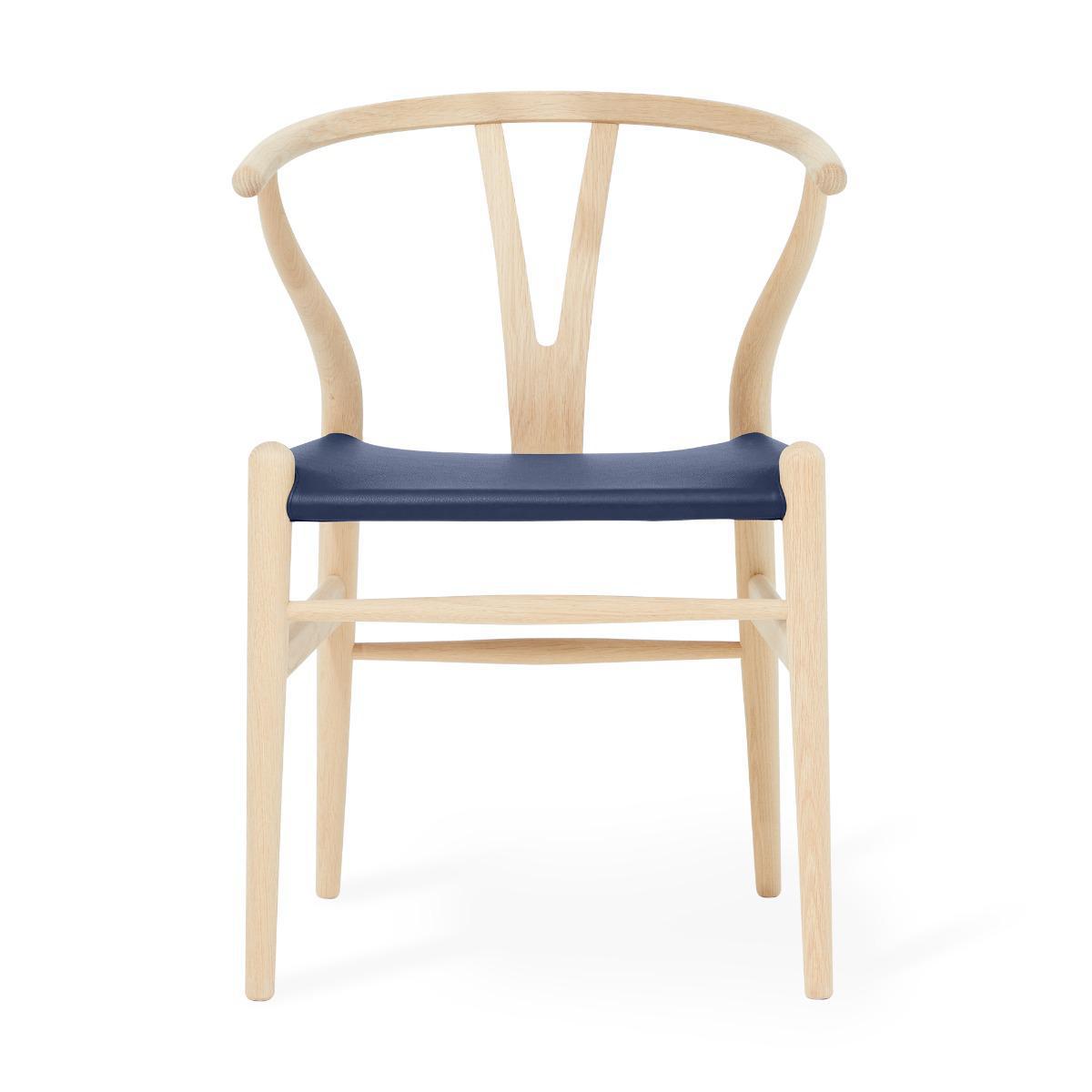 We are honoured to premiere our latest collaboration with Carl Hansen & Søn: Hans J. Wegner's quintessential CH24 'Wishbone' Chair in an exclusive assortment of leather seat finishes backed by a soaped oak or oiledwalnut frame. Trading its traditional handwoven seat for a leather upgrade, our private iteration of this mid-century classic presents five unique finishes clad in low-maintenance leather. The exquisitely grained semi-aniline ox hide resists most stains and sunlight-induced fading. Designed in 1949 and informed by a portrait of Danish merchants sitting in traditional Ming chairs, the Wishbone showcases the ergonomic sensibility that defines an antique Chinese chair. Its characteristic ‘Y’-shaped detail gives the chair its name and provides outstanding support and stability, making it an ideal piece for both work and relaxation spaces.