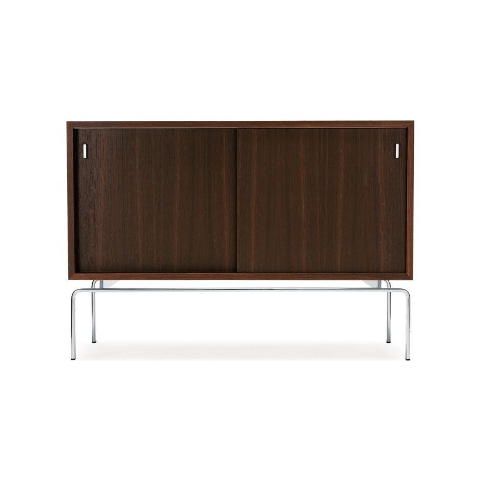 The Conran-exclusive FK 100 Sideboard was designed by Fabricius & Kastholm in 1965 and is assembled today using the original factory and tools by Lange Production. The sleek cabinet is crafted from oak or rosewood veneer, which balances atop a chrome-plated steel base. A single shelf can be found behind the sliding doors, offering organised storage for your belongings. Lange Production is the passion of Henrik Lange, who has collected design objects since the age of five. Stationed in Denmark, the manufacturer focuses particularly on designs from the 1960s, working closely with the estates of the original designers to ensure authenticity and quality. Fabricius & Kastholm met while studying under Finn Juhl at Copenhagen’s School for Interior Design.