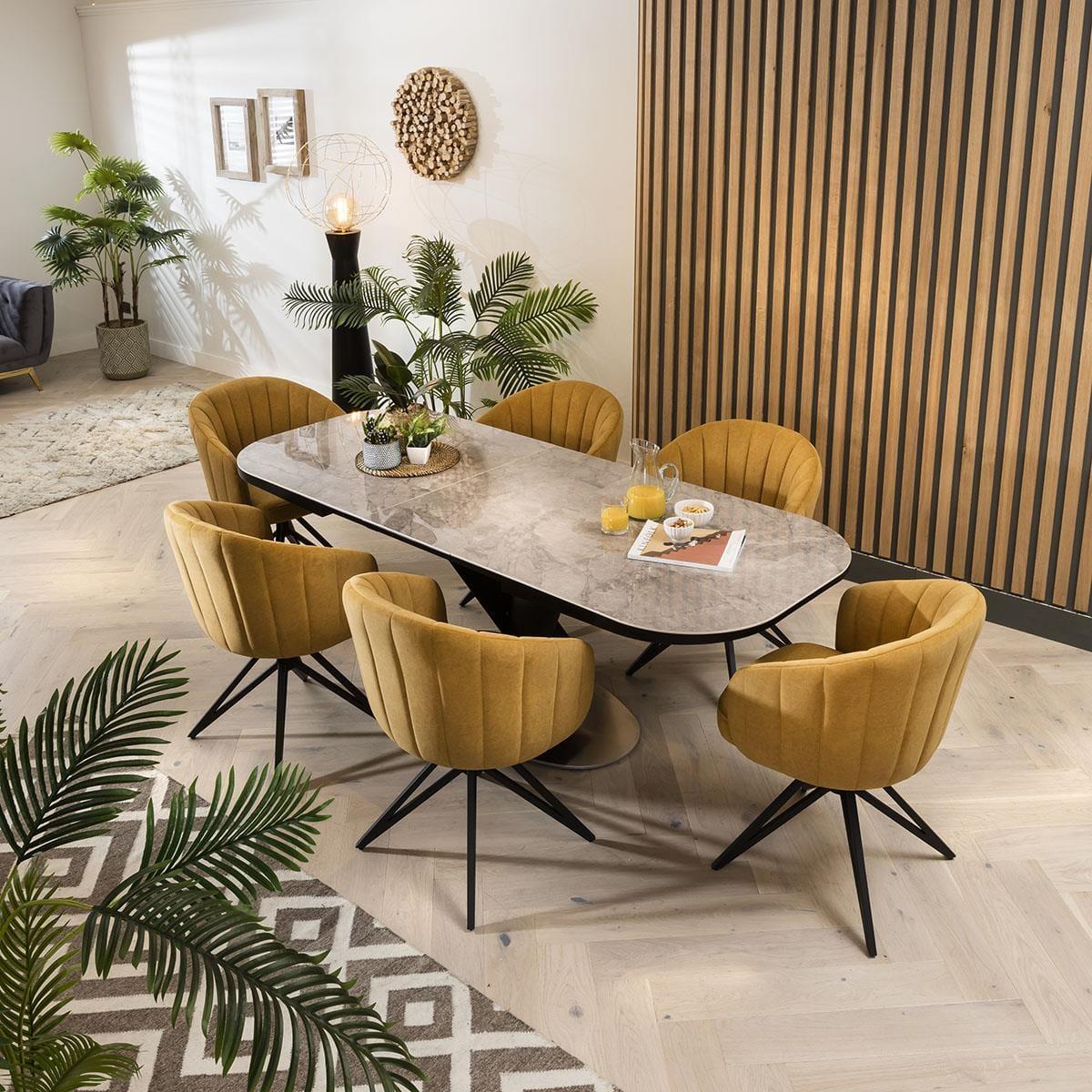 Large modern dining tables where the whole family can come together is what we specialise in. This extendable ceramic dining table pulls inspiration from modern designer-chic that is sleek and sophisticated, with a truly modern design featuring soft, rounded edges and a bold pedestal with a geometric feature. The black powder coated pedestal and brushed stainless steel base provide a sturdy, balanced base for tables and desks of various sizes. The elegant 6 - 8 seater table easily extends from 180cm to a generous 220cm and features tempered glass with a smooth 5mm grey marble effect ceramic finish. The simple elegant style of an upholstered chair is enhanced by the plain structure, powder-coated metal legs, and shell-shaped seat with a half-moon recess. The 9214 dining chair really has it all, clean contemporary lines, attractive ribbed upholstery detailing and a fully cushioned seat and back upholstered in premium mustard yellow fabric. The 9214 rotating mustard dining chair with ribbed stitching, comes with splayed black metal powder-coated hairpin legs with a swivel mechanism, making it easy to get out of and into again. W220cm D90cm H76cm Highly durable ceramic tabletop Set includes the dining table and 6 chairs