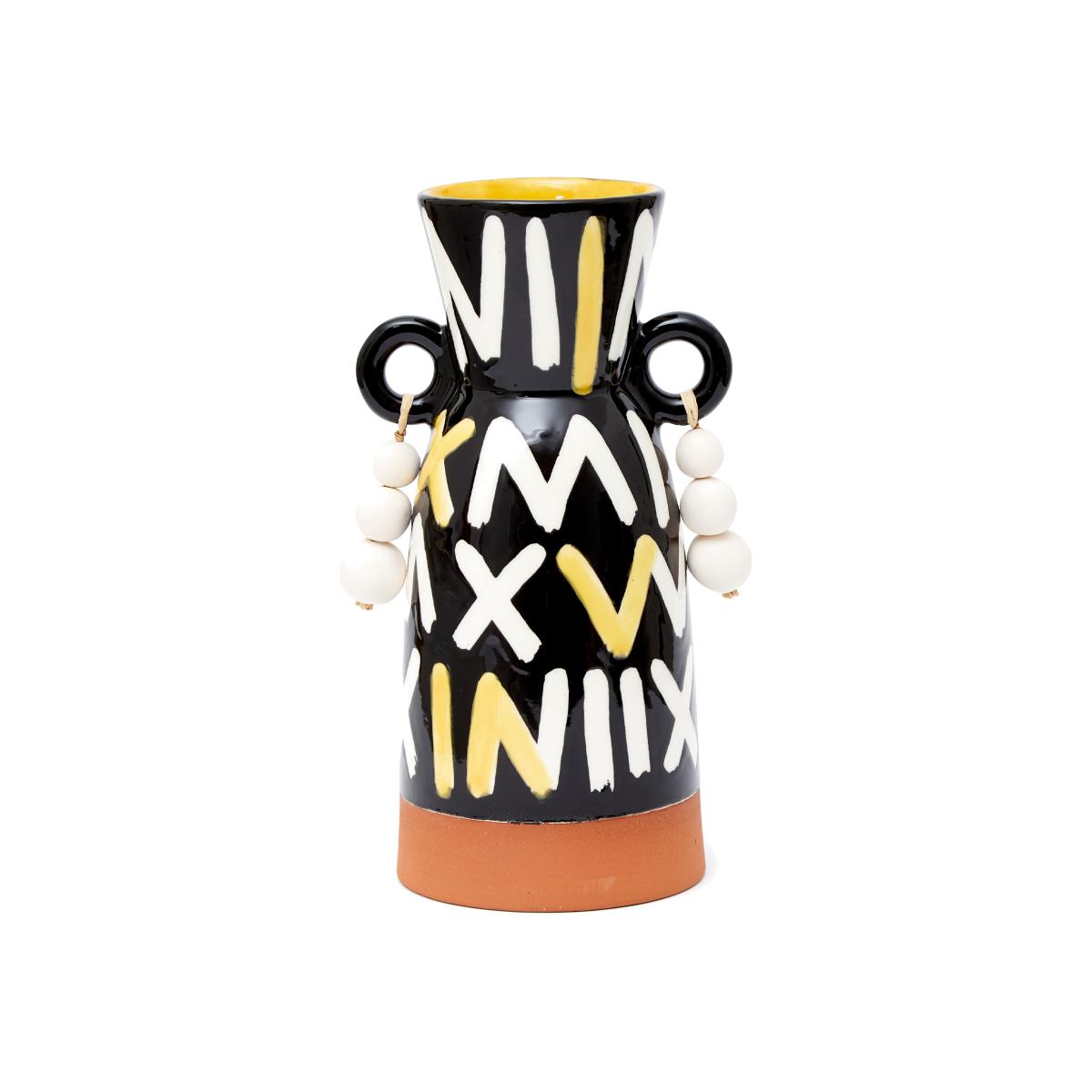 Designed exclusively for The Conran Shop, the Illi Vase from Bouchra Boudoua is handcrafted in Morocco, reinterpreting the centuries-old craft with a modern sensibility. Crafted from terracotta and finished in a handpainted glaze design, the piece is largely influenced by Boudoua's daily life in Morocco and travels around the region. After studying Spatial Design at Central Saint Martins, Moroccan designer Bouchra Boudoua returned to Marrakech to set up a studio in collaboration with local potters, employing their many generations of knowledge in the field to create functional and decorative ceramic pieces for the home. Connecting to the roots of ceramics in Moroccan culture, Boudoua's work strives to find a balance between the worlds of craft and design, whilst maintaining a characterfully naïve aesthetic.