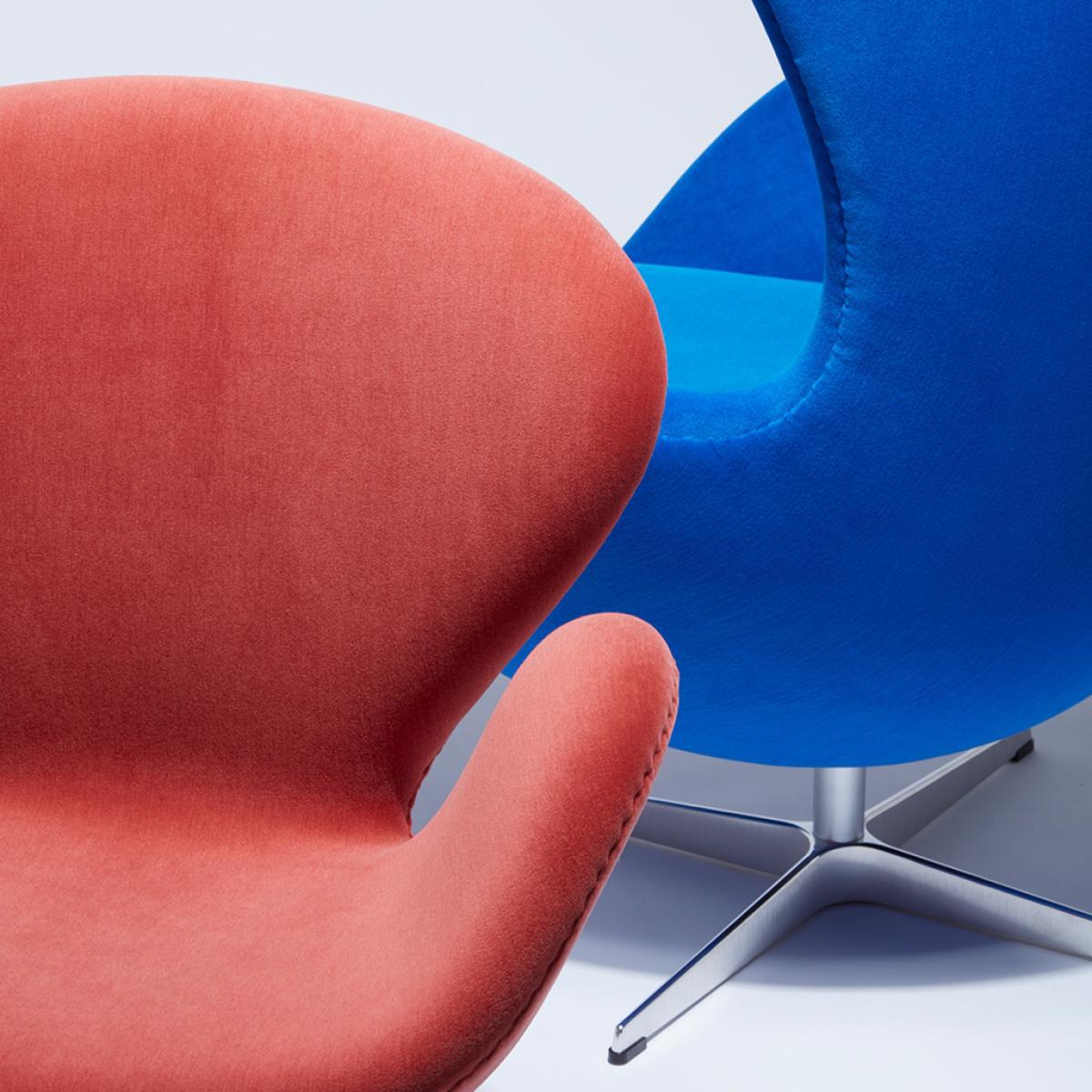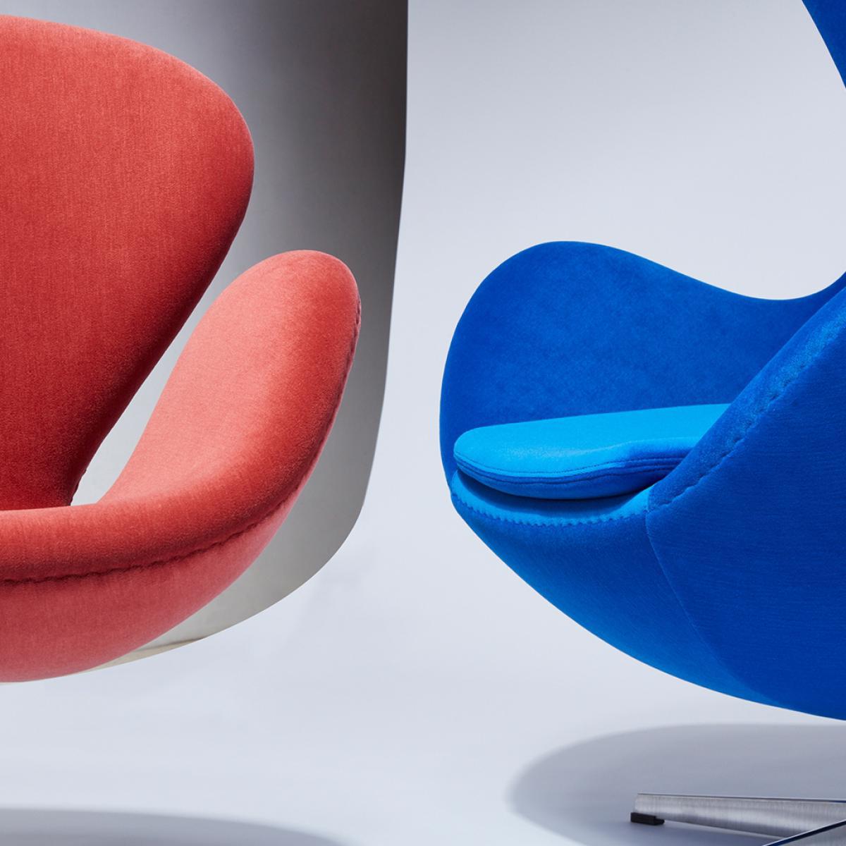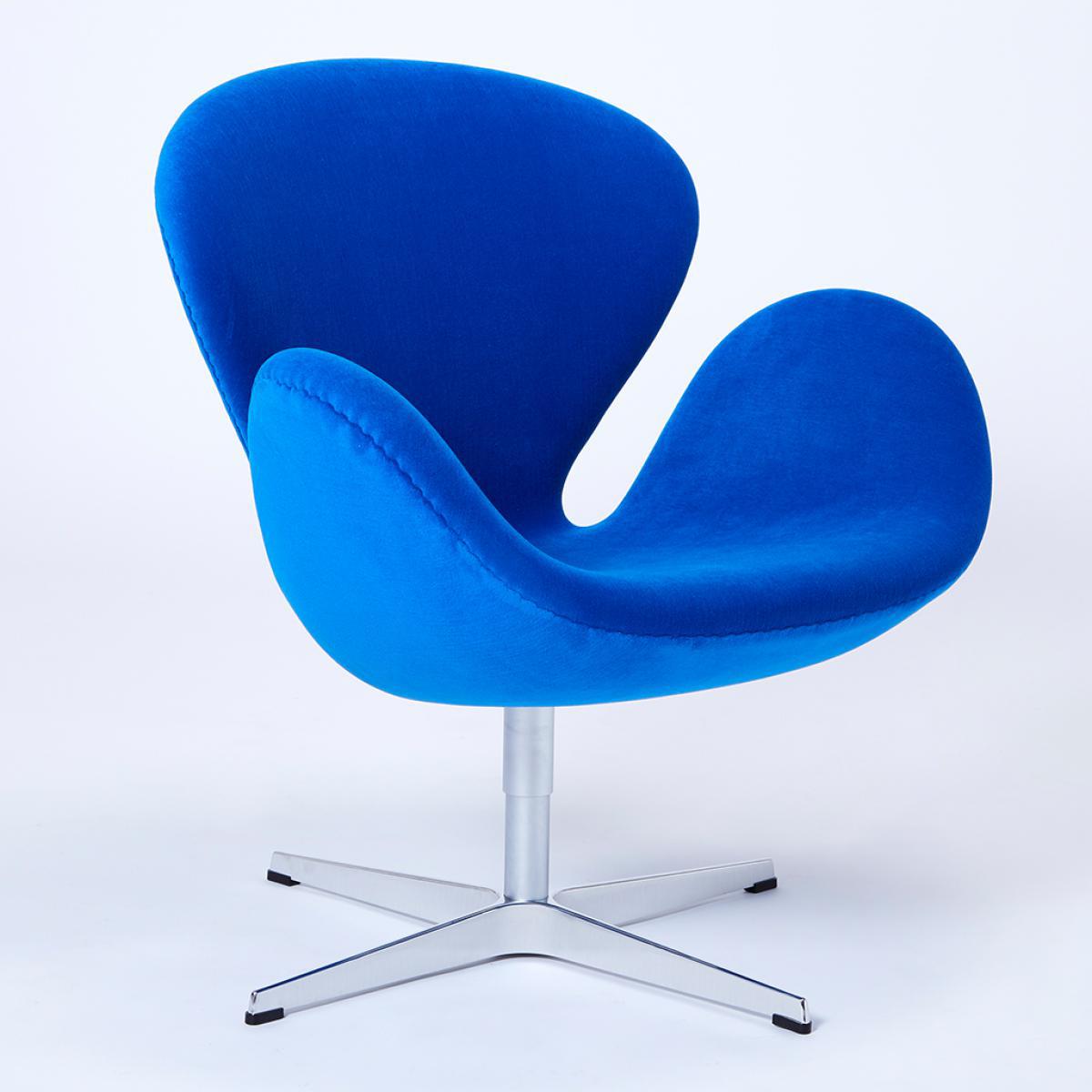 Arne Jacobsen's distinguished Swan Chair is a hero of mid-century design. It is exclusively available at The Conran Shop in Kvadrat's blue Gentle 2 upholstery, manufactured by Fritz Hansen. The Swan was crafted using new techniques for its time, with Jacobsen being the first to utilise a strong foam inner shell underneath the chair's upholstery. Using a unique process, Jacobsen tested and prototyped the shape and form of the chair using clay in his home studio. The chair sits atop a polished aluminium base and its intricate configuration requires bespoke upholstery. This edition boasts Febrik's new wool blend for Kvadrat, specially sourced from The Netherlands and marks the first time that the chair is available to purchase in a velvet finish. Conceptualised in 1958 for Jacobsen's architectural endeavour, the Royal Hotel Copenhagen, the chair's curves offer a sculptural contrast to the building's straight edges and vertical lines. Although renovated in 2018, Jacobsen's legacy is still prevalent in every space and room 606 remains unchanged, true to his original commission.