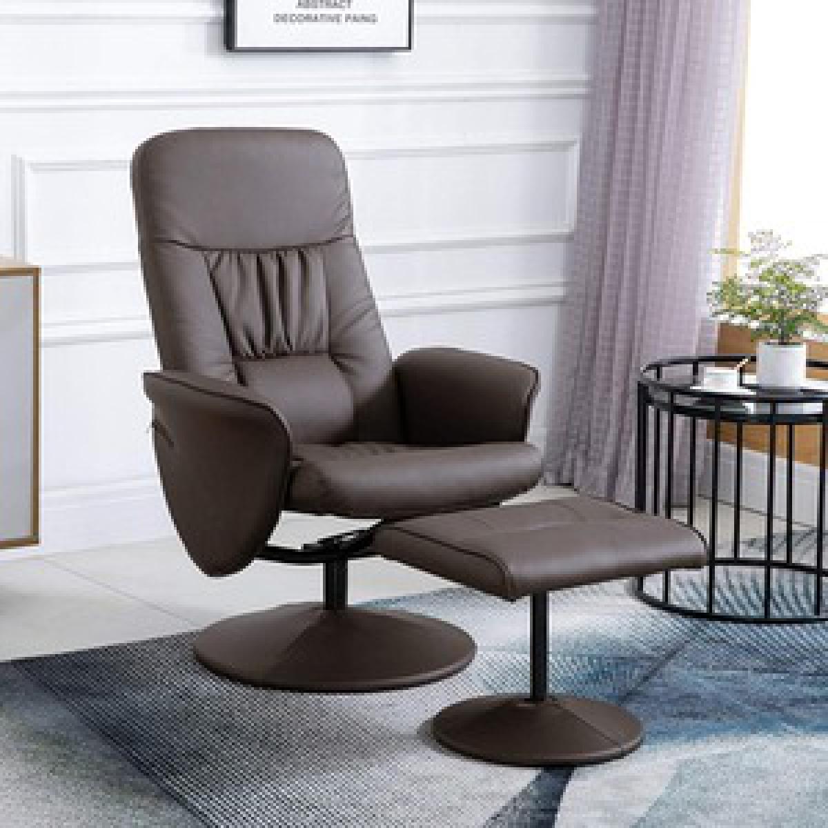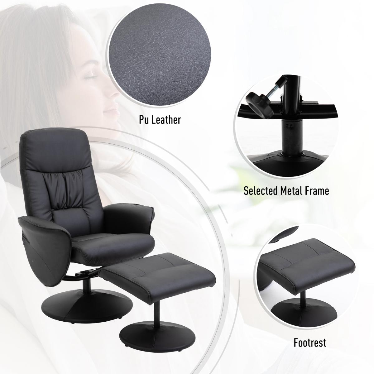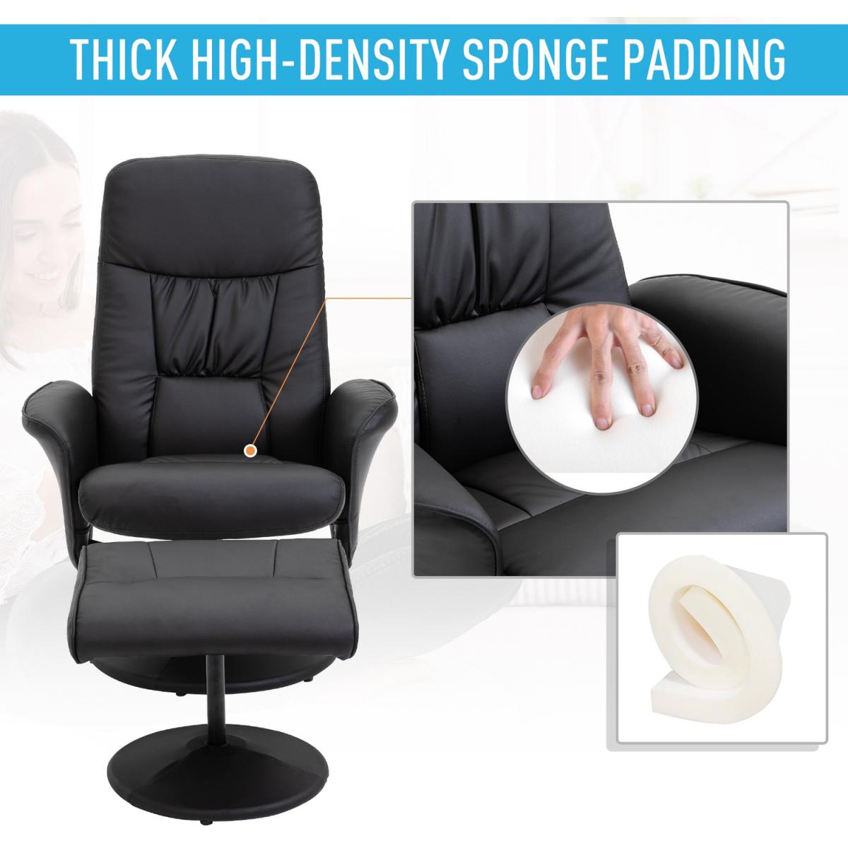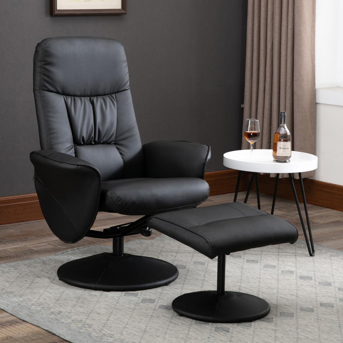 Bring supreme comfort into your home and office with this brown recliner and footstool duo from HOMCOM. Made using a metal frame for reliability and strength, the armchair is crafted into a wide-fitting design that features a high slanted back for posture support, all-over padding for prolonged comfort, curved armrests and PU leather upholstery for a sleek and easy-to-maintain finish. Reclining up to 135 degrees for the perfect place to take a rest, it is finished with a 360 degrees swivel base to move easily from side to side and the matching footstool to rest your feet. The perfect addition to your living room, bedroom, attic or conservatory.