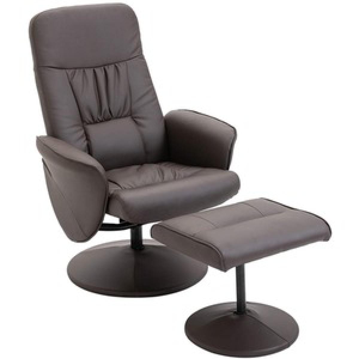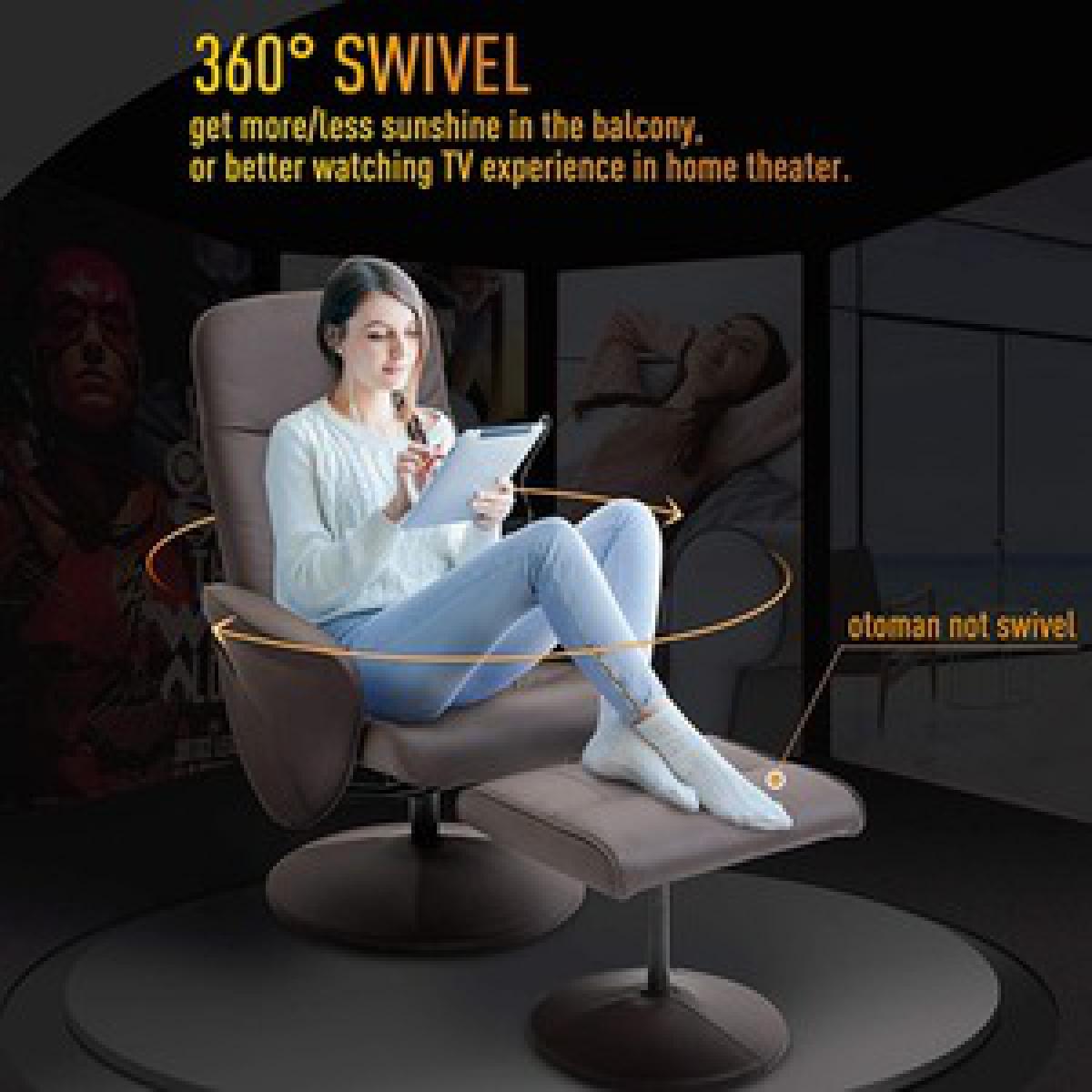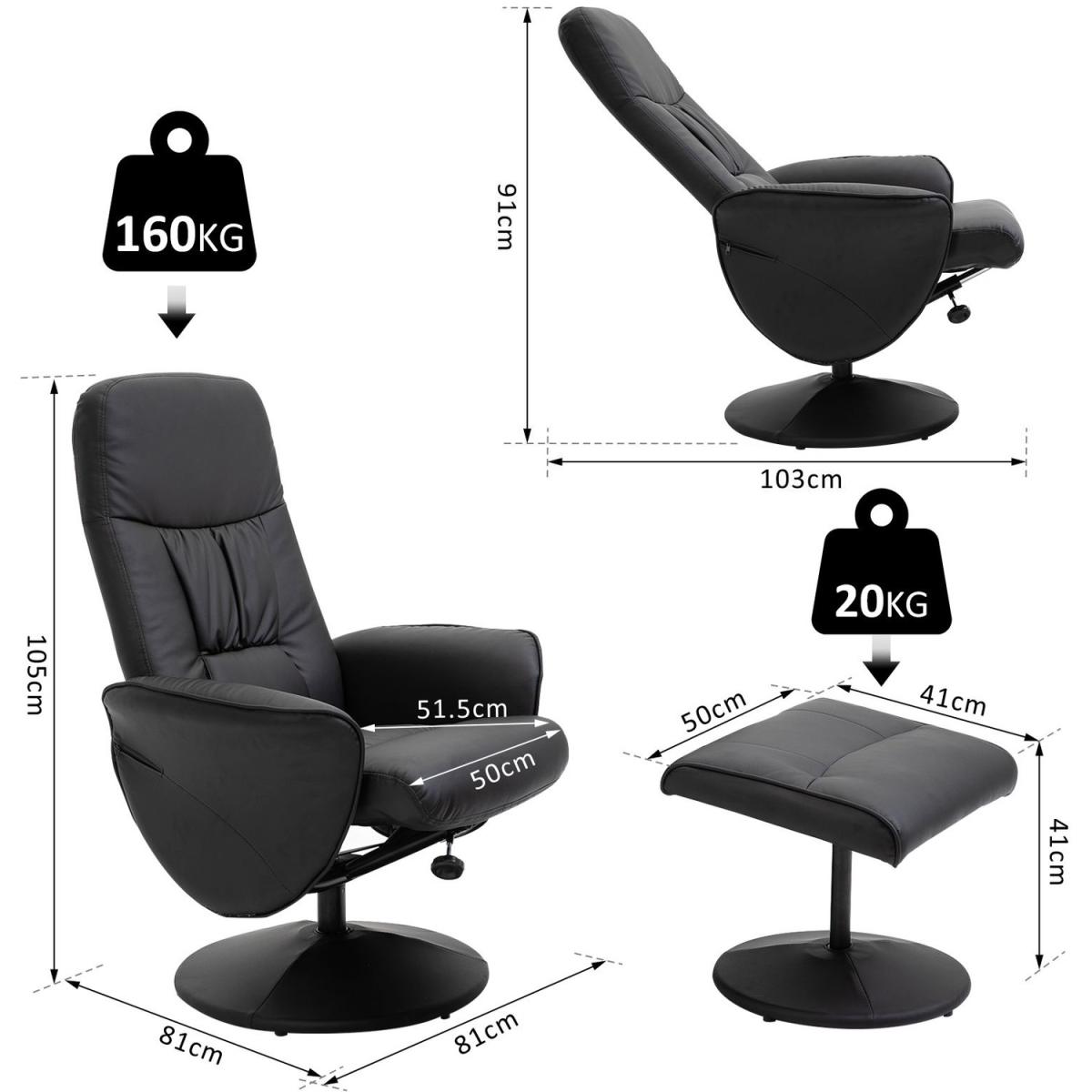 Bring supreme comfort into your home and office with this brown recliner and footstool duo from HOMCOM. Made using a metal frame for reliability and strength, the armchair is crafted into a wide-fitting design that features a high slanted back for posture support, all-over padding for prolonged comfort, curved armrests and PU leather upholstery for a sleek and easy-to-maintain finish. Reclining up to 135 degrees for the perfect place to take a rest, it is finished with a 360 degrees swivel base to move easily from side to side and the matching footstool to rest your feet. The perfect addition to your living room, bedroom, attic or conservatory.