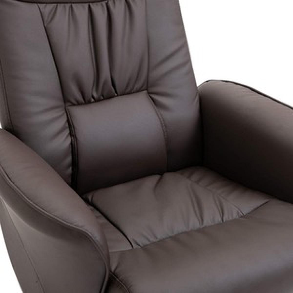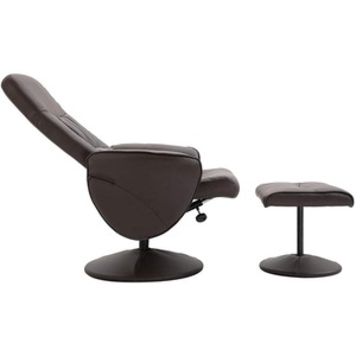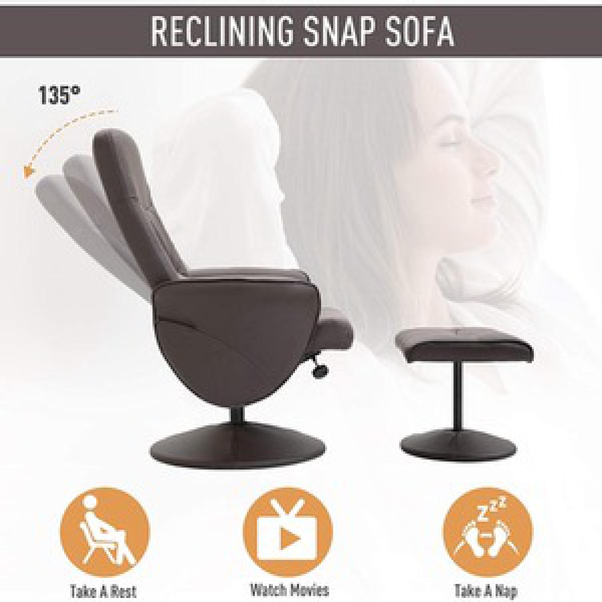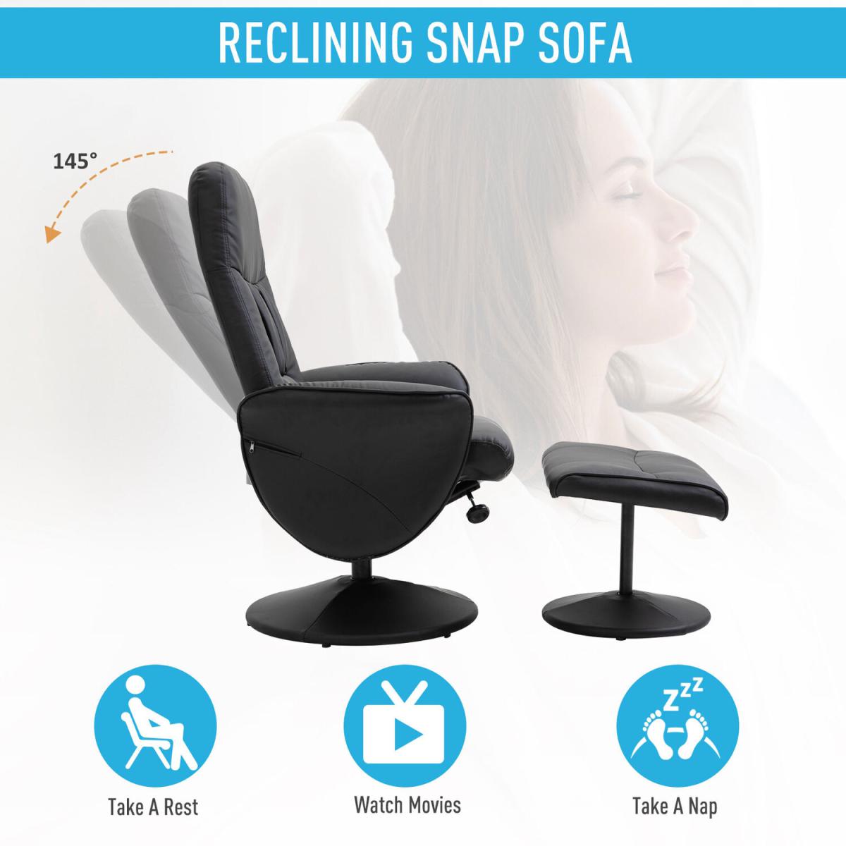 Bring supreme comfort into your home and office with this brown recliner and footstool duo from HOMCOM. Made using a metal frame for reliability and strength, the armchair is crafted into a wide-fitting design that features a high slanted back for posture support, all-over padding for prolonged comfort, curved armrests and PU leather upholstery for a sleek and easy-to-maintain finish. Reclining up to 135 degrees for the perfect place to take a rest, it is finished with a 360 degrees swivel base to move easily from side to side and the matching footstool to rest your feet. The perfect addition to your living room, bedroom, attic or conservatory.