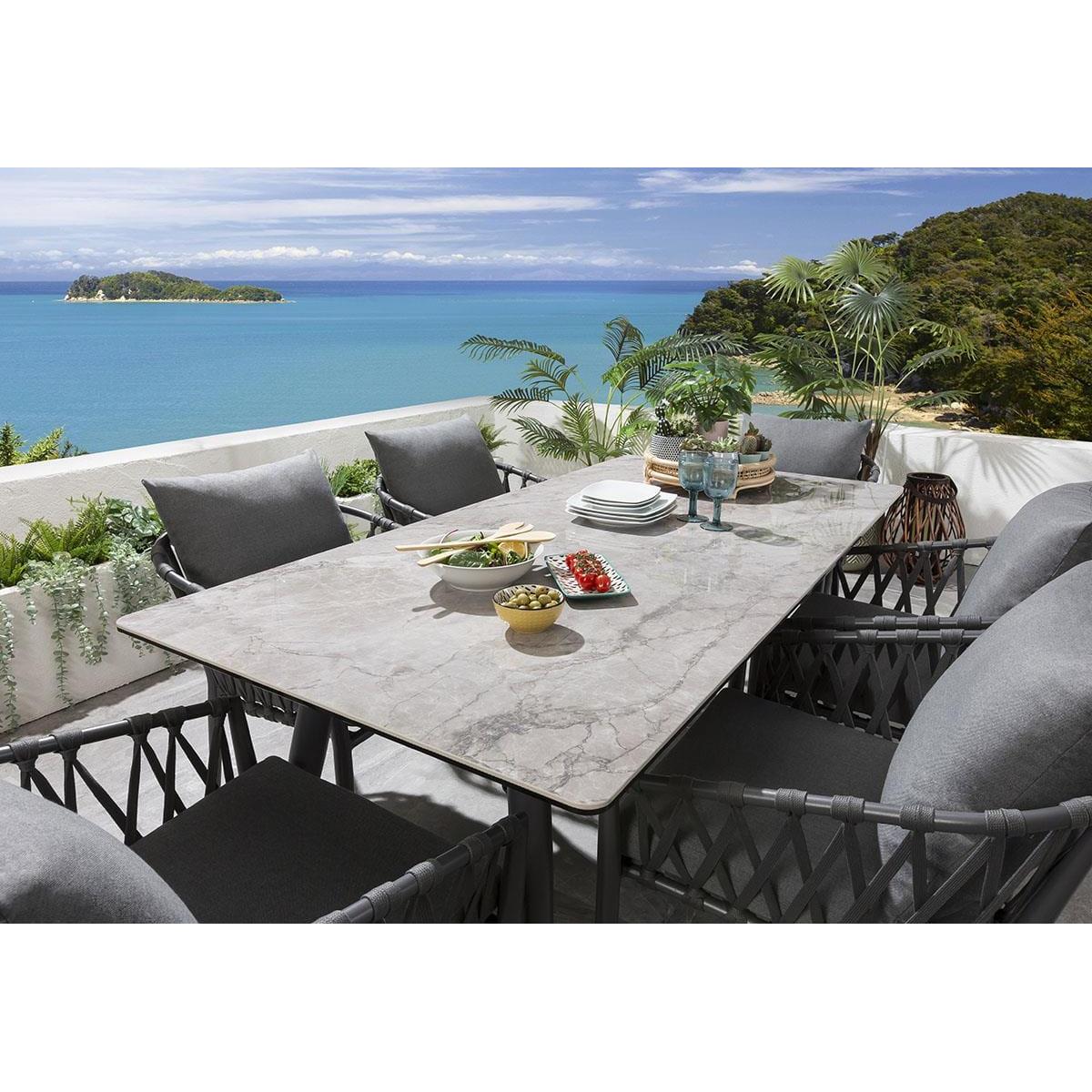Our Ex Display hard-wearing and spacious ceramic 180cm rectangular garden dining table makes a perfect addition to any contemporary, modern or minimalist outdoors, providing enough space for up to six people to enjoy dining in comfort. Made from robust and ultra-durable ceramic in a natural smooth grey marble-effect finish, atop a hard-wearing grey aluminium metal frame - which are set to last for years to come and comes with a free protective winter cover. Included in the set; fabulous all-weather grey rope-back garden dining chairs. The generously padded outdoor chairs are enhanced by a supportive back cushion for an extra layer of luxurious comfort. Our gorgeous rope back garden chairs will make a stunning addition to your outdoor seating area or patio. The garden chairs come complete with our signature luxuriously thick cushioning that offers unbeatable comfort, topped off with rich Grey high-end marine fabric which has amazing resilience to colour fading and damage caused by extreme weather conditions. Expertly crafted aluminium frames are highly durable, complemented by clean lines that lend contemporary style. It is robust and weather-resistant for outdoor use & the super cushioned seating offers comfortable support that's shower-resistant, but we advise that cushions are stored when not in use. W180cm D90cm H73cm 6 Seater Garden Dining Set ExDisplay - In very good condition.