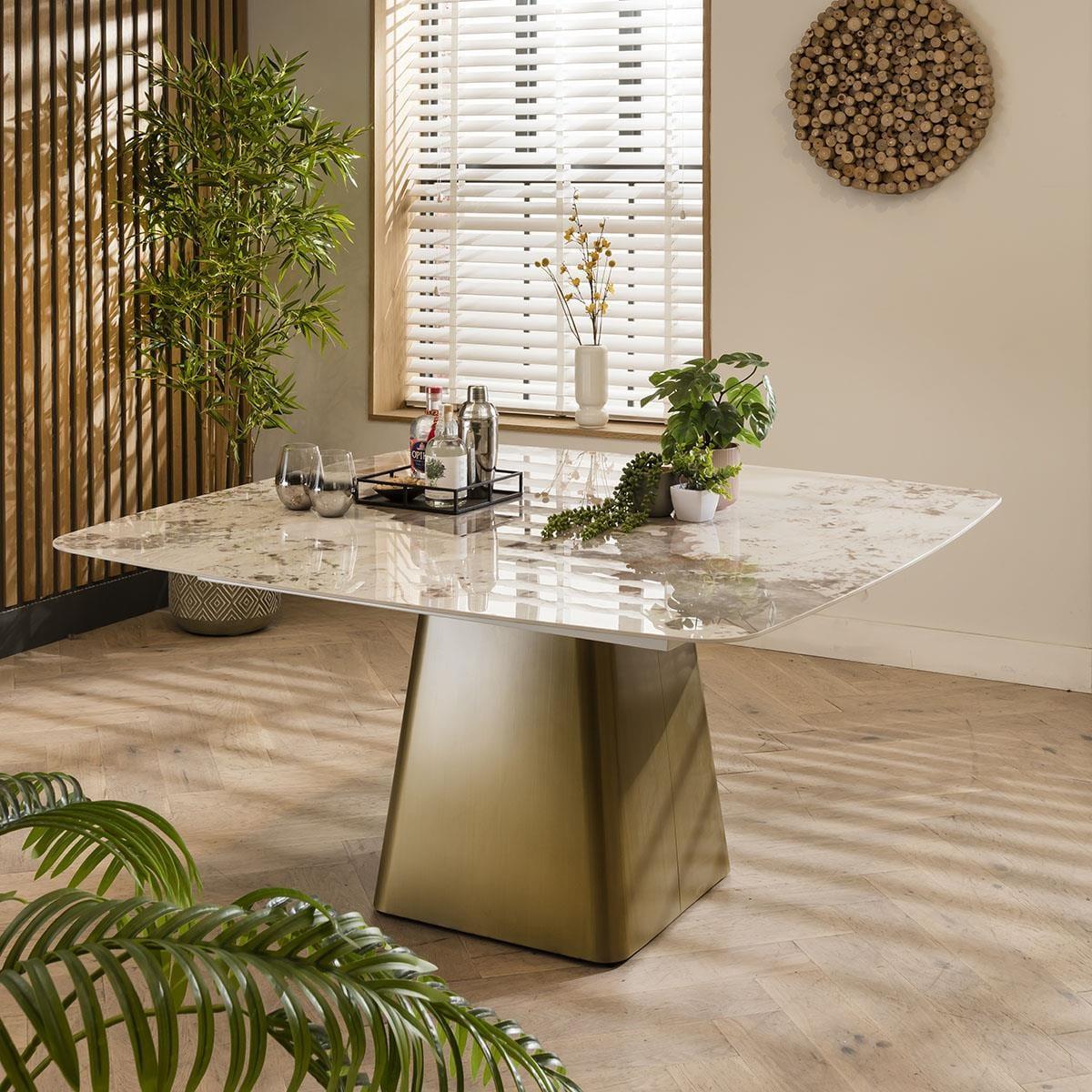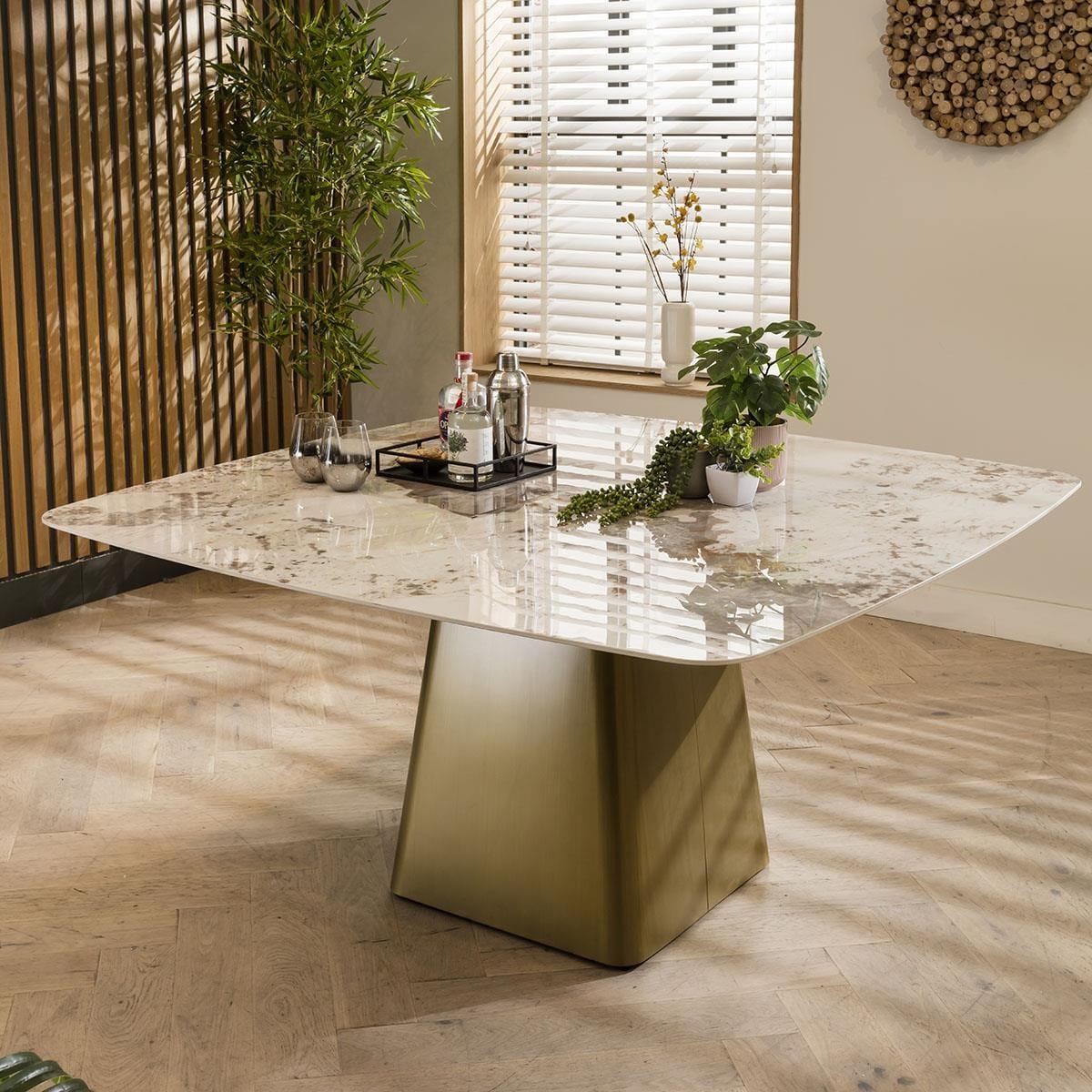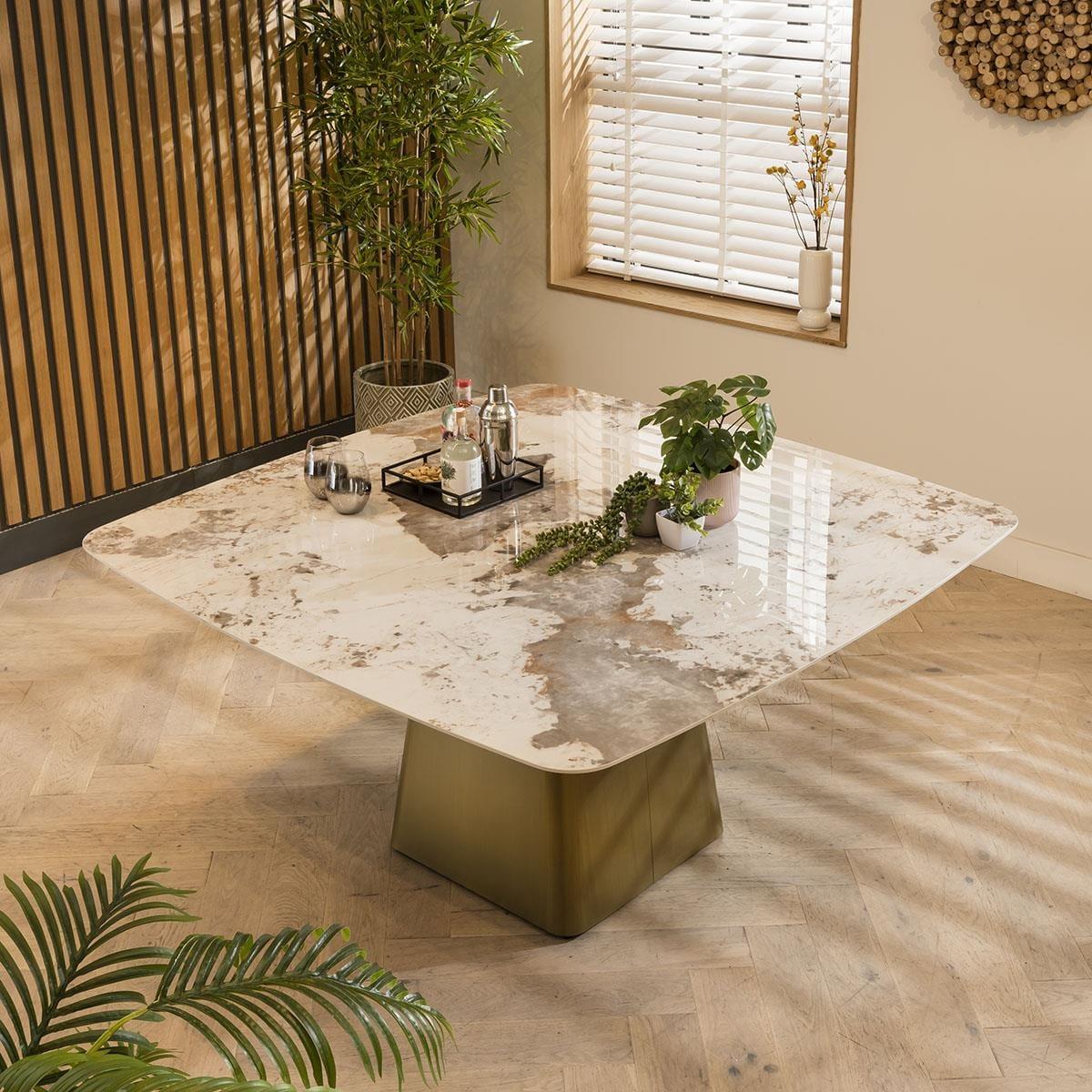 ExDisplay Olympia 150cm square dining table is crafted with a ceramic table top, the dining table boasts remarkable scratch, stain, and heat resistance, ensuring enduring beauty for years to come. The 8 seater dining table features an elegant cream marble effect finish and pedestal metal base exude sophistication and luxury. Seating up to 8 people comfortably, this square dining table is designed to foster memorable gatherings and intimate family meals. The table's pedestal base features a sturdy metal construction with a brushed bronze finish, adding a touch of opulence and stability. The combination of ceramic and metal not only enhances the table's longevity but also imparts a modern, upscale appeal to your dining area. Whether it's casual brunches or formal dinners, this dining table offers a versatile canvas for your culinary adventures. The 150cm square surface provides ample space for dining essentials, making it an ideal choice for those who appreciate both style and substance. Elevate your dining experience with this ceramic-topped masterpiece and create lasting memories around a table that's as beautiful as it is durable. PLEASE NOTE THIS IS AN EXDISPLAY TABLE AND DOES CARRY SOME SMALL IMPERFECTIONS. EXAMPLE OF THESE ARE SHOWN IN THE LAST TWO IMAGES. W150cm D150cm H75cm Ceramic is scratch, stain and heat resistant 8 Seater Square Dining Table