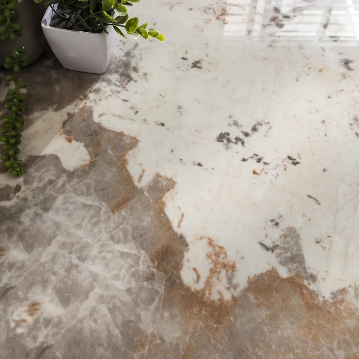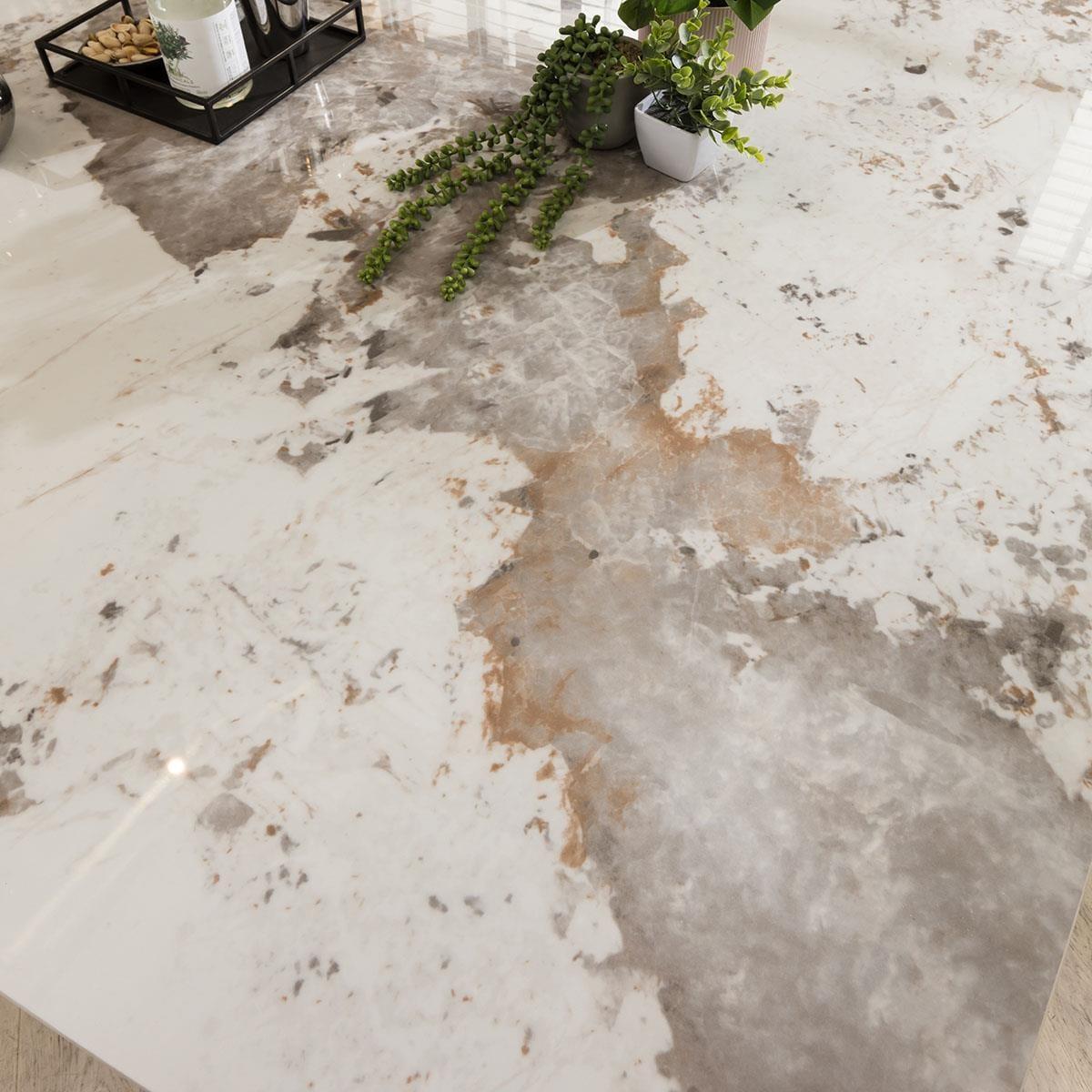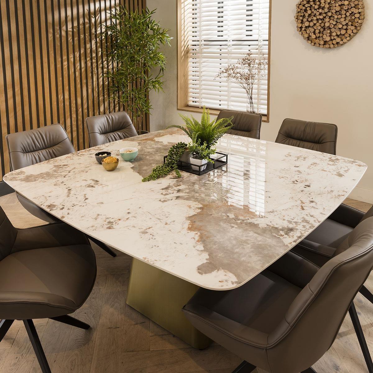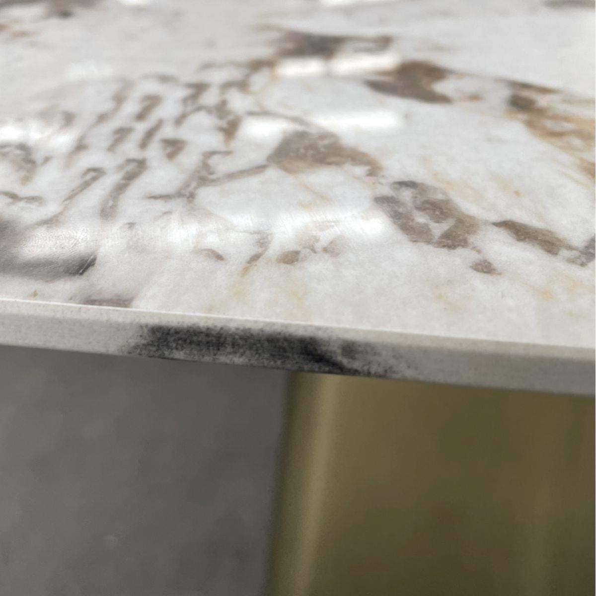 ExDisplay Olympia 150cm square dining table is crafted with a ceramic table top, the dining table boasts remarkable scratch, stain, and heat resistance, ensuring enduring beauty for years to come. The 8 seater dining table features an elegant cream marble effect finish and pedestal metal base exude sophistication and luxury. Seating up to 8 people comfortably, this square dining table is designed to foster memorable gatherings and intimate family meals. The table's pedestal base features a sturdy metal construction with a brushed bronze finish, adding a touch of opulence and stability. The combination of ceramic and metal not only enhances the table's longevity but also imparts a modern, upscale appeal to your dining area. Whether it's casual brunches or formal dinners, this dining table offers a versatile canvas for your culinary adventures. The 150cm square surface provides ample space for dining essentials, making it an ideal choice for those who appreciate both style and substance. Elevate your dining experience with this ceramic-topped masterpiece and create lasting memories around a table that's as beautiful as it is durable. PLEASE NOTE THIS IS AN EXDISPLAY TABLE AND DOES CARRY SOME SMALL IMPERFECTIONS. EXAMPLE OF THESE ARE SHOWN IN THE LAST TWO IMAGES. W150cm D150cm H75cm Ceramic is scratch, stain and heat resistant 8 Seater Square Dining Table