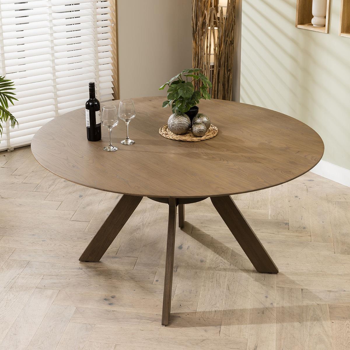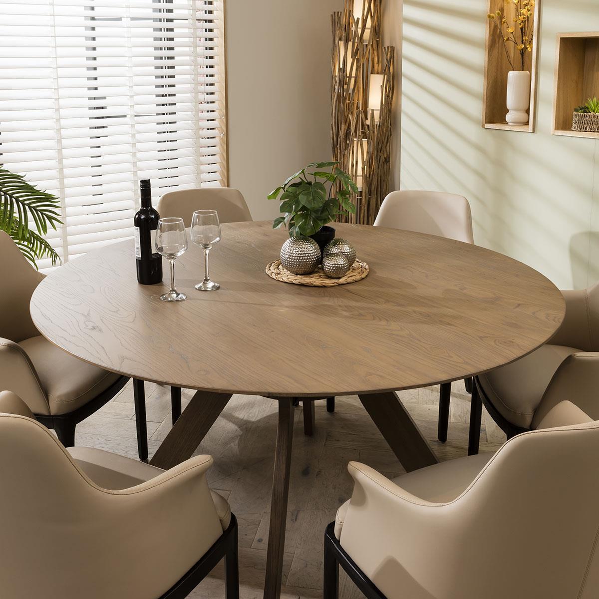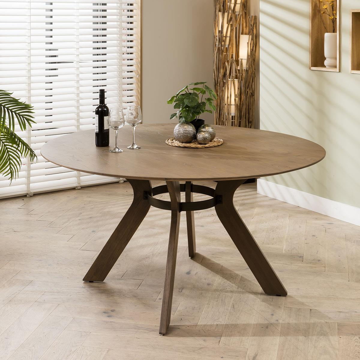 This 150cm round dining table is a contemporary masterpiece. Crafted from high-quality ash wood, the 6 seater wooden dining table boasts a stained finish that enhances its rustic charm. With a reverse chamfer edge on the table top and metal detail on the pedestal, it's not just a dining table; it's a work of art. Seating up to six guests comfortably, this round dining table features a wooden curved 4-point pedestal base that exudes elegance. The base is accentuated by a brass-colored curved metal bracket, which not only adds an industrial touch but also ensures enhanced stability. You'll love how this table blends modern aesthetics with timeless wooden craftsmanship. Perfect for family gatherings and dinner parties, our round dining table invites conversation and connection. Its 150cm size provides ample space for your culinary creations, making every meal an unforgettable experience. Whether you're a fan of classic or contemporary design, this ash wood dining table will be the centerpiece of your dining area. THIS ITEM HAS BEEN ON DISPLAY IN OUR SHOWROOM AND SO MAY HAVE SOME SIGNS OF WEAR AND TEAR BUT NOTHING THAT IS APPARENT ON INSPECTION. W150cm D150cm H76cm Wooden Round Dining Table with Stained finish THIS IS AN EXDISPLAY ITEM