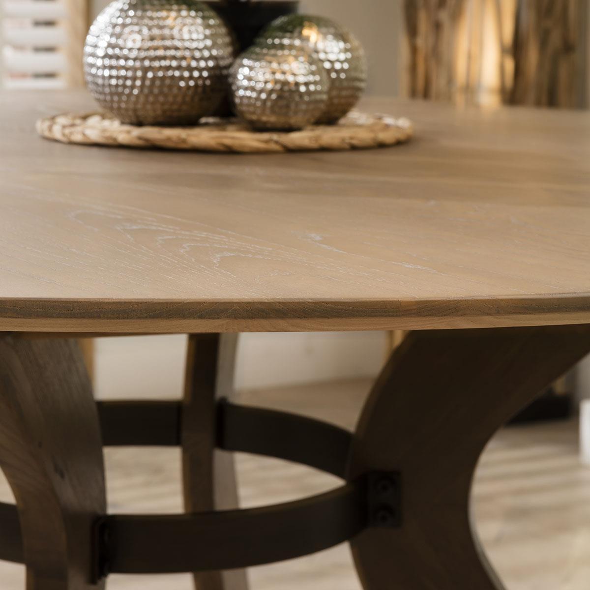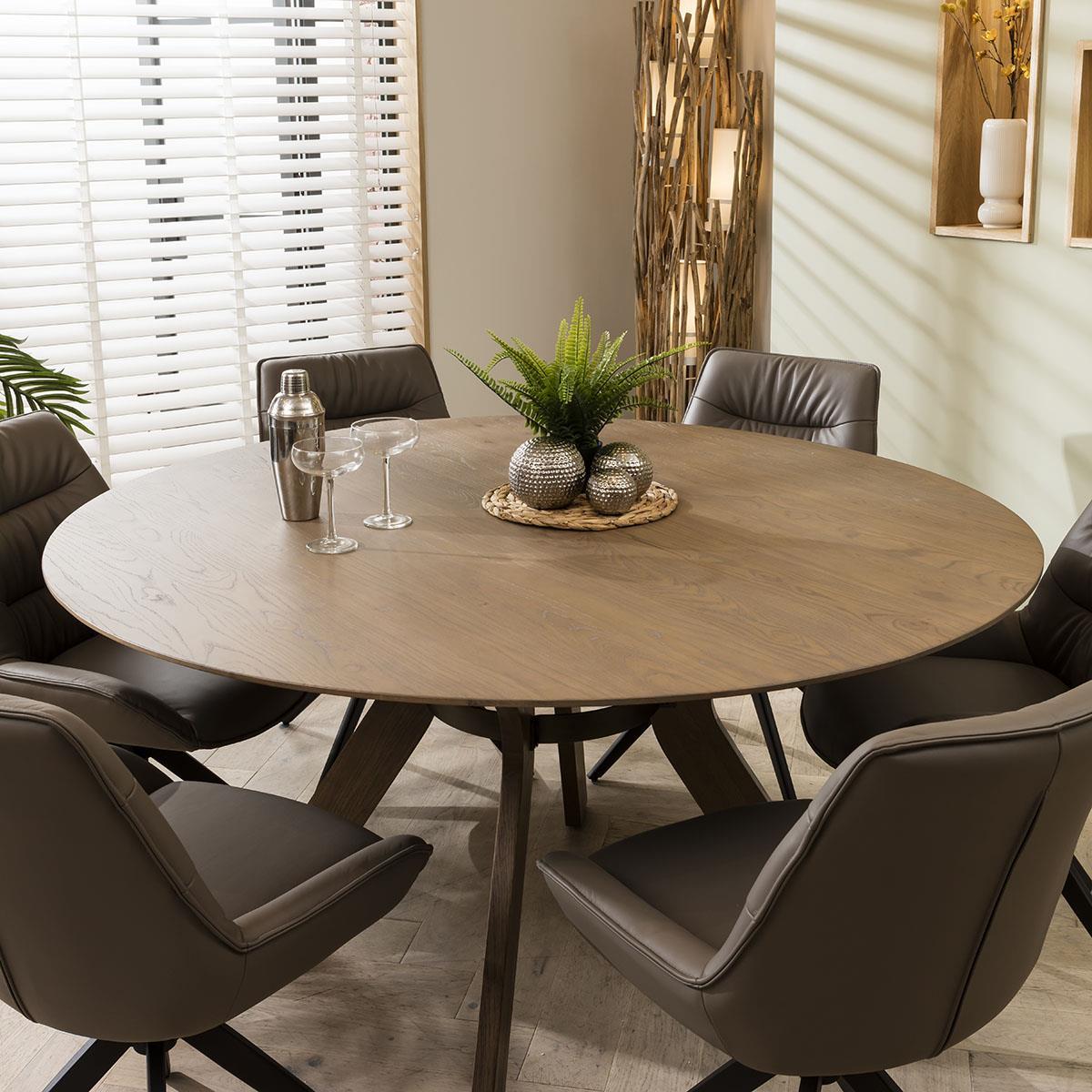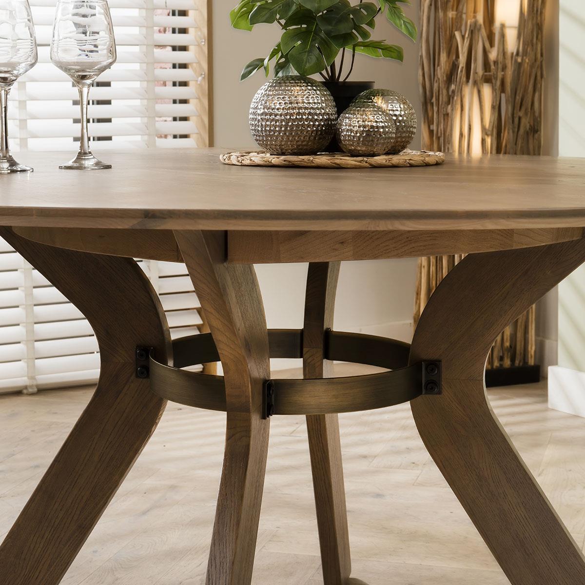 This 150cm round dining table is a contemporary masterpiece. Crafted from high-quality ash wood, the 6 seater wooden dining table boasts a stained finish that enhances its rustic charm. With a reverse chamfer edge on the table top and metal detail on the pedestal, it's not just a dining table; it's a work of art. Seating up to six guests comfortably, this round dining table features a wooden curved 4-point pedestal base that exudes elegance. The base is accentuated by a brass-colored curved metal bracket, which not only adds an industrial touch but also ensures enhanced stability. You'll love how this table blends modern aesthetics with timeless wooden craftsmanship. Perfect for family gatherings and dinner parties, our round dining table invites conversation and connection. Its 150cm size provides ample space for your culinary creations, making every meal an unforgettable experience. Whether you're a fan of classic or contemporary design, this ash wood dining table will be the centerpiece of your dining area. THIS ITEM HAS BEEN ON DISPLAY IN OUR SHOWROOM AND SO MAY HAVE SOME SIGNS OF WEAR AND TEAR BUT NOTHING THAT IS APPARENT ON INSPECTION. W150cm D150cm H76cm Wooden Round Dining Table with Stained finish THIS IS AN EXDISPLAY ITEM