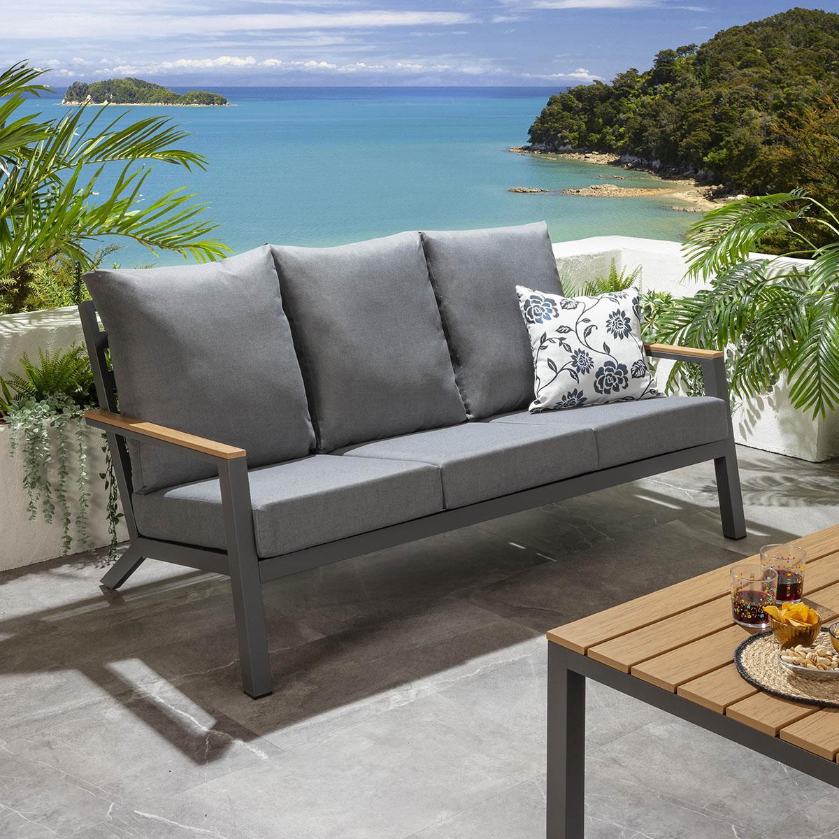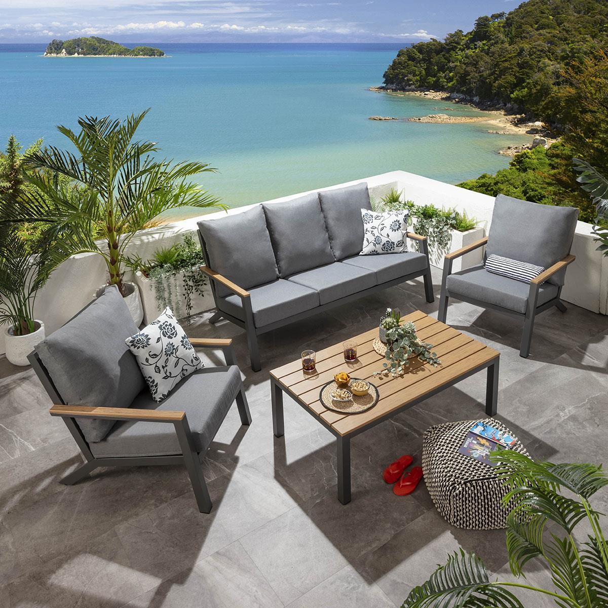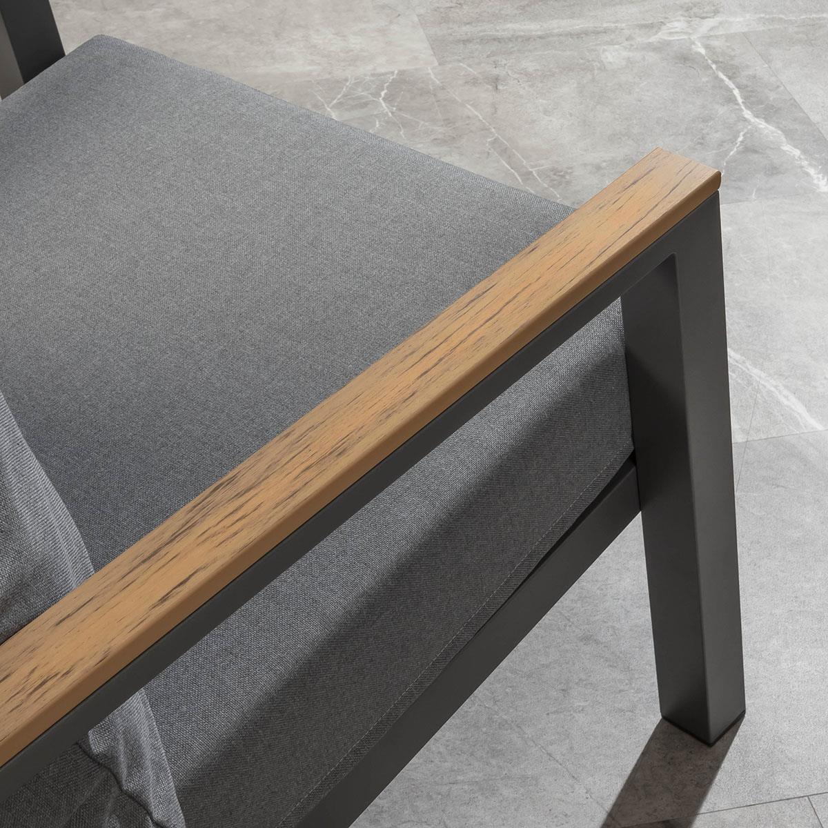 This metal garden sofa set includes a three-seater sofa, 2 armchairs, and a coffee table, with aluminium frames finished in a premium grey paint. Crafted with luxury foam and soft Dacron inserts, the sleek grey outdoor fabric cushions ensure comfort and style. Weather covers are included for the entire patio set. Designed with a modern, relaxed, and laid-back aesthetic, the Darwin aluminium sofa set elevates any outdoor space. The premium grey paint finish exudes sophistication, while the contrasting polywood armrests add a touch of natural elegance. The sleek lines and minimalistic design create a contemporary ambiance, perfect for lounging or entertaining guests in style. The cushions are crafted with the utmost attention to comfort and durability. Made with luxury foam and soft Dacron inserts, they provide plush support for hours of relaxation. Upholstered in a sleek grey outdoor fabric, the cushions seamlessly complement the modern design of the sofa set, enhancing both comfort and aesthetic appeal. THIS ITEM HAS BEEN ON DISPLAY IN OUR OUTDOOR SHOWROOM AND SO MAY HAVE SOME SIGNS OF WEAR AND TEAR BUT NOTHING THAT IS APPARENT ON INSPECTION. Sofa Size W175cm D99cm H80cm Seat Height 44cm Chair Size W80cm D99cm H80cm Seat Height 44cm Coffee Table Size W120cm D70cm H43cm