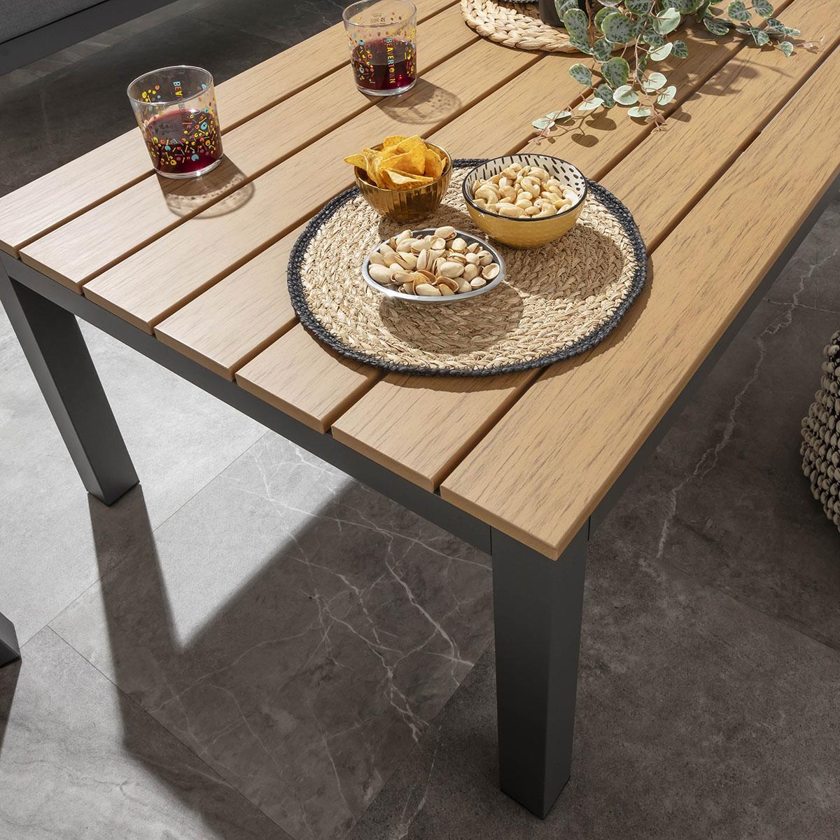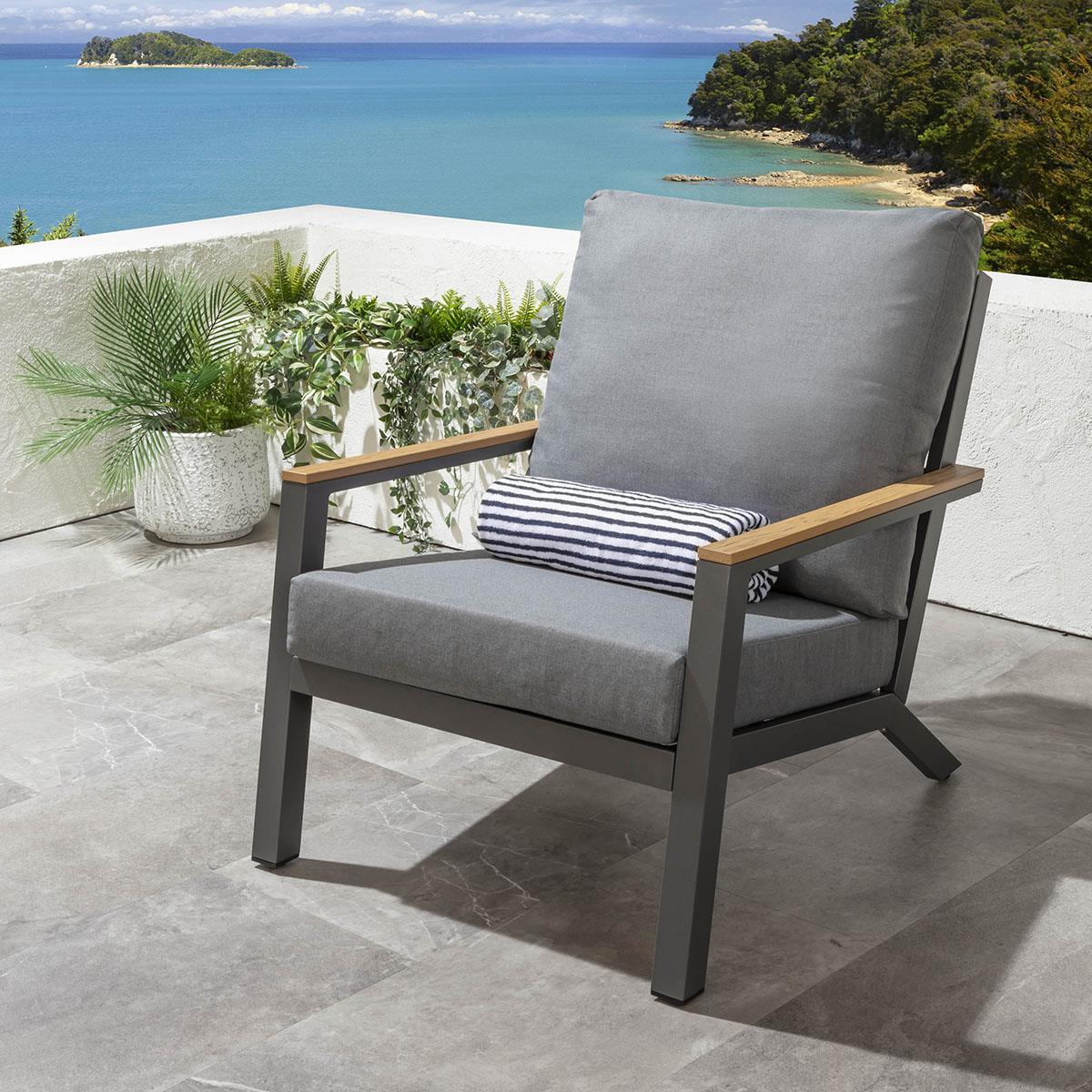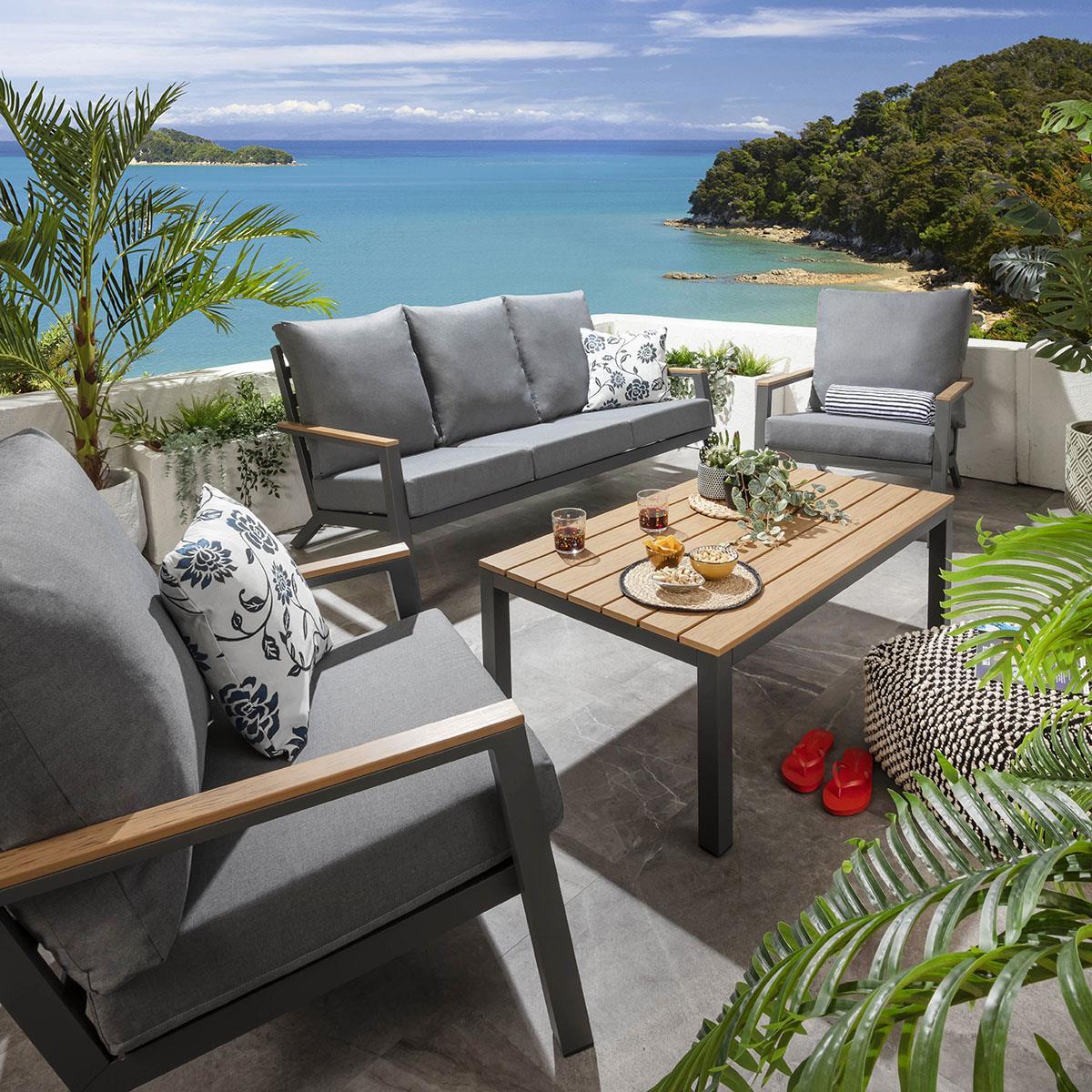 This metal garden sofa set includes a three-seater sofa, 2 armchairs, and a coffee table, with aluminium frames finished in a premium grey paint. Crafted with luxury foam and soft Dacron inserts, the sleek grey outdoor fabric cushions ensure comfort and style. Weather covers are included for the entire patio set. Designed with a modern, relaxed, and laid-back aesthetic, the Darwin aluminium sofa set elevates any outdoor space. The premium grey paint finish exudes sophistication, while the contrasting polywood armrests add a touch of natural elegance. The sleek lines and minimalistic design create a contemporary ambiance, perfect for lounging or entertaining guests in style. The cushions are crafted with the utmost attention to comfort and durability. Made with luxury foam and soft Dacron inserts, they provide plush support for hours of relaxation. Upholstered in a sleek grey outdoor fabric, the cushions seamlessly complement the modern design of the sofa set, enhancing both comfort and aesthetic appeal. THIS ITEM HAS BEEN ON DISPLAY IN OUR OUTDOOR SHOWROOM AND SO MAY HAVE SOME SIGNS OF WEAR AND TEAR BUT NOTHING THAT IS APPARENT ON INSPECTION. Sofa Size W175cm D99cm H80cm Seat Height 44cm Chair Size W80cm D99cm H80cm Seat Height 44cm Coffee Table Size W120cm D70cm H43cm
