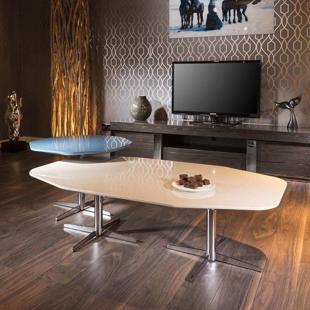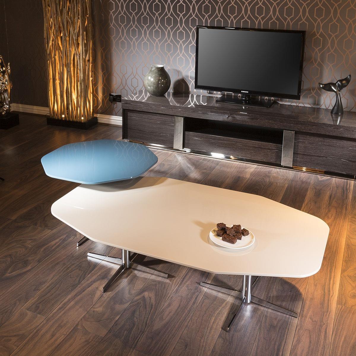 Features polished stainless steel supports and glossy blue finished octagonal top. Superb quality and strength from this unique design. W70cm D70cm H49cm Modern Design Premium Quality Furniture