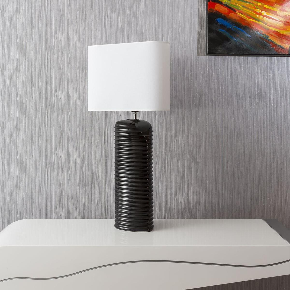 Envy Lighting Modern Designer Tall Table / Bedside Lamp in Gunmetal Grey with a white shade. Stunning ribbed ceramic base with white triangular shaped shade. High end quality is obvious. Simplicity is the key for its beauty and elegance. Exquisite delicate White fabric shade looks like a million dollars. Bulb type E27 1 x 60 watt (not supplied); This is an Ex Display item.