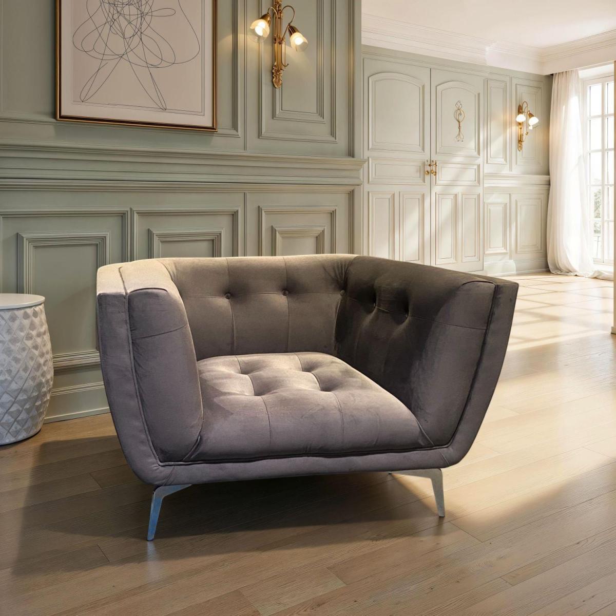 Generously update your decor with this Ex Display Budapest Luxury Velvet Armchair in Grey. Uniquely designed with a striking broad profile, the Budapest chair comes in soft, stain-resistant performance velvet polyester upholstery with a smooth texture, dense foam padding, and elegant button tufting. Sturdily positioned on polished silver stainless steel legs with non-marking foot caps, this accent chair boasts a bountiful living room seating design brimming with possibilities. With ample seat depth and overscaled frame, invite all your guests to sit comfortably in this high back and armrest collection perfect for mid-century, vintage modern, or contemporary decors. If you need more information about this product, use the Live Chat service to speak to the team or send us a message. Spread the cost our with interest-free finance options. Minimum spend applies. W110cm D90cm H74cm Also available as a sofa Premium Quality Furniture