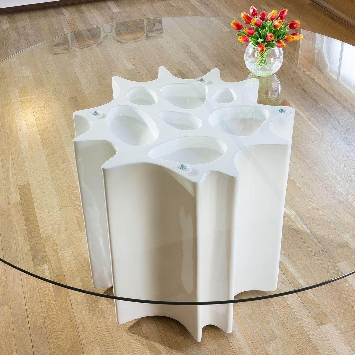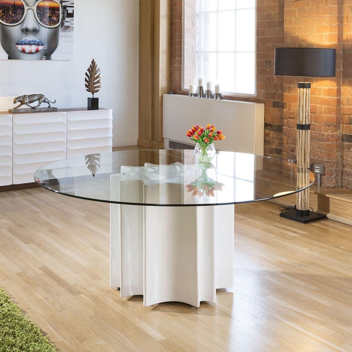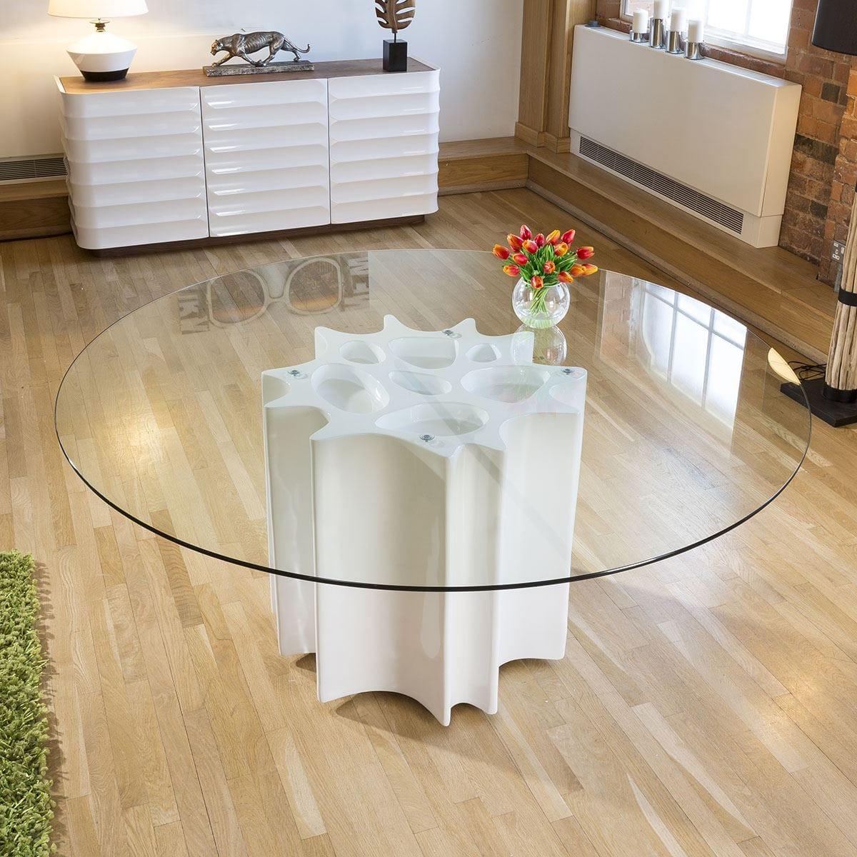 Quatropi's Brand New Stunning Modern 1.8 meter Dining Table. Amazing sculptured piece finished in glossy white, Topped with a 1.8m Clear Glass Giving This Table a Minimalistic Look As Well As a Sculptural Feel From The Middle Stem. Wonderful stunning build quality. W180cm D180cm H75cm Modern Design Premium Quality Furniture