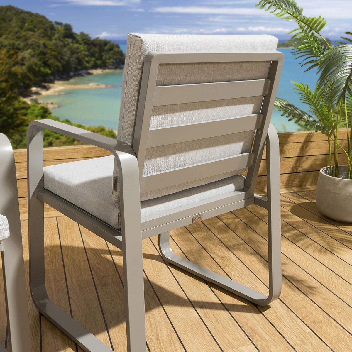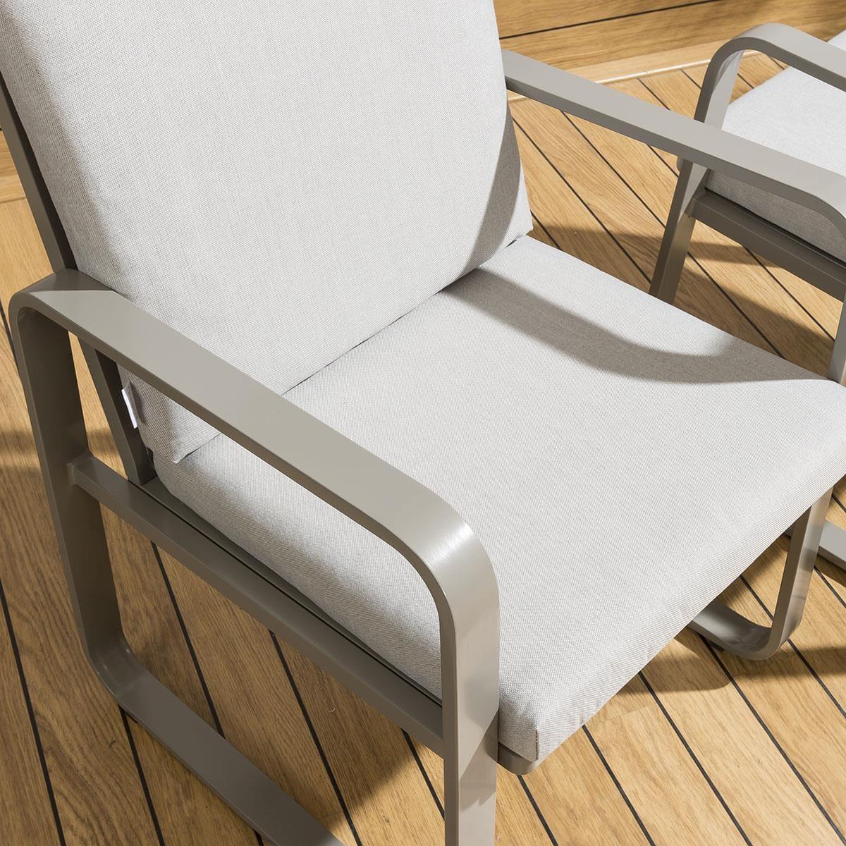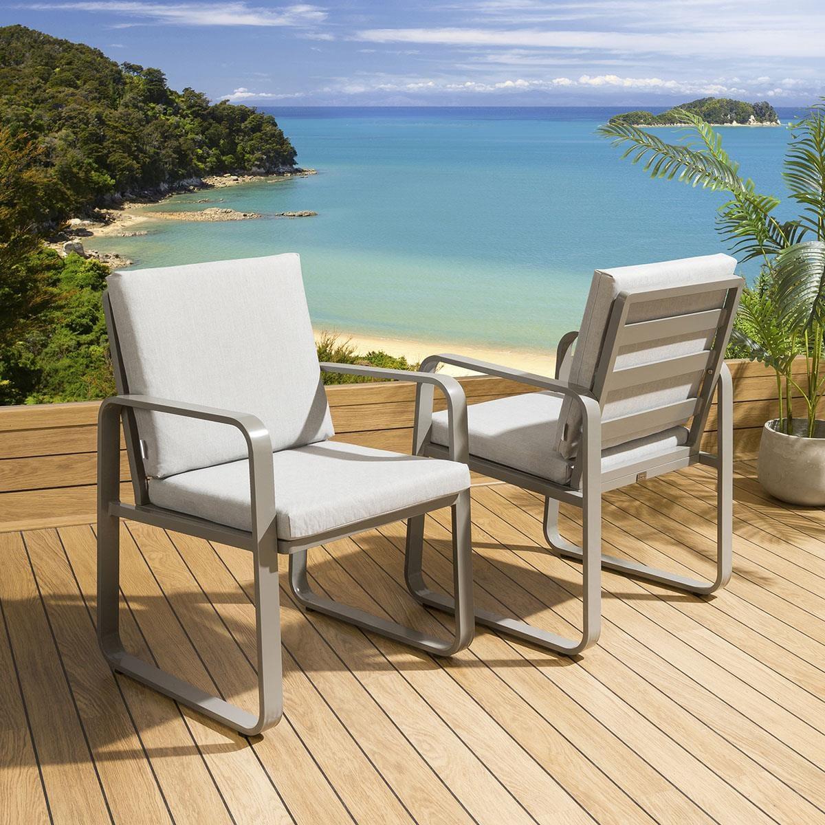 Reinvent your garden with this modern-design chair set. Made from robust metal, it features trendy, minimalist grey framework that is sturdy and weather-proof. Optimal seated comfort is reached thanks to generously padded back and seat cushions. Pair the garden chairs with the matching Freddy Dining Table and create an inviting bistro area in your garden. The garden chairs come complete with our signature luxuriously thick cushioning that offers unbeatable comfort, topped off with rich silver high-end marine fabric which has amazing resilience to colour fading and damage caused by extreme weather conditions. The aluminium framework is extremely weatherproof and can be left outside all year round. Plus, the furniture comes with padded cushions included. These cushions are showerproof but we do recommend storing them indoors in heavy downpours and when not in use. Seat Height: 49cm Set of 2 Metal Garden Dining Chairs in Grey THESE DINING CHAIRS ARE EX DISPLAY SO MAY SHOW SLIGHT SIGNS OF USE AND NOT BE IN THE ORIGINAL PACKAGING THESE DINING CHAIRS ARE EX DISPLAY SO MAY SHOW SLIGHT SIGNS OF USE AND NOT BE IN THE ORIGINAL PACKAGING