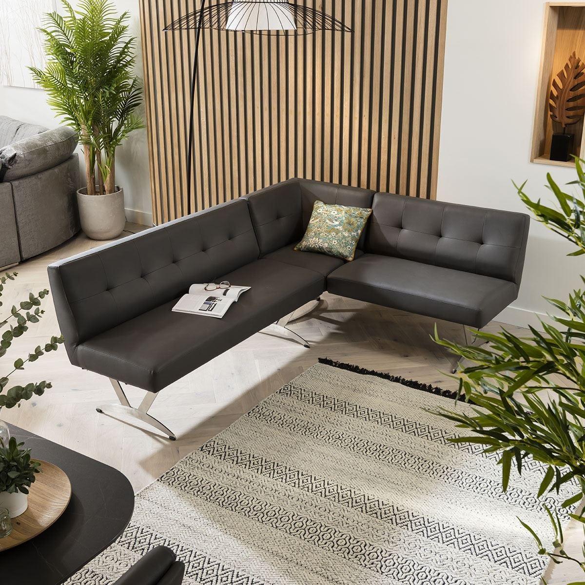 The Taylor Corner Dining Bench is a sleek and versatile seating solution, designed to enhance your dining space with style. Seating up to 5 people, this dining bench seat is perfect for social gatherings. Its comfortable cushioning and easy-clean premium dark grey faux leather will leave your guests impressed. The dining bench is perfect for a minimalist modern setting and a perfect addition to an industrial, modern, or contemporary-inspired interior. Complete with uniquely designed brushed stainless steel legs, this chair will add a striking impact to any dining space. The Taylor collection features dining chairs and matching faux leather benches for comfortable contemporary style dining. EXDISPLAY ITEM, SLIGHT MARKS, IN ORIGINAL PACKAGING W217cm D168cm H83cm Seat Height 49cm, Seat Depth 47cm Left or Right Hand Corner Dining Bench in Mint Green