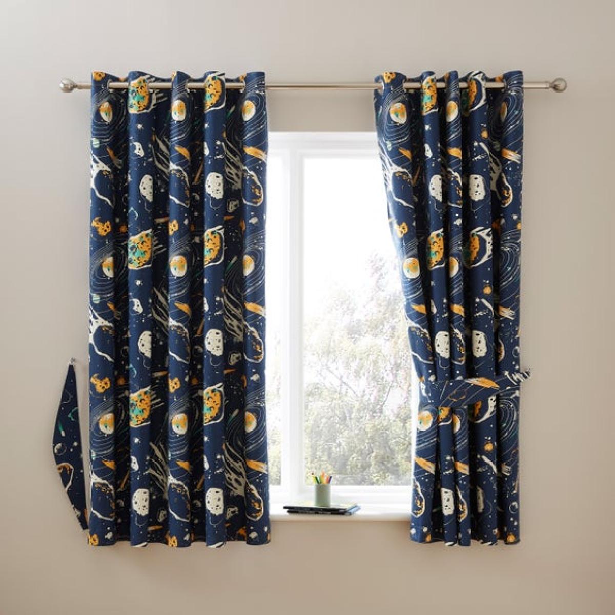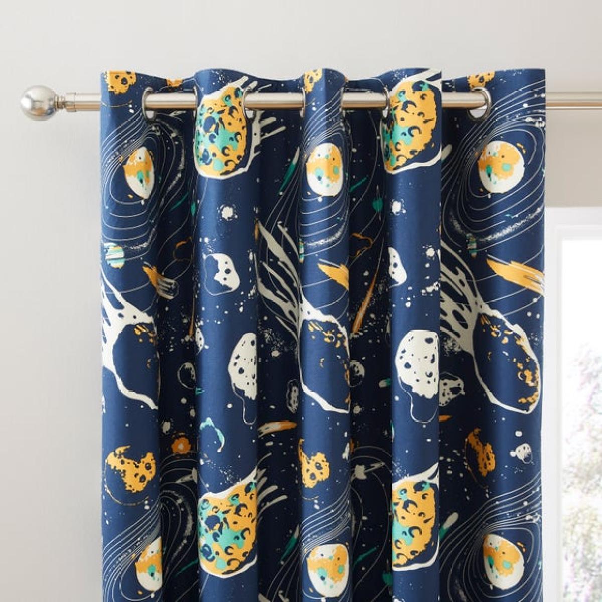 **In collaboration with the Natural History Museum** * Includes 2 x curtain panels * Crisp and breathable 100% Cotton Composition * Blackout Lining * Uplifting space themed design * Eyelet header * Coordinating items available Turn bedtime into a stellar adventure with the Explore Space Curtains. Expertly crafted from 100% breathable cotton and fully lined with blackout fabric, these curtains are designed to block out unwanted light for a peaceful, uninterrupted sleep. The vibrant space-themed print, featuring stars, planets, and shooting meteors, brings a playful yet educational touch to any child’s room. Finished with a sleek eyelet header for effortless hanging and soft folds, this set of two panels also includes matching tiebacks for a neat, tailored look. Complete the galactic theme by pairing with the coordinating duvet cover and fitted sheet.**Natural History Museum x Dunelm**Geologists don’t just study rocks from Earth. They study pieces of asteroids, the Moon, and Mars that have been knocked off the surface by impacts, or that have been collected by human and robotic missions. They use this information to understand how the Solar System evolved since the birth of the Sun, including questioning how planets form, if there could be life on Mars or elsewhere, or even how the water in our oceans arrived on Earth. Our planet is part of a much bigger picture – a cosmos that has fascinated humans since we first gazed at the night sky. Scientists at the Natural History Museum are working at the forefront of space research learn more about the universe and our place within it. © The Trustees of the Natural History Museum, London 2025. All Rights Reserved.