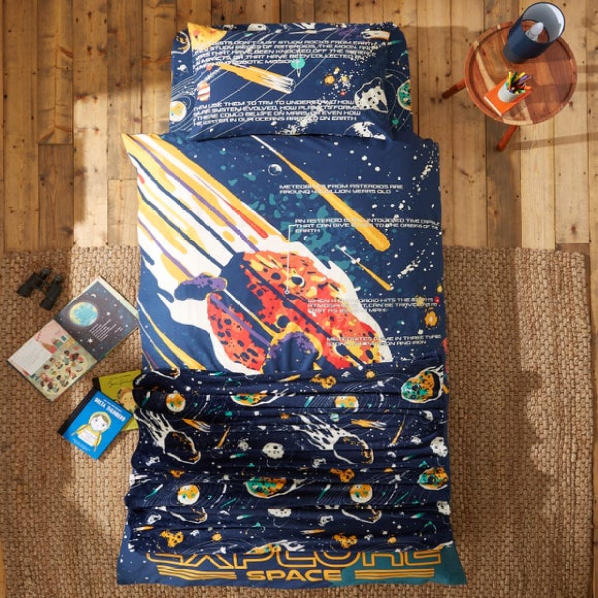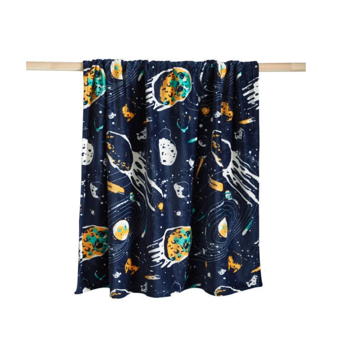 **In collaboration with the Natural History Museum** * Soft and cosy polyester blanket * Uplifting space themed design * Machine washable * Coordinating items available Wrap your little one in out-of-this-world comfort with the Explore Space Blanket. Made from soft and cosy polyester, this lightweight layer is perfect for snuggling up during storytime, nap time, or chilly evenings. Featuring a vibrant space-themed print filled with meteors, stars, and distant planets, it sparks imagination and adventure while adding a playful touch to their bedroom. Easy to care for and machine washable, this blanket pairs perfectly with the matching duvet cover, fitted sheet, and curtains for a fully coordinated space-inspired look.**Natural History Museum x Dunelm**Geologists don’t just study rocks from Earth. They study pieces of asteroids, the Moon, and Mars that have been knocked off the surface by impacts, or that have been collected by human and robotic missions. They use this information to understand how the Solar System evolved since the birth of the Sun, including questioning how planets form, if there could be life on Mars or elsewhere, or even how the water in our oceans arrived on Earth. Our planet is part of a much bigger picture – a cosmos that has fascinated humans since we first gazed at the night sky. Scientists at the Natural History Museum are working at the forefront of space research learn more about the universe and our place within it. © The Trustees of the Natural History Museum, London 2025. All Rights Reserved.