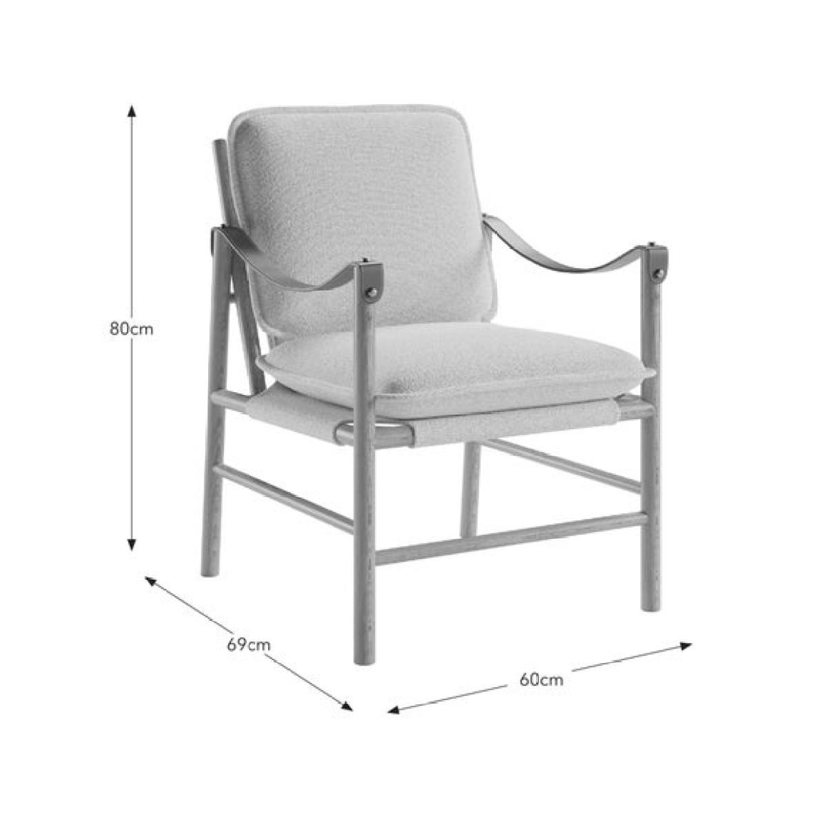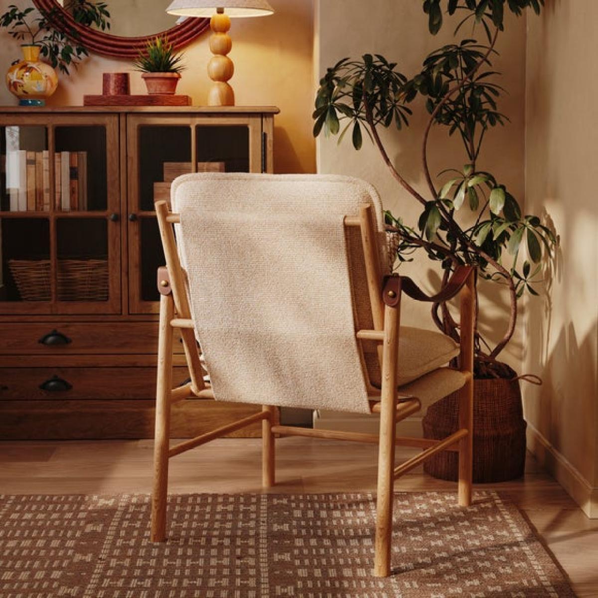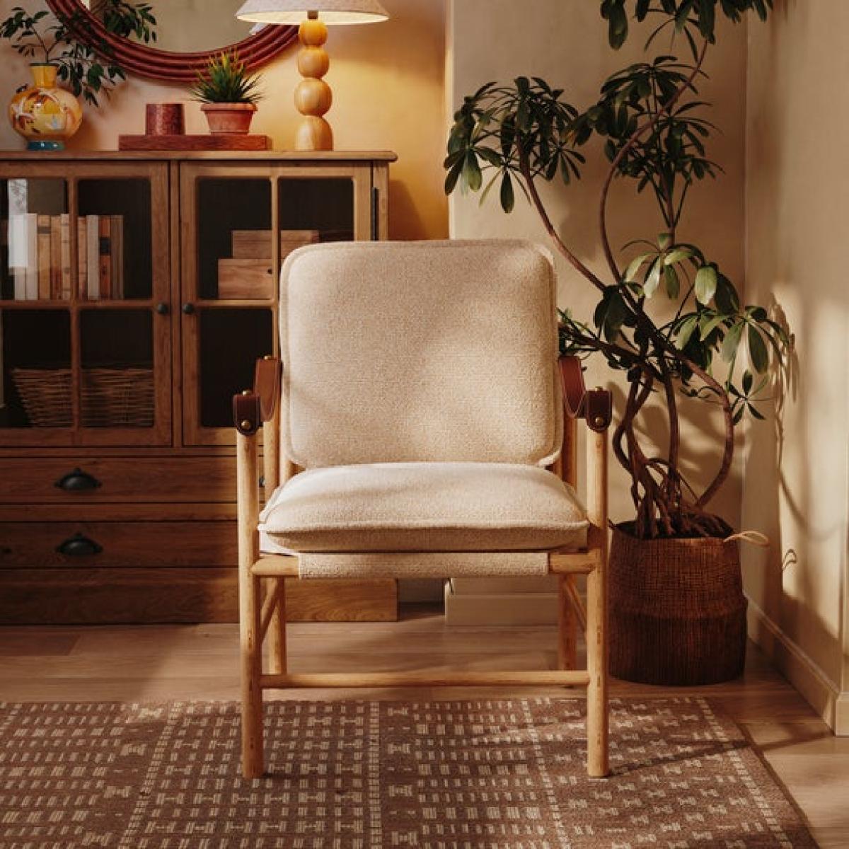 * Modern accent chair * Wooden frame * Arrives assembled The Explorer accent chair pairs a sturdy wooden frame with soft boucle upholstery, striking a balance between structure and softness. Its gently reclined back and generously padded seat offer a relaxed sit, while the natural wood finish adds warmth and timeless appeal. The textured boucle fabric lends a modern, tactile element, making this chair as stylish as it is comfortable.