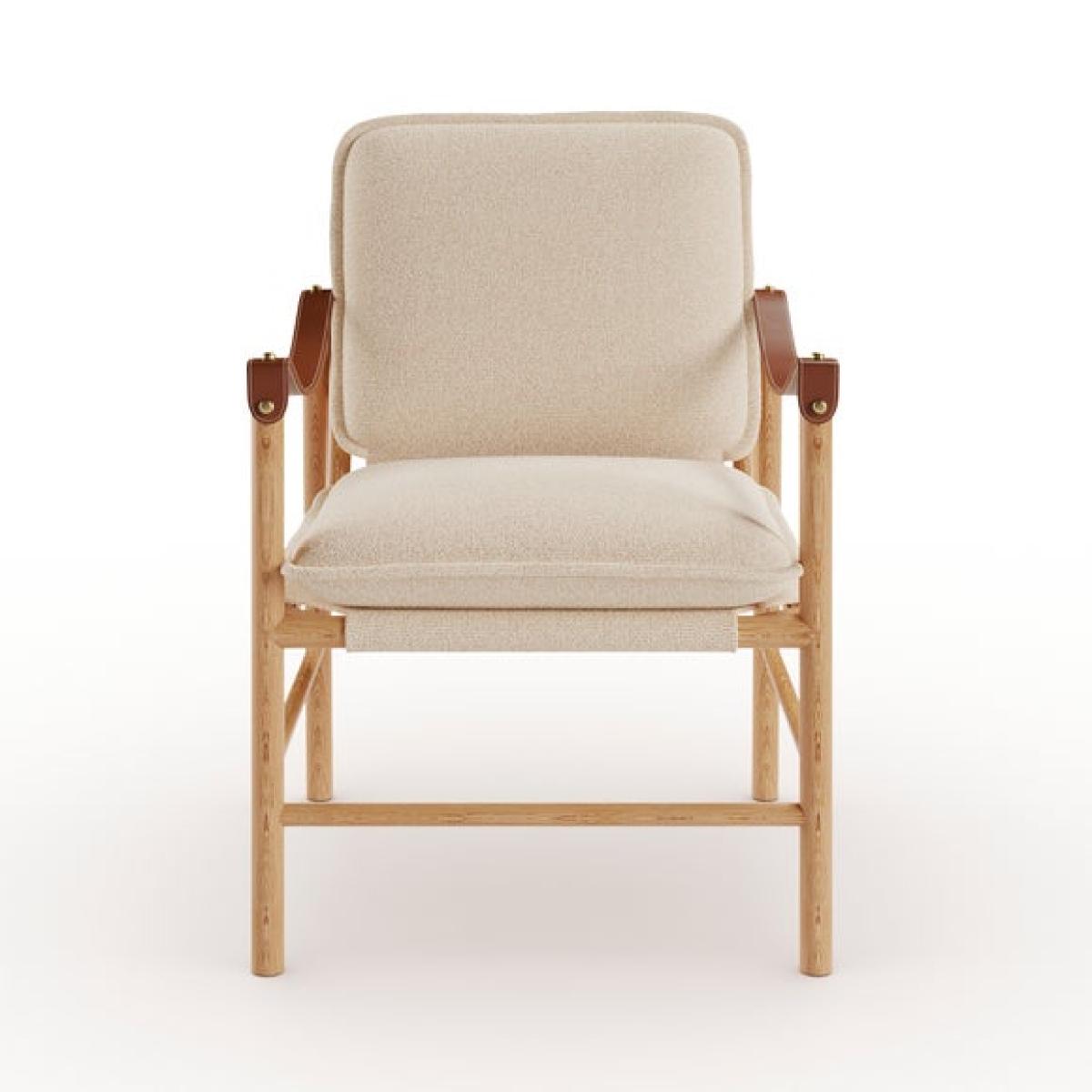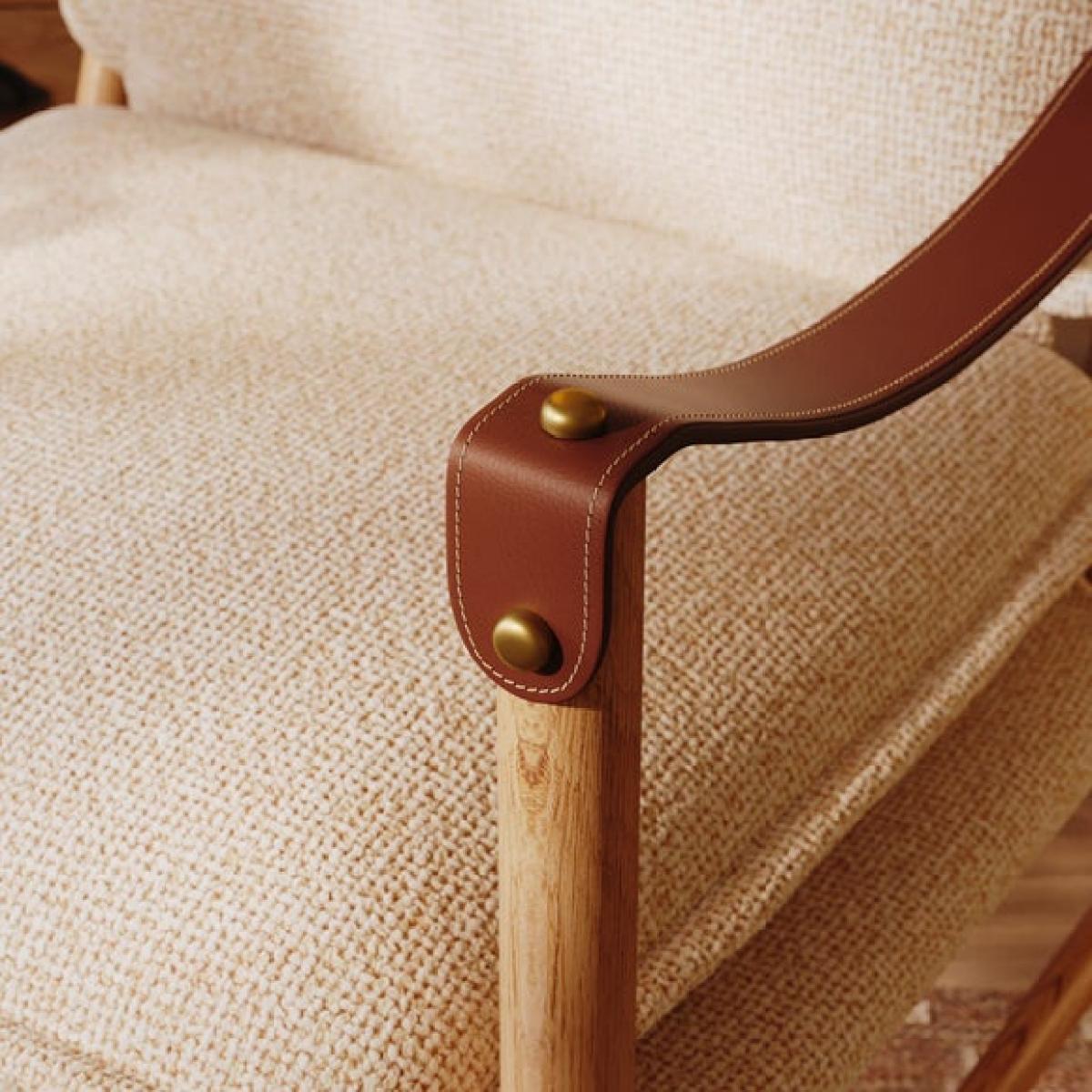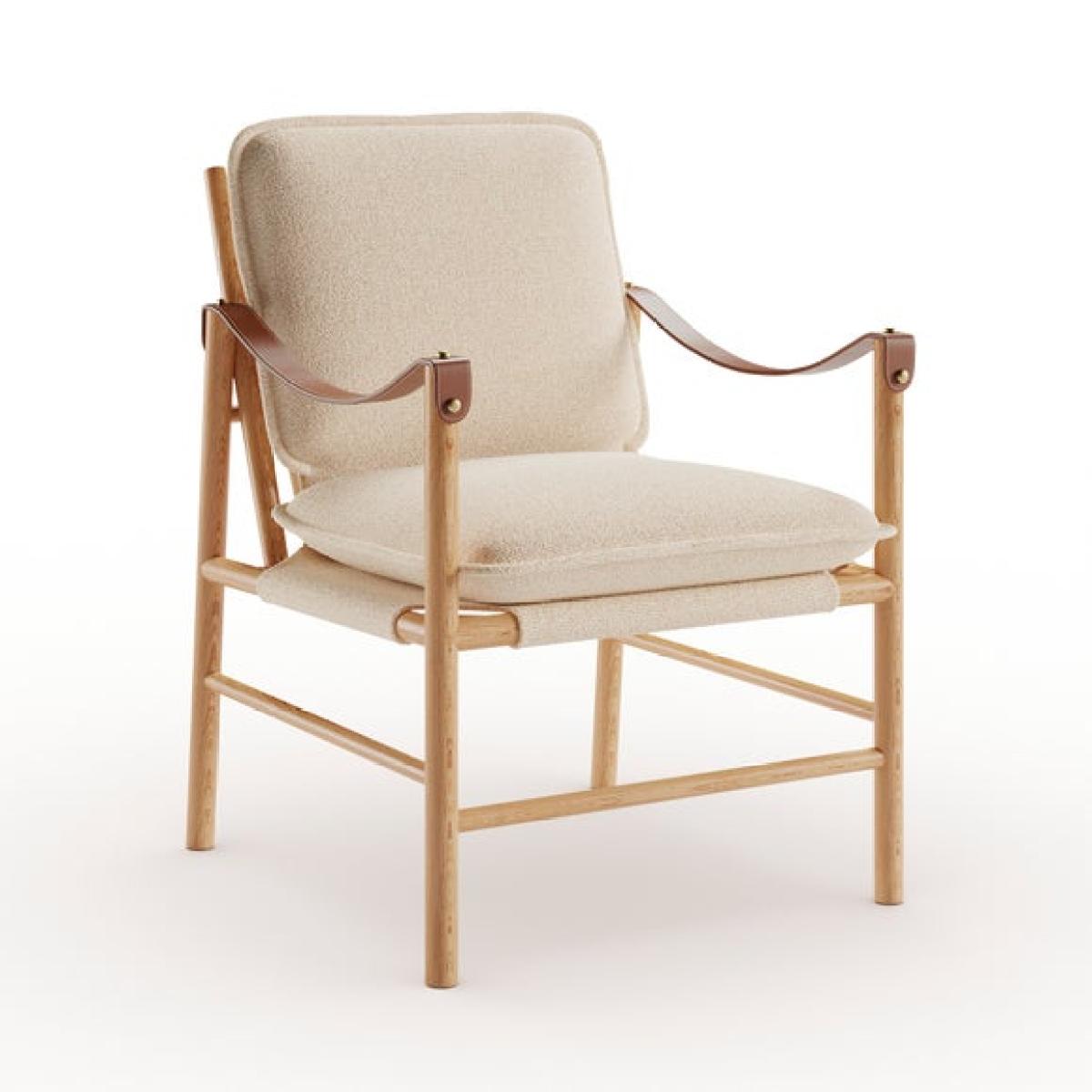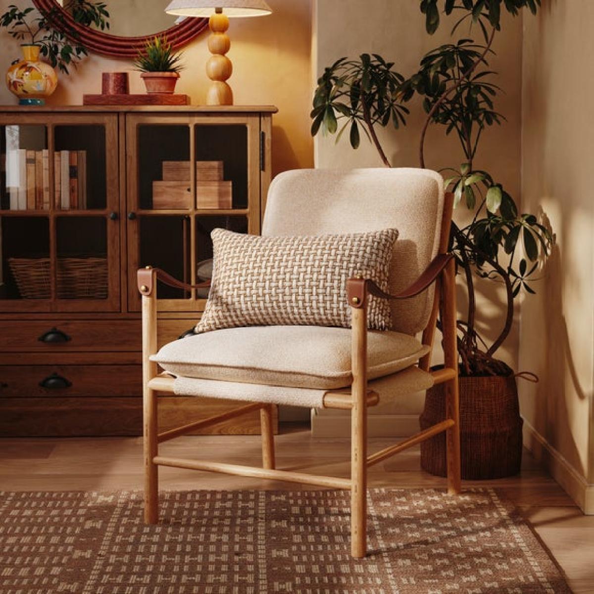 * Modern accent chair * Wooden frame * Arrives assembled The Explorer accent chair pairs a sturdy wooden frame with soft boucle upholstery, striking a balance between structure and softness. Its gently reclined back and generously padded seat offer a relaxed sit, while the natural wood finish adds warmth and timeless appeal. The textured boucle fabric lends a modern, tactile element, making this chair as stylish as it is comfortable.