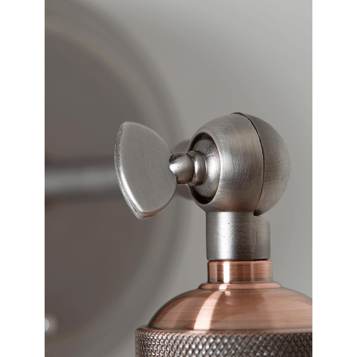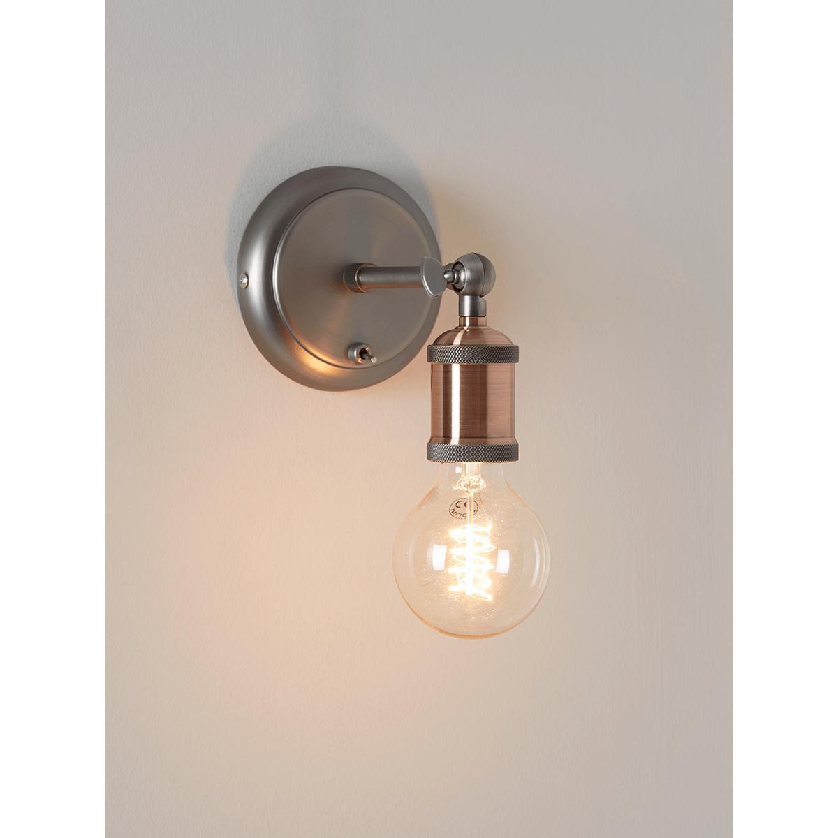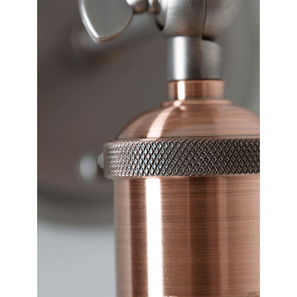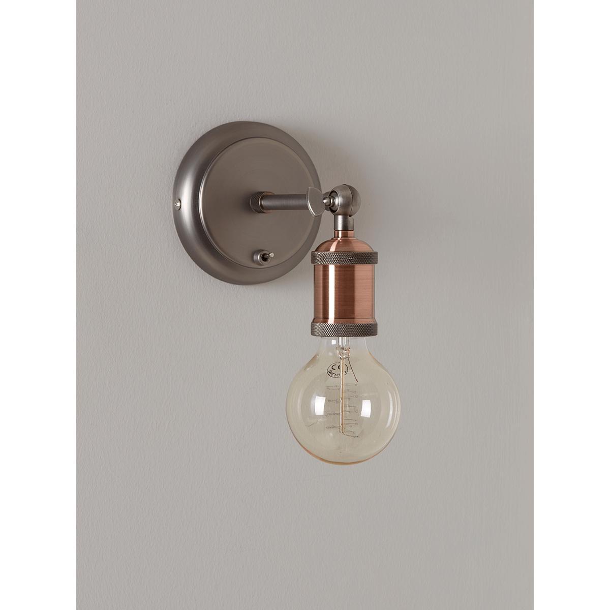 Contemporary and sleek in shape and style, our Exposed Bulb Wall Light will instantly update your space. Each light has an aged pewter back plate and feature detailed positioning arm. The steel tone contrasts beautifully with the etched finished contrast copper steel fitting to give quite the luxe feel.