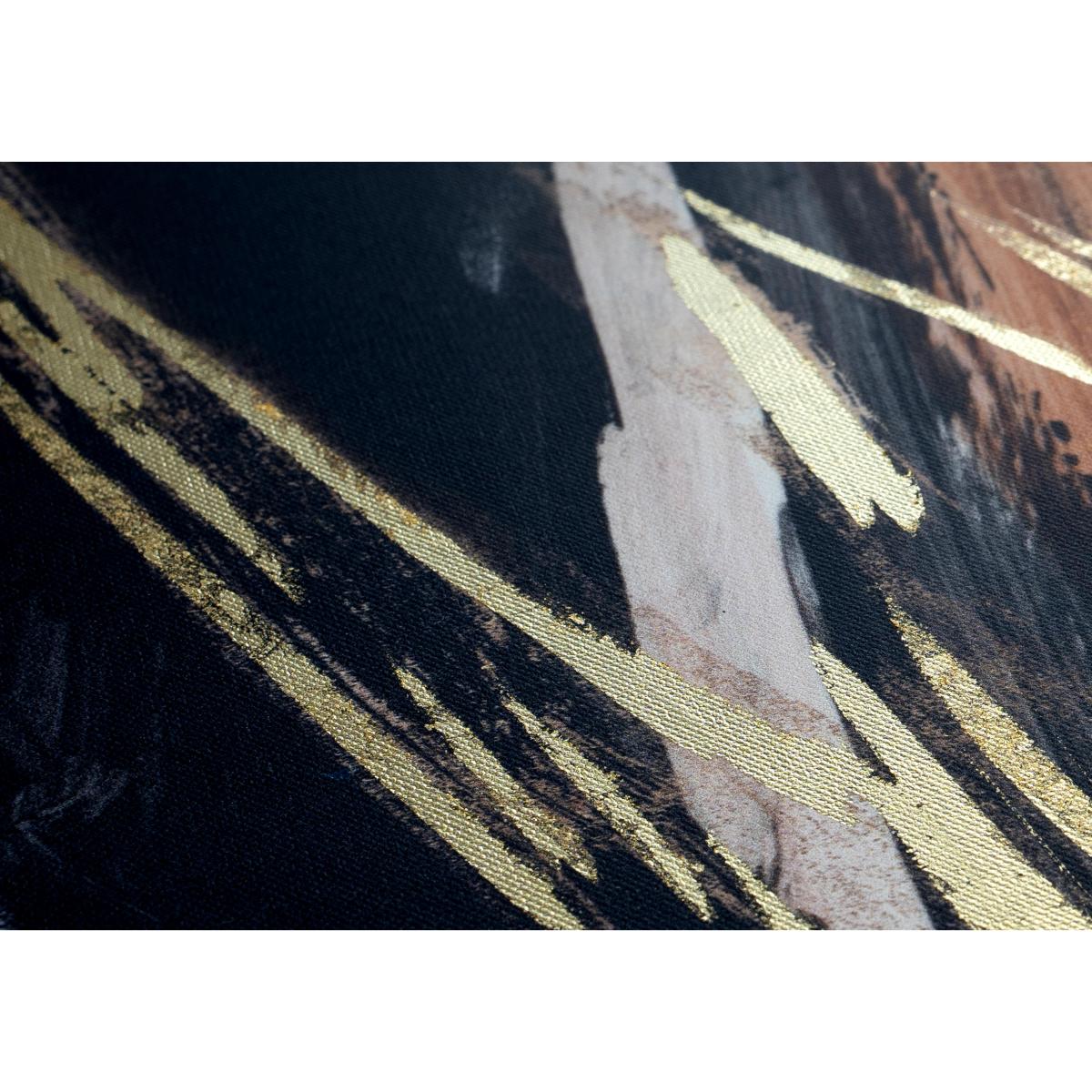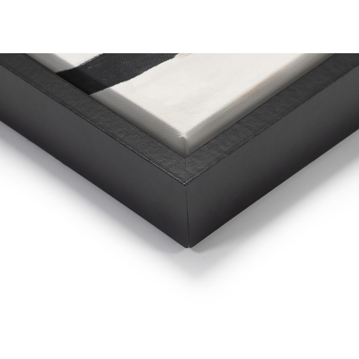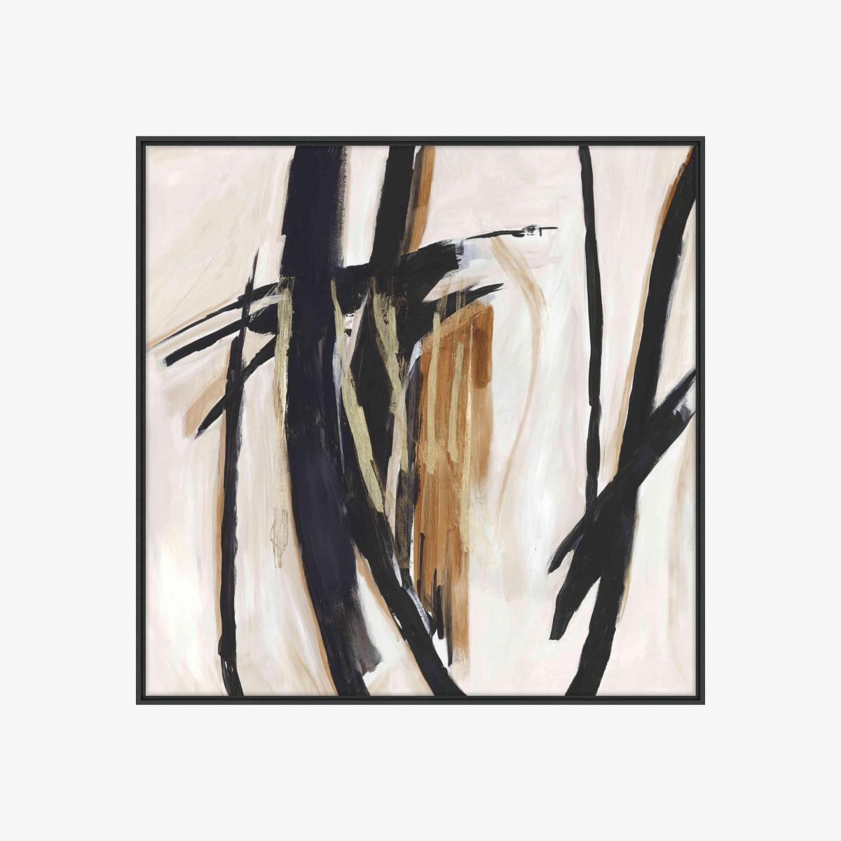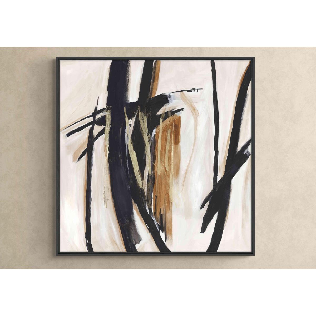 This large framed canvas is abstract art at its most striking thanks to the broad strokes of black, white and bronze enlivened with metallic gold leaf accents. Perfect for a feature wall. Why you'll love it A bold and visually arresting framed canvas. Abstract style in a striking black, white and bronze colour palette. Brilliant metallic gold leaf highlights. Reproduced from an original artwork by PI Studio. Stretched canvas print in gallery-style floating frame. Frame has a black woodgrain-effect finish. Made in England. Online only. This framed canvas is part of the Furniture Village home accessories collection. What you need to know Supplied with a metal hanging fitting and nylon cord. Indoor use only. Dimensions Height: 104 cm (41 in). Depth: 3 cm (2 in). Width: 104 cm (41 in).