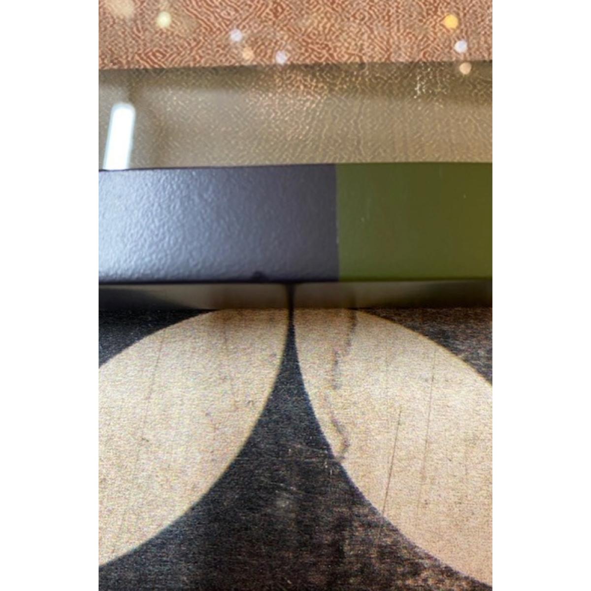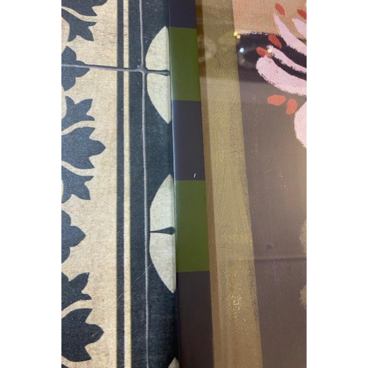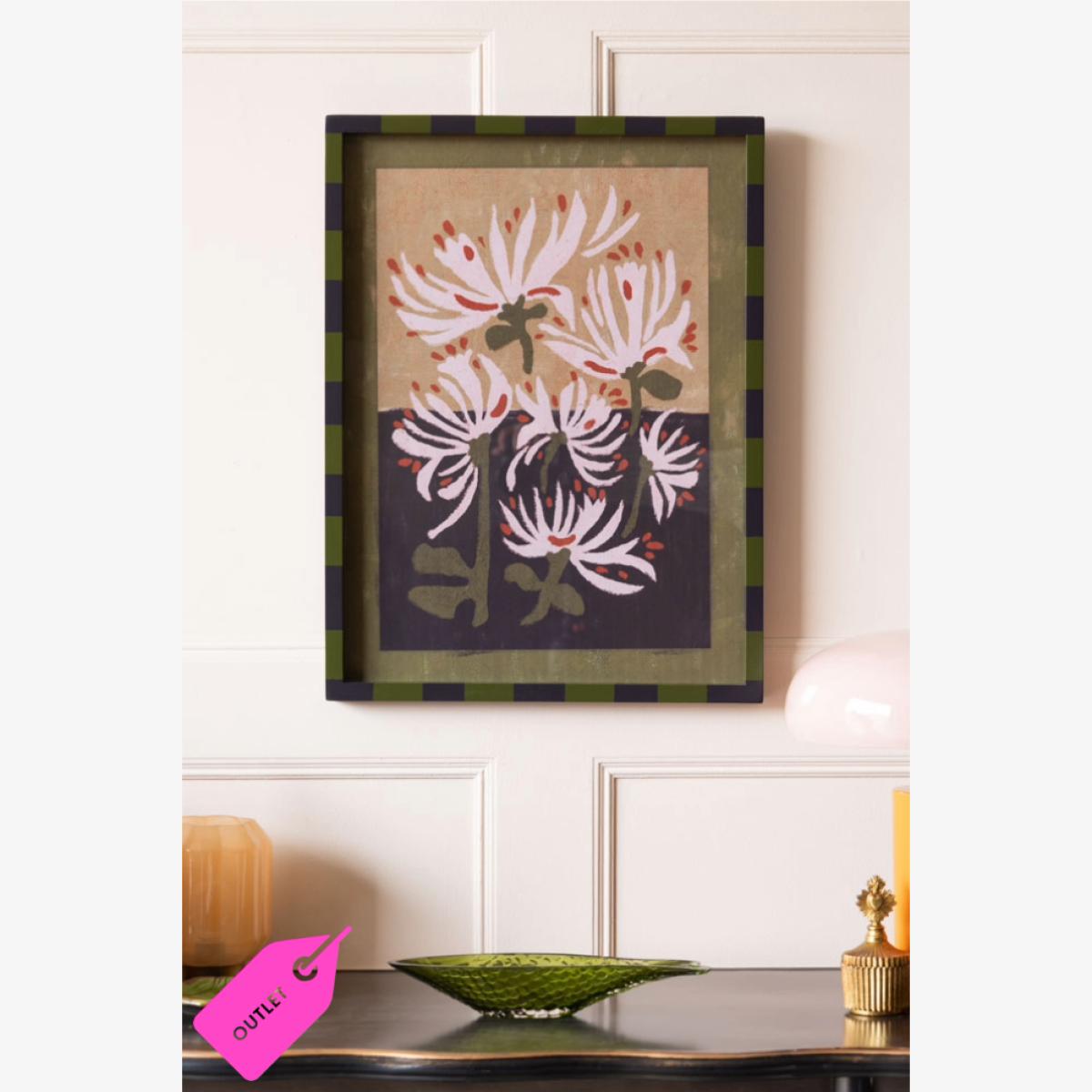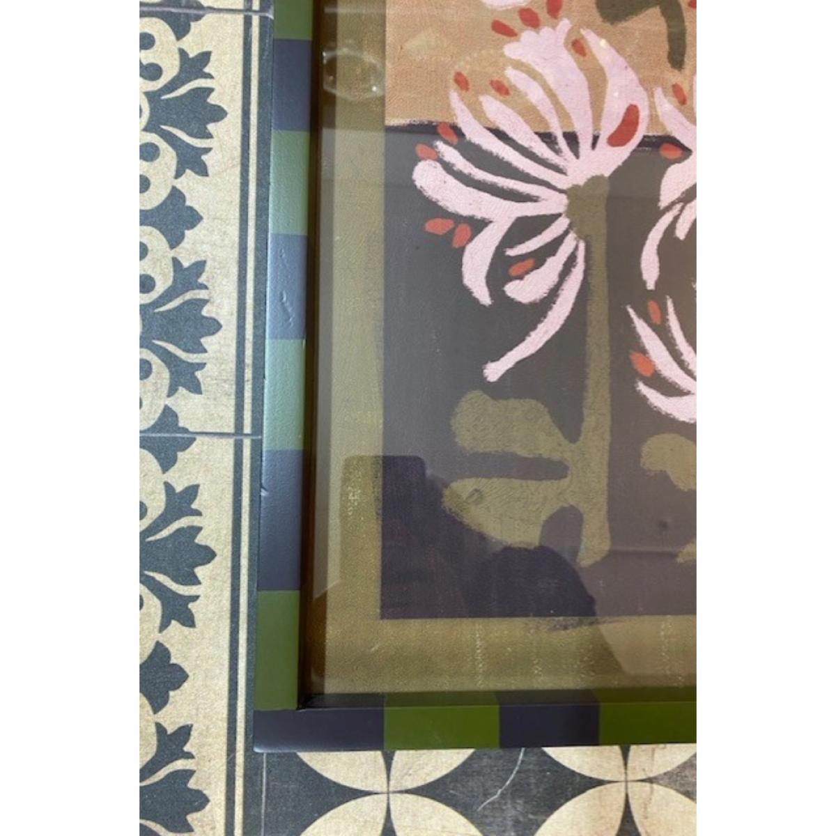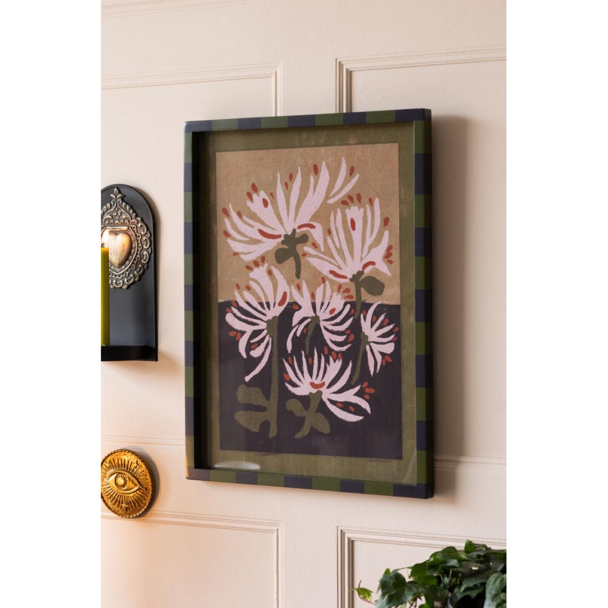 With a gentle presence and soulful palette, this framed wall art brings effortless beauty to any space. Though slightly imperfect—with a couple of tiny scratches and minor dents to the frame—it only adds to its charm. Featuring earthy tones of blush pink, dusky purple, and muted green, the artwork evokes a serene, painterly moment frozen in time. The loosely rendered florals bring an expressive, hand-crafted quality that radiates warmth and tranquility. Finished with a playful olive green and black striped frame, this piece adds just the right touch of contemporary cool—understated, yet undeniably eye-catching.- Expressionist-Style Flowers Print With Striped Frame - W45cm x H60cm - Material: Glass