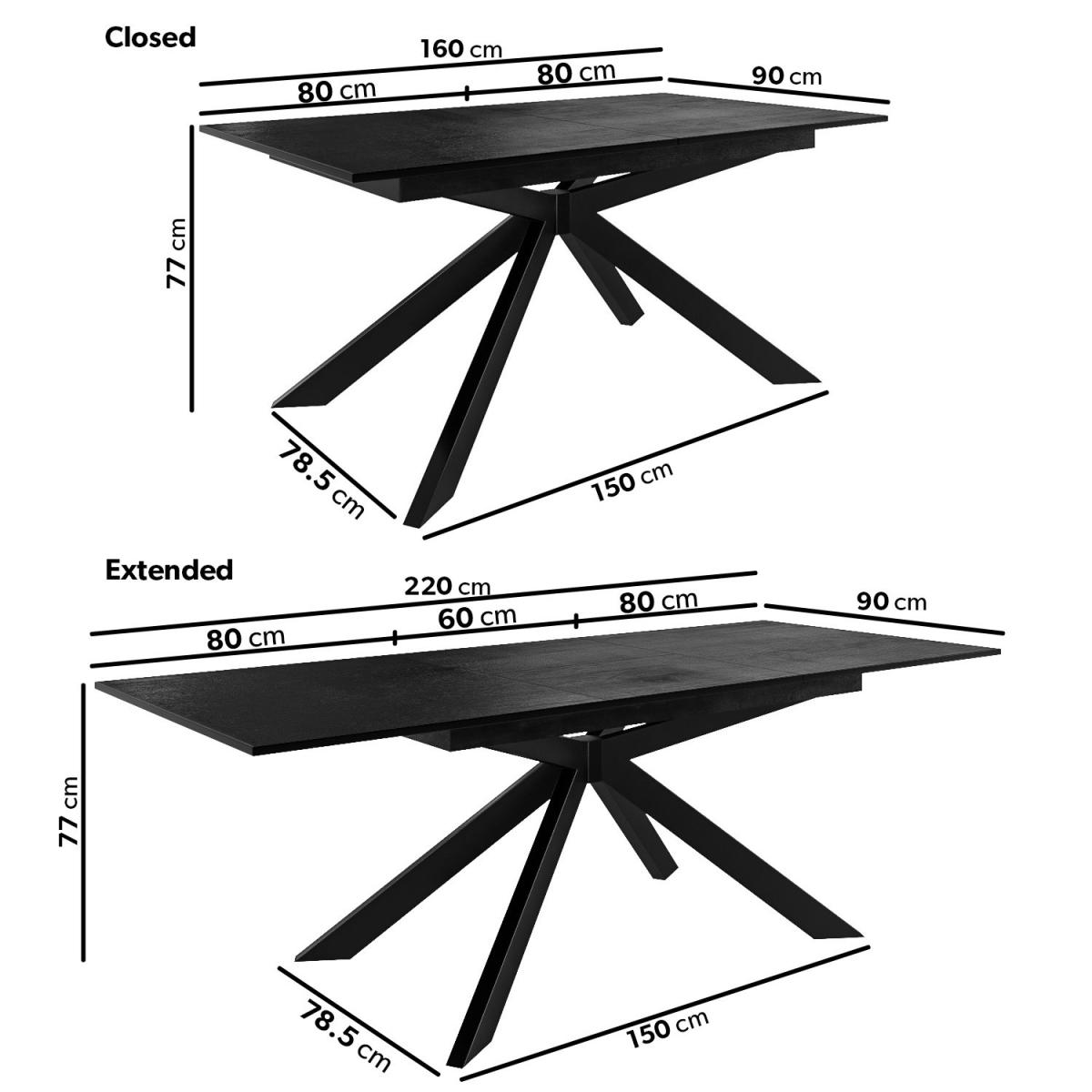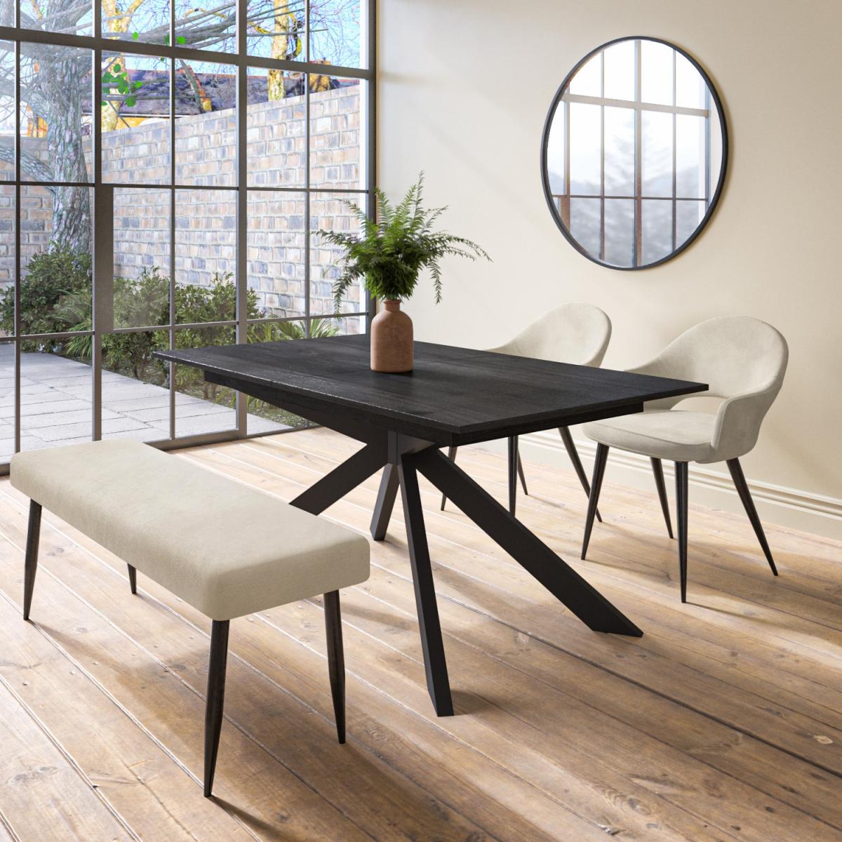 This bundle includes: Large Black Oak Extendable Dining Table - Carson 2 x Beige Fabric Dining Chairs - Colbie 1 x Beige Fabric Dining Bench - Colbie Features we love Large Black oak extendable dining table with black legs Beautifully crafted metal starbust frame Seats up to eight people comfortably when extended These Colbie dining chairs are upholstered in a luxurious textured chenille fabric Comfortable padded seats and armrest Need to know Dining Table Information Dimensions:H77 x W160 x D90 cm Extended dimensions:H77 x W220 x D90 cm Material:MDF, oak veneer and metal Finish:Painted top and power coated legs Extension mechanism:Butterfly Assembly required:Yes Dining Chair Information Number of chairs: 2 Dimensions:H79 x W57 x D60 cm Material: Chenille fabric Finish:Beige textured chenille fabric with sleek black legs Assembly required: Yes Range: Colbie Dining Bench Information Number of Benches: 1 Dimensions:H48 x W120 x D38 cm Material: Chenille fabric Finish: Beige textured chenille fabric with sleek black legs Assembly required: Yes Range: Colbie