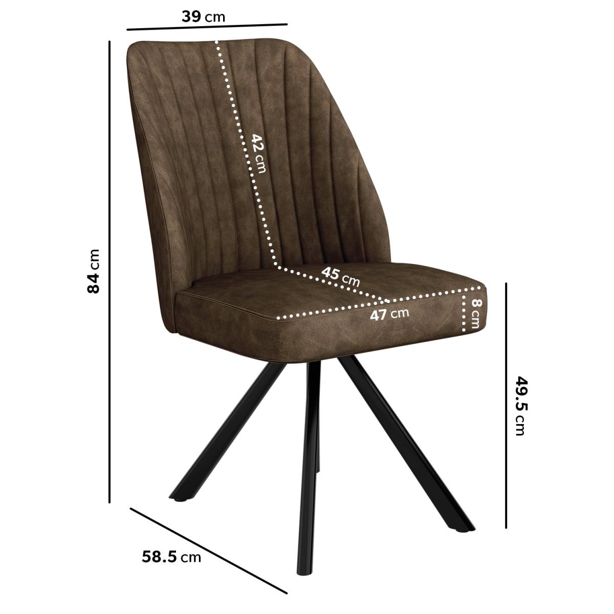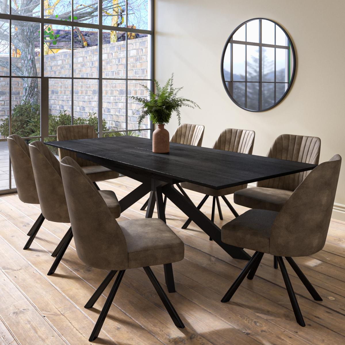 This bundle includes: Extendable Black Dining Table- Carson 8 x Brown Faux Leather Swivel Dining Chairs-Logan Features we love Large Black extendable dining table Beautifully crafted metal starburst frame Solid black oak veneered top Space saving beige faux leather swivel dining chairs Curved backrest offers comfort and ample back support Need to know Dining Table Information Dimensions:W160-220 x D90 x H77 cm Material:MDF, oak veneer and metal Finish:Painted top and powder coated legs Assembly required:Yes Dining Chair Information Number of chairs: 8 Dimensions:W47 x D58.5 x H84 cm Material: PU leather top, metal base Colour: Brown top, black base Assembly required: Yes Range: Logan