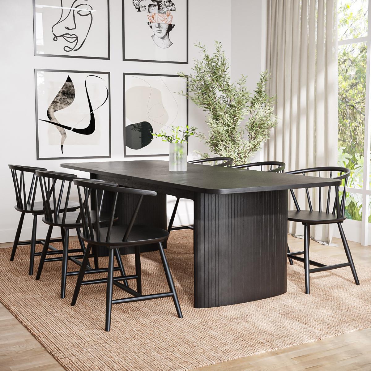 This bundle includes: Extendable Black Oak Dining Table - Jarel 6 x Black curved Spindle Dining Chairs - Dana Care instructions - Please use heat-protective mats & coasters when placing food & hot/cold drinks onto the table to protect the natural oak wood, clean up any spills straight away as oak wood is porous and will absorb liquids. Features we love Dining set for 6, ideal for up to 6 diners Extendable dining table with textured legs Contemporary curved table suits any dining room Wooden dining chairs painted black for a modern finish Elegant, curved spindle back and tapered legs Need to know Dining Table Information Dimensions:H76 x W120 x D120 cm Material:Blackened oak veneer and solid oak Finish:Lacquered Assembly required:Yes Dining Chair Information Number of chairs: 6 Dimensions: W56 x D56 x H74 cm Material: LVL and rubberwood Finish: Painted Assembly required: Yes Range: Dana