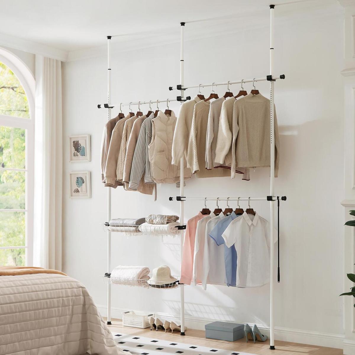 Introducing our premium Telescopic Wardrobe with Basket, the ultimate solution for walk-in wardrobe storage systems. This robust and sturdy clothes rail heavy duty is designed to meet all your storage needs, offering a blend of durability and elegance. Engineered from high-quality materials, this adjustable clothes rail ensures maximum strength and longevity, making it an ideal choice for both residential and commercial settings. Our clothes rail pole features a telescopic design, allowing you to customise the height and width to suit your specific wardrobe space. Whether you have a compact or spacious area, this versatile clothes rail with shelves can be adjusted to fit perfectly, providing ample storage for your garments. The integrated basket adds an extra layer of convenience, offering a dedicated space for accessories, shoes, or other wardrobe essentials. Adjustable shelving features allow you to maximise hanging space and storage efficiency. The wardrobe storage organiser shelves can be tailored to accommodate various clothing types, from long dresses to short jackets. This flexibility makes it an excellent choice for both seasonal and everyday wardrobe organisation.