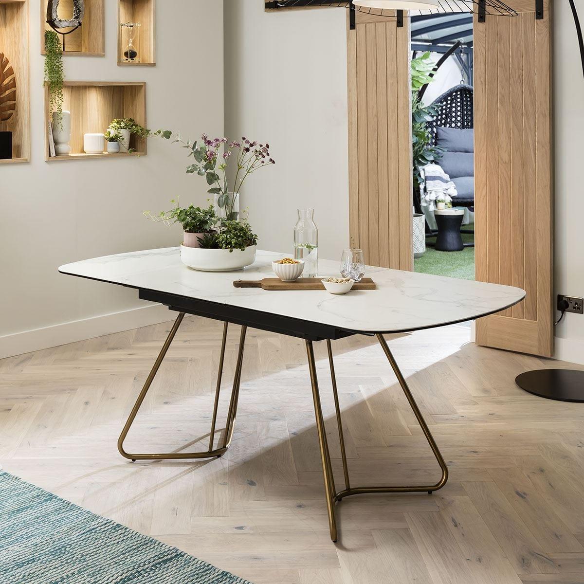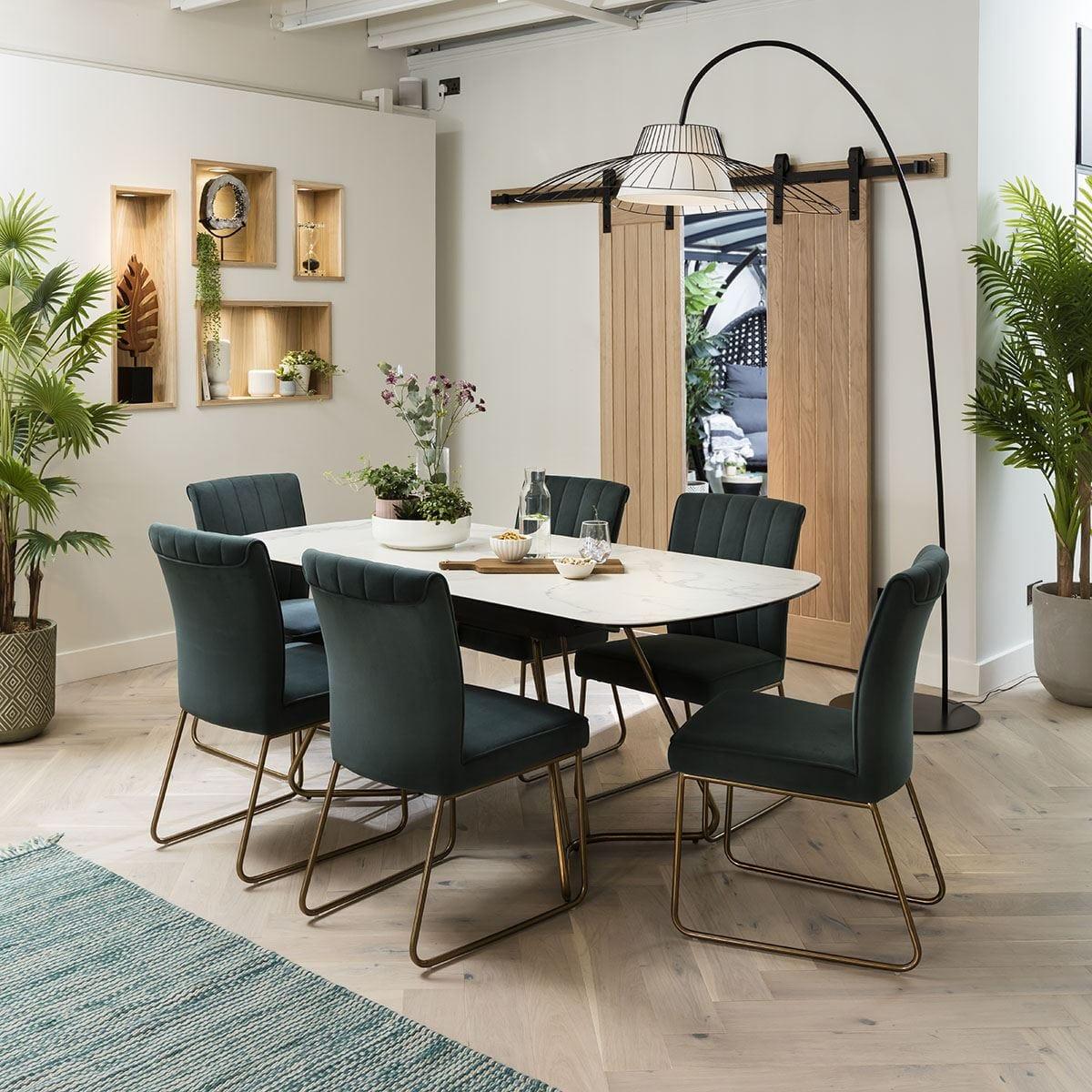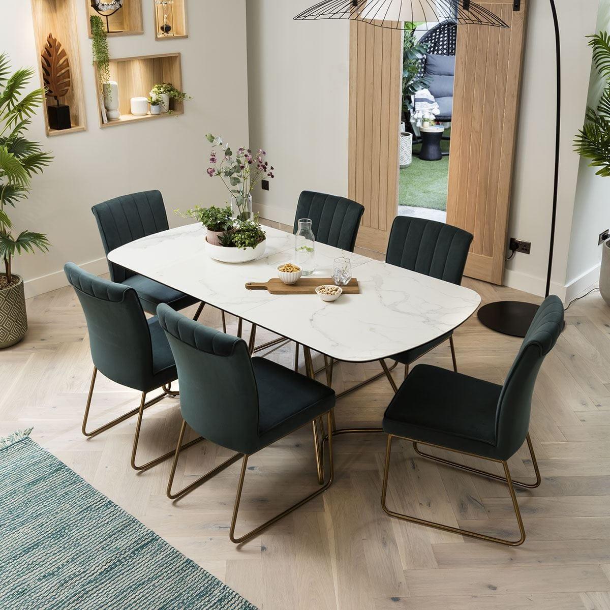 The Deco Dining Table and Chairs Set is a versatile and stylish seating solution for any dining space. This dining set can comfortably seat up to 6 people. Extendable dining sets offer a perfect gathering spot for friends and family. The premium teal velvet upholstery is luxurious in its richness and vibrancy. Crafted with the utmost care, the chairs are upholstered in teal velvet, adding a rich and inviting ambiance to your dining area. The plush velvet not only feels indulgent but also enhances the overall visual appeal, making every meal a truly delightful experience. The Deco dining table is a perfect blend of functionality and style. With its auto-lift feature, extending the table has never been easier. Simply pull one side, and watch as the extension effortlessly pops up into place, giving you extra space in a matter of seconds. Crafted with utmost precision, this table boasts a premium white ceramic top with a captivating textured matte marble-effect finish. Not only does it exude elegance, but it also offers remarkable durability. The scratch, heat, and stain-resistant ceramic ensures that your table remains in pristine condition for years to come, even with everyday use. Designed to accommodate your needs, this dining set comfortably seats up to six people, making it ideal for intimate family dinners or gatherings with friends. The extendable dining table features an auto-lift feature, extending the table has never been easier. Simply pull one side, and watch as the extension effortlessly pops up into place. Whether you're hosting a formal dinner party or enjoying a casual brunch, this dining table provides the perfect setting for memorable moments and engaging conversations. W180cm D90cm H76cm Auto-Lifting Extension Modern 6 Seater Dining Set with Extending Table