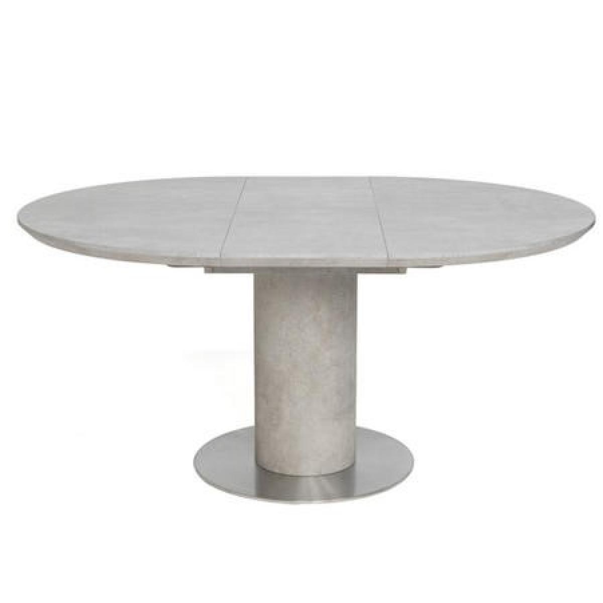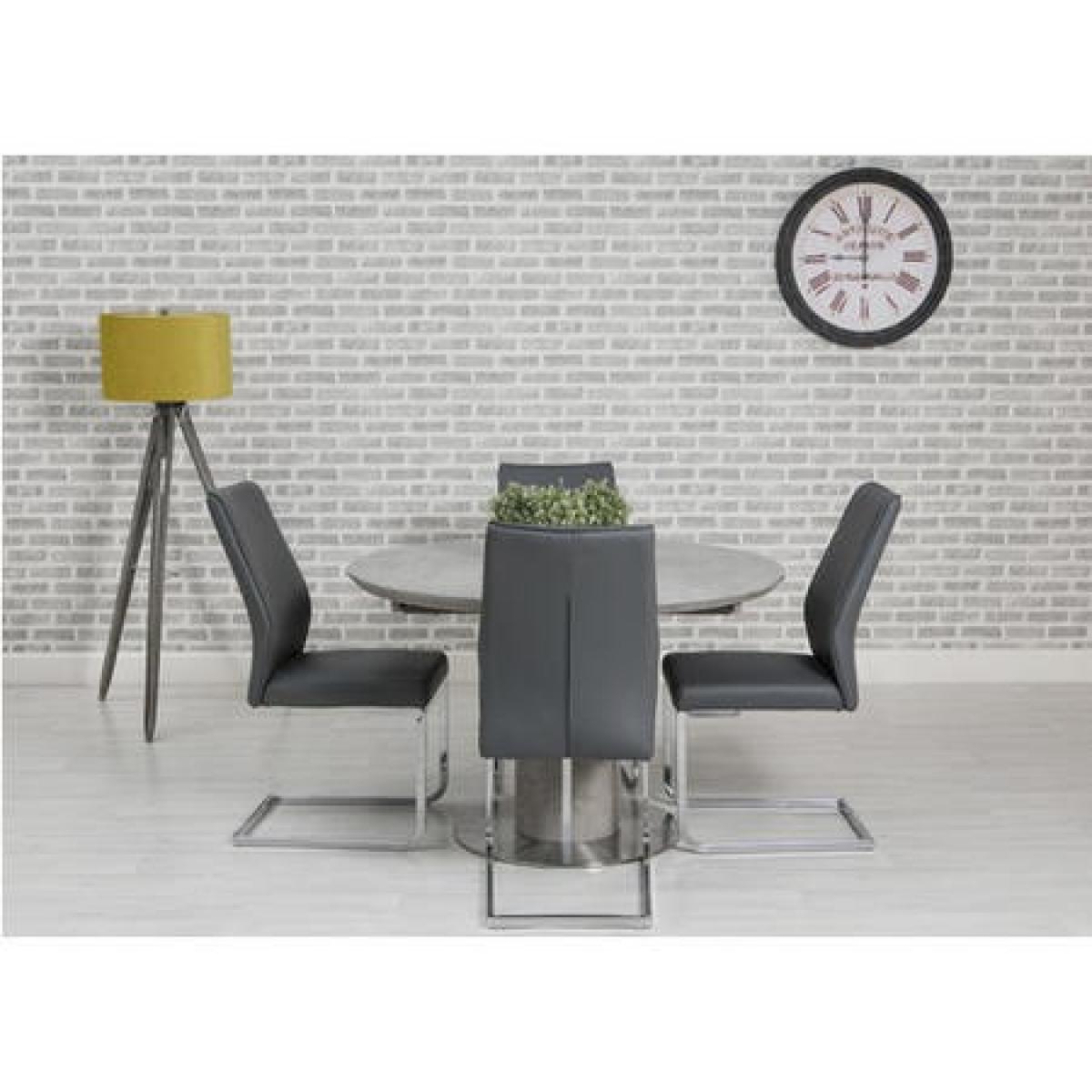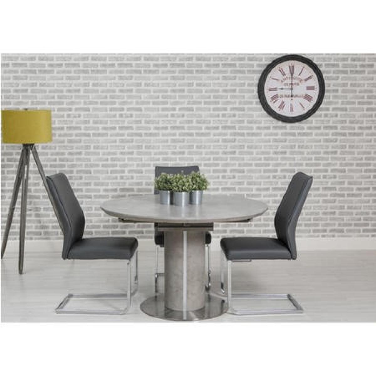 Table Dimensions H76 x W120-160 x D120 cm Chair Dimensions H96 x W45 x D63 cm. The Delta extendable round dining table is the perfect table for entertaining. It features a durable heat scratch and stain resistant table top which is a must for today's busy homes. It has an easy glide mechanism making opening the butterfly extension very easy. The edges of the table are rounded for a more elegant feel. These fabulous Hilton cantilever chairs have a lot to offer polished chrome leg frame faux leather cushioned seating available in a variety of colours to suit any interior. Features. Dining set including extendable table and 4 chairs. Stylish blend of concrete effect top and metal base. The faux leather dining chairs are full of character with their stylish appearance. Comfortable padded seats. Industrial luxe design Assembly required..