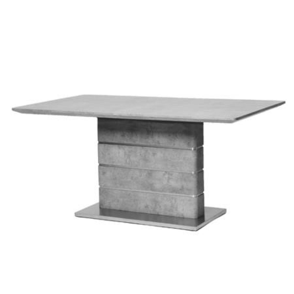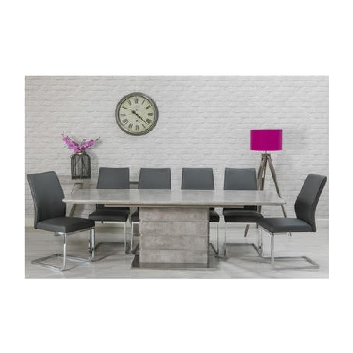 Table Dimensions H76 x W160-220 x D90 cm Chair Dimensions H96 x W45 x D63 cm. The Delta extendable rectangular dining table is the perfect table for entertaining or getting the family together for a meal. It features a durable heat scratch and stain resistant table top which is a must for today's busy homes. It has an easy glide mechanism making opening the butterfly extension very easy. These fabulous Hilton cantilever chairs have a lot to offer polished chrome leg frame faux leather cushioned seating available in a variety of colours to suit any interior. Features. Dining set including extendable table and 6 chairs. Stylish blend of concrete effect top and metal base. The faux leather dining chairs are full of character with their stylish appearance. Comfortable padded seats. Industrial luxe design Assembly required..