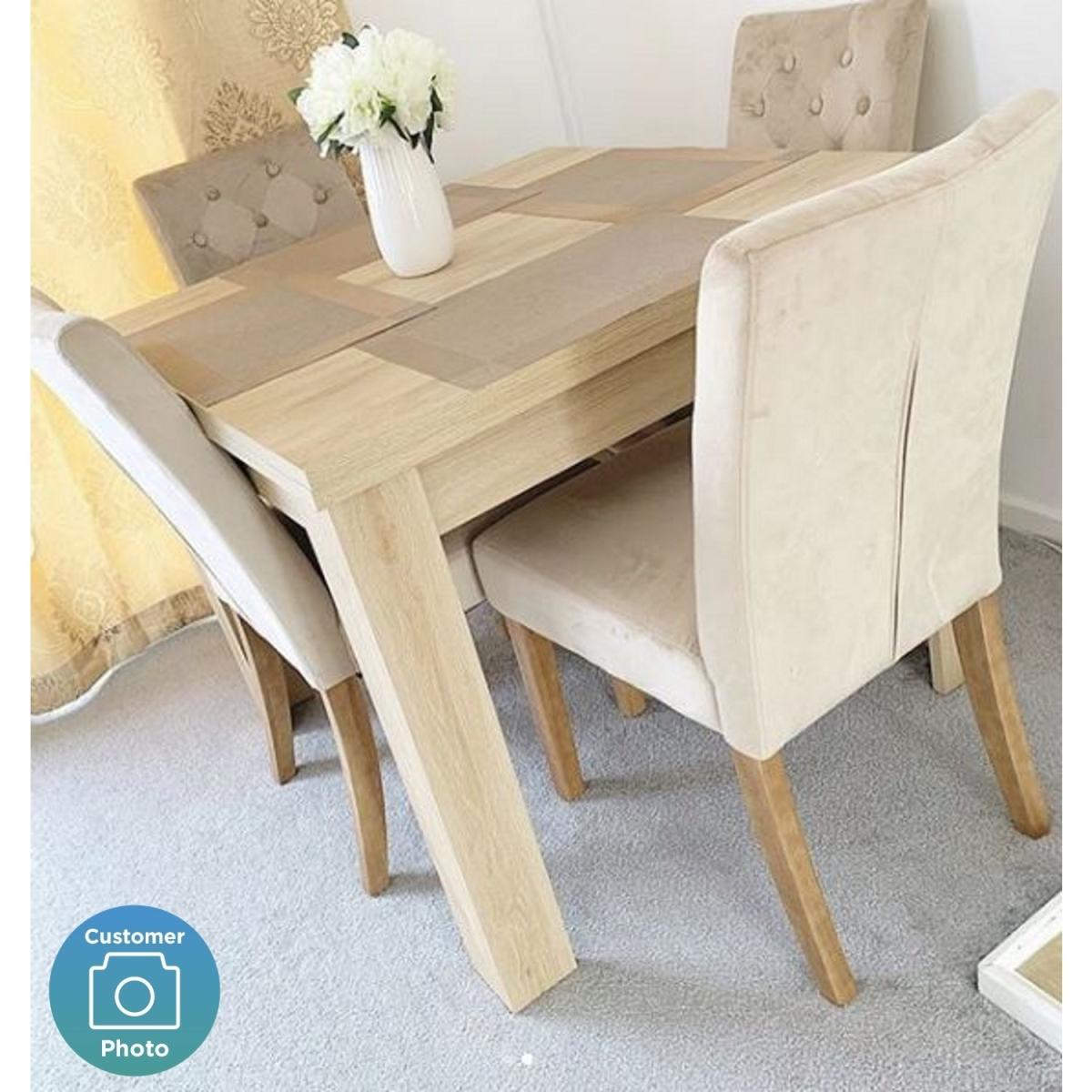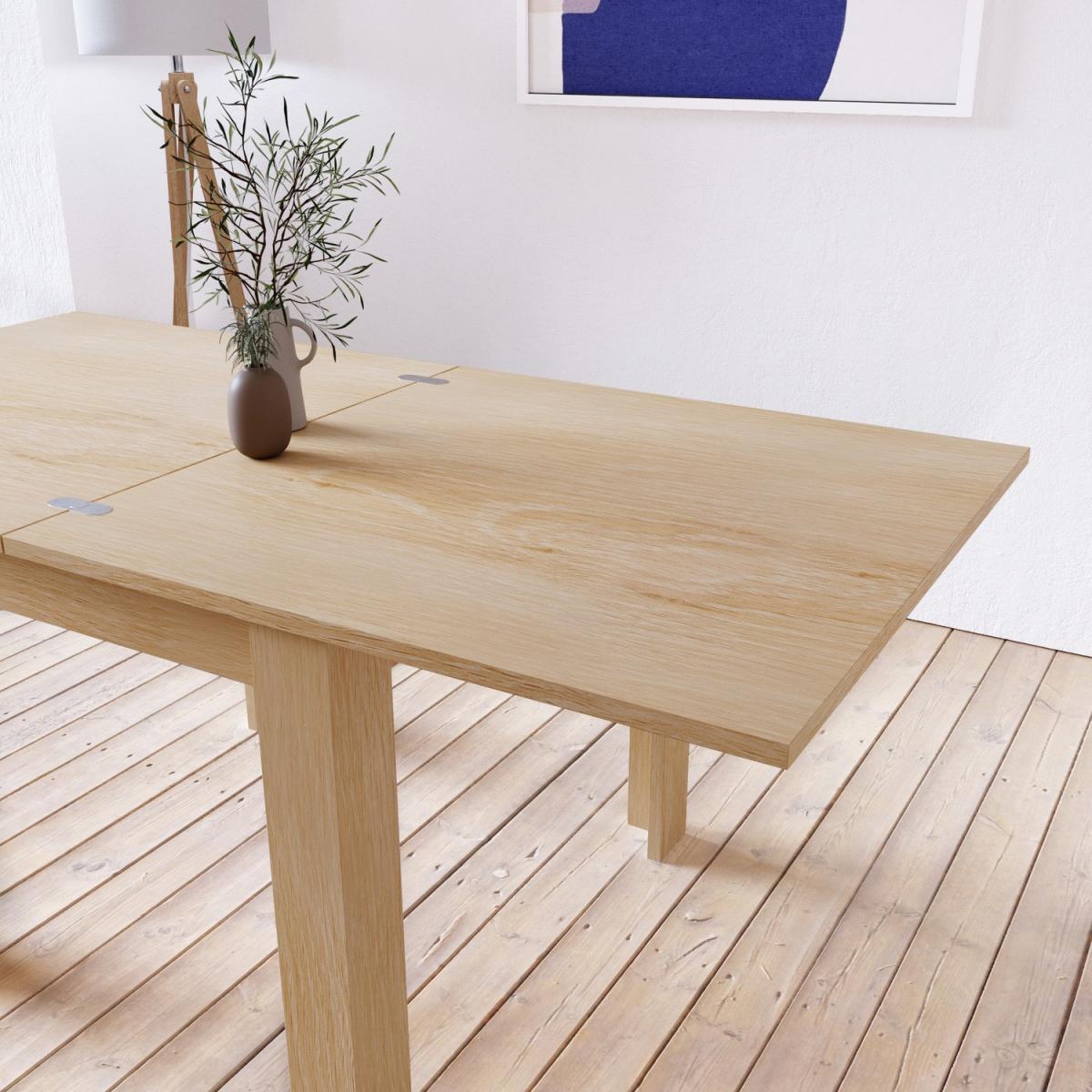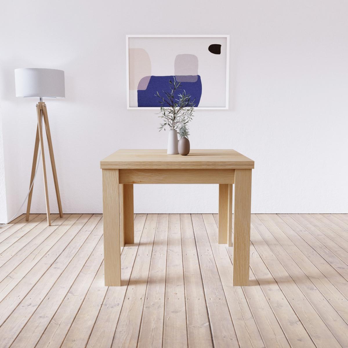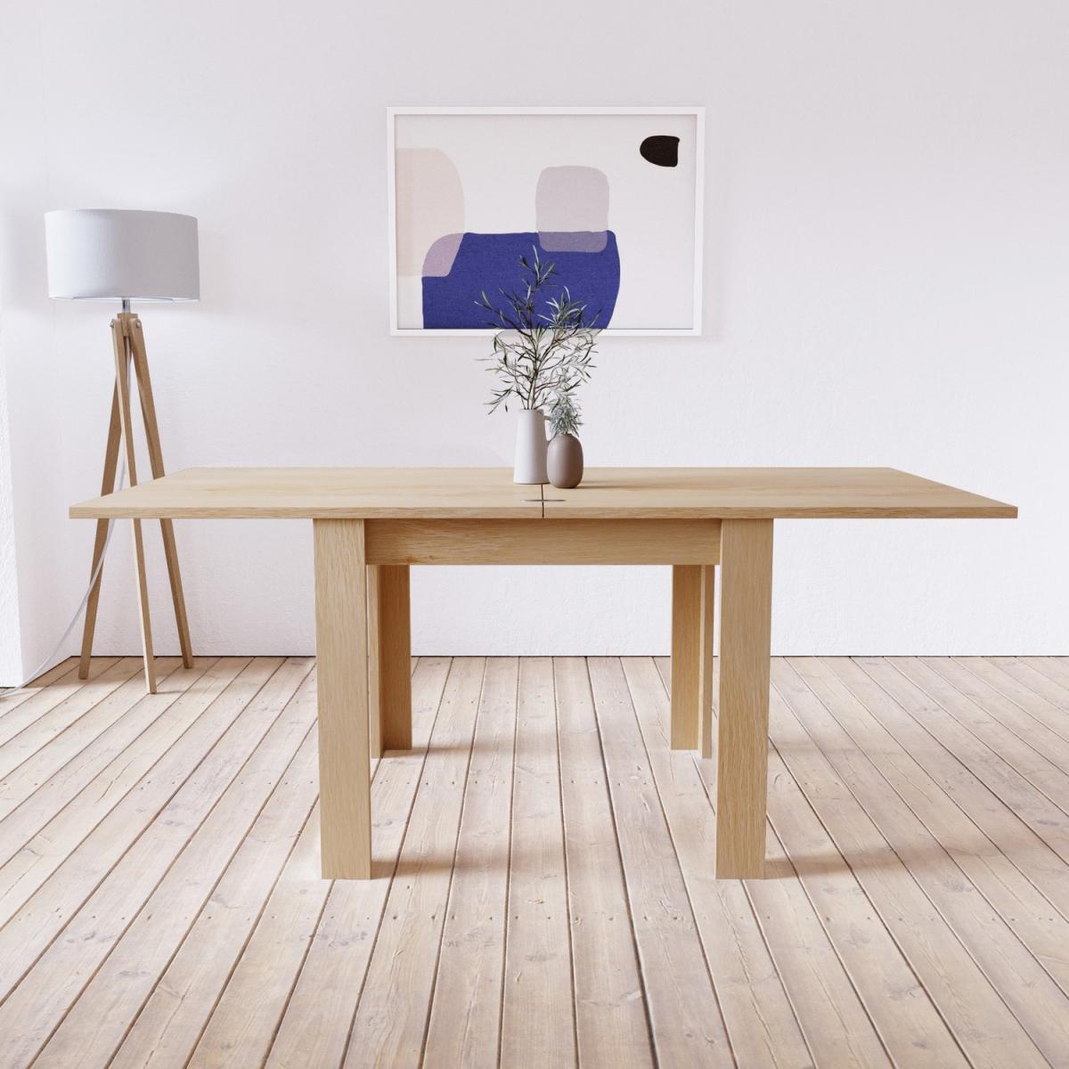 Features we love Oak dining table with extendable flip top mechanism. Light oak finish coordinates with any dining room Perfect for 4-6 diners – great for family meals. Pairs well with any style of chair. Also available in grey and; cream with oak legs All about me. This stylish and functional dining table delivers the best of both worlds. It gives you the option of extra seating but also saves on space. It features a clever extendable table design that allows you to double your dining space just by flipping the table top over making it great for when guests come to call. It's incredibly practical as once you're done with your dining you can simply flip it back up to save on floor space. The table comfortably accommodates four diners when closed and when fully extended there's plenty of space for six diners. The light oak finish and chunky effect legs bring a modern feel that suits most decors and styles. Built using a strong wood combination the table has a sturdy structure even when folded out. The table comes on its own so you have the freedom to pair it with the chairs of your choice and the number that best suits your household. It's delivered flat-packed so a little self-assembly is required. We recommend two people work together to assemble this item due to the larger components. The simple instructions are extremely easy to follow. Need to know. Dimensions (closed). H77 x W90 x D90 cm Dimensions (extended). H77 x W180 x D90 cm Size. Seats 6 Diners Material. Wood combination Finish. Light oak Assembly required. Yes.