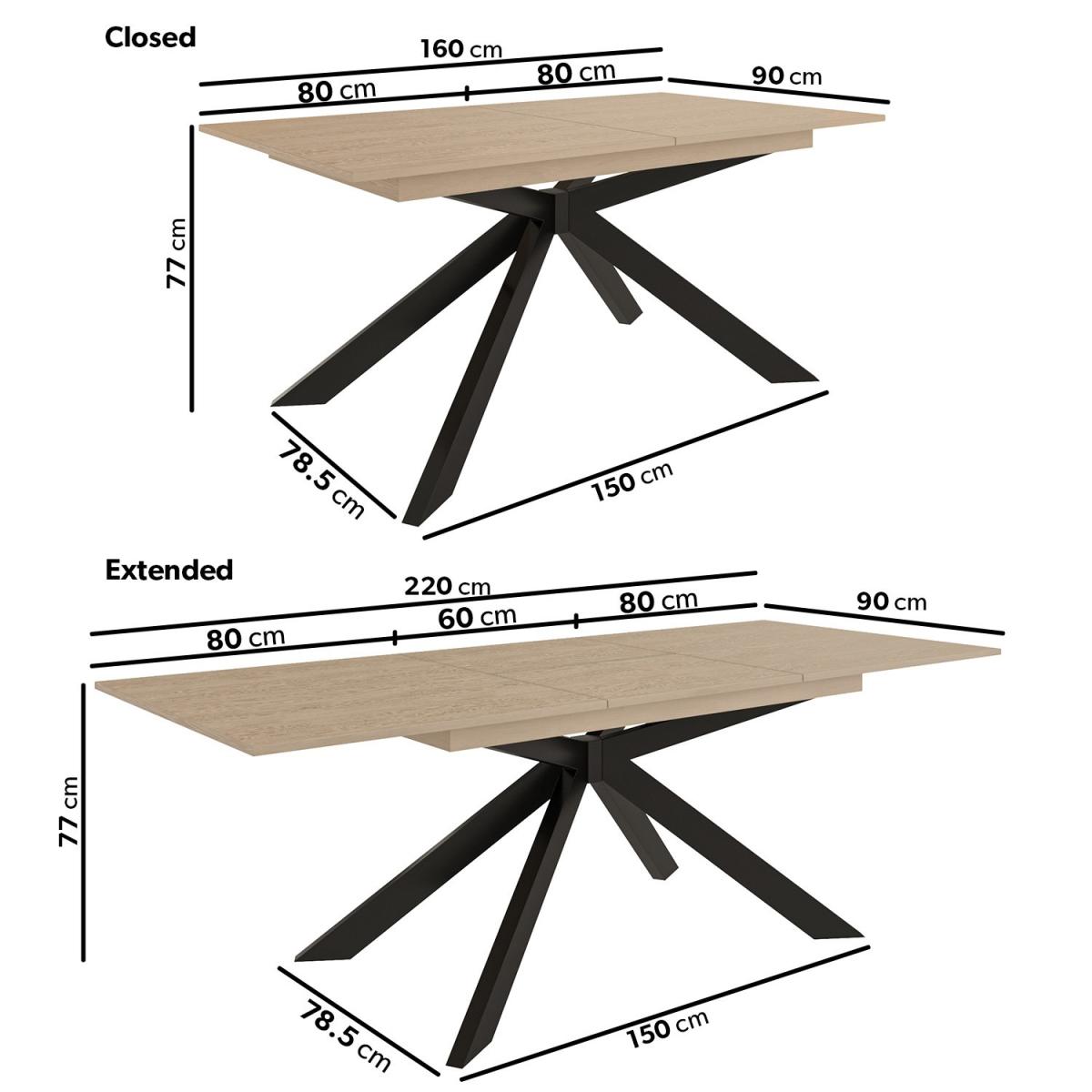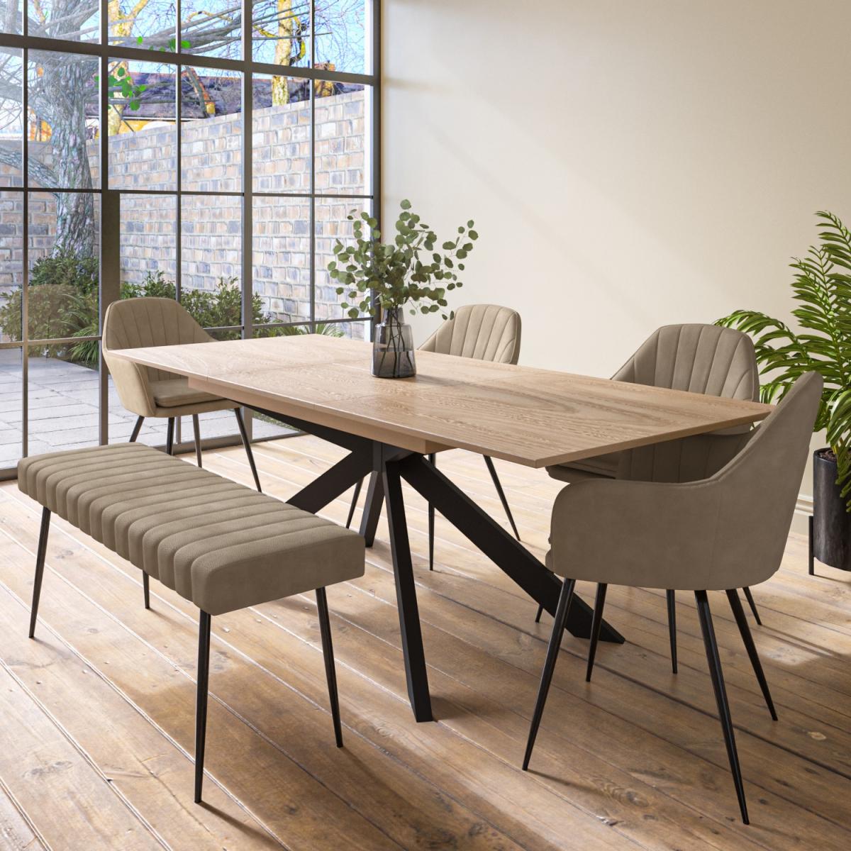 Large oak extendable dining table with black legs Beautifully crafted metal starbust frame Seats up to eight people comfortably when extended The faux leather is full of character with its stylish appearance Comfortable padded seats and armrest Need to know Dining Table Information Material:MDF, oak veneer and metal Finish:Painted top and power coated legs Extension mechanism:Butterfly Assembly required:Yes Dining Chair Information Number of chairs: 4 Material: Faux leather & metal Finish: Beige upholstered seat with sleek black legs Assembly required:Yes Range: Logan Dining Bench Information Number of Benches: 1 Material: Faux leather & metal Finish: Beige faux leather with sleek black legs Assembly required:Yes Range: Logan