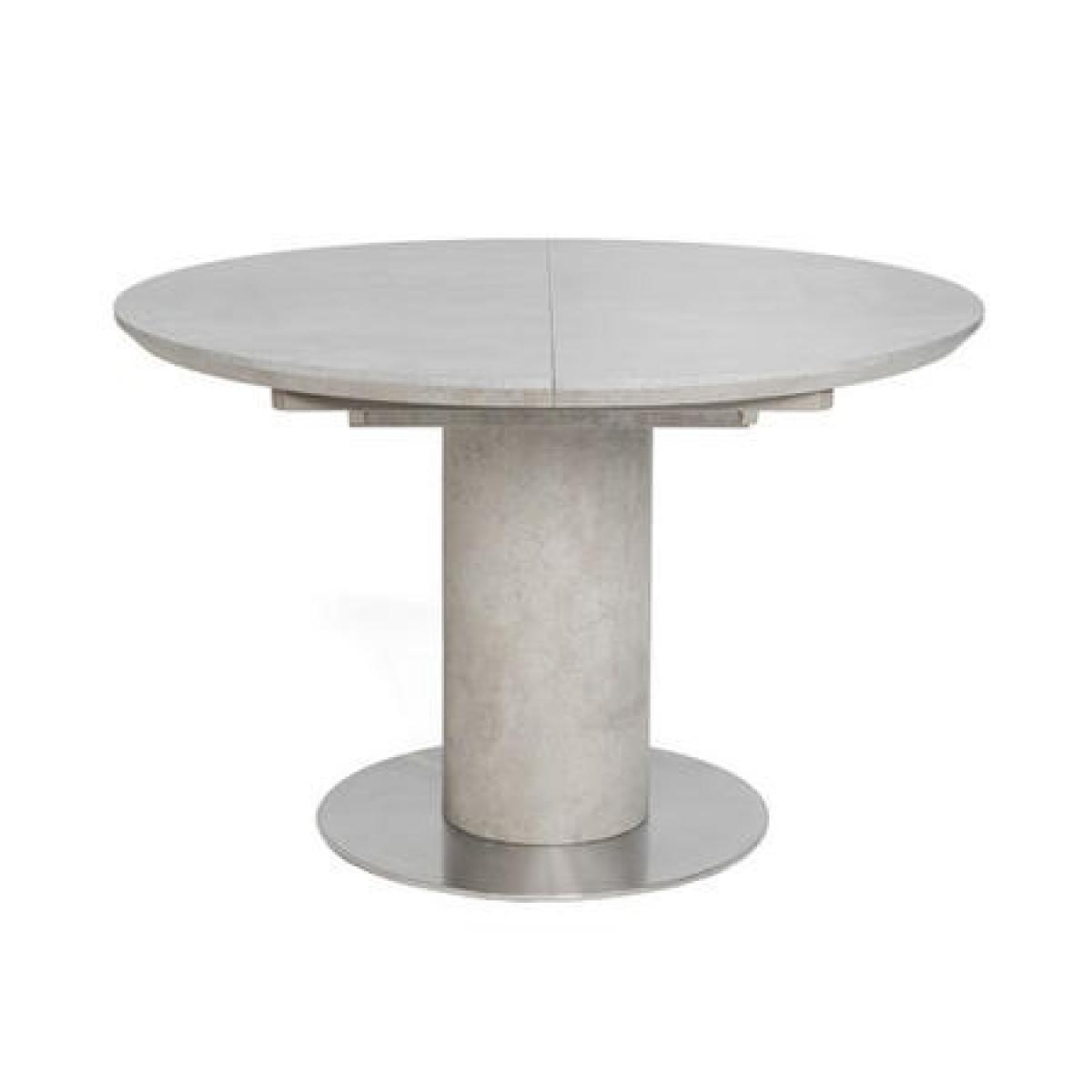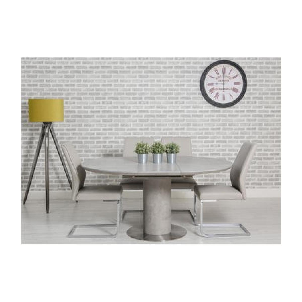 Table Dimensions H76 x W120-160 x D120 cm Chair Dimensions H96 x W45 x D63 cm. The Delta extendable round dining table is the perfect table for entertaining. It features a durable heat scratch and stain resistant table top which is a must for today's busy homes. It has an easy glide mechanism making opening the butterfly extension very easy. The edges of the table are rounded for a more elegant feel. These fabulous Hilton cantilever chairs have a lot to offer polished chrome leg frame faux leather cushioned seating available in a variety of colours to suit any interior. Features. Dining set including extendable table and 4 chairs. Stylish blend of concrete effect top and metal base. The faux leather dining chairs are full of character with their stylish appearance. Comfortable padded seats. Industrial luxe design Assembly required..