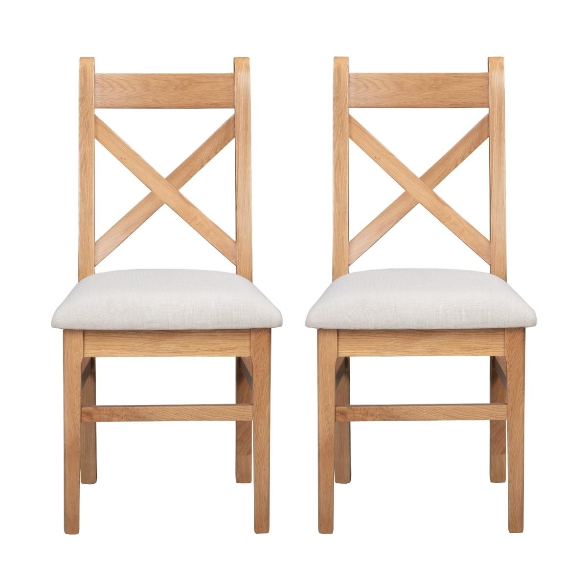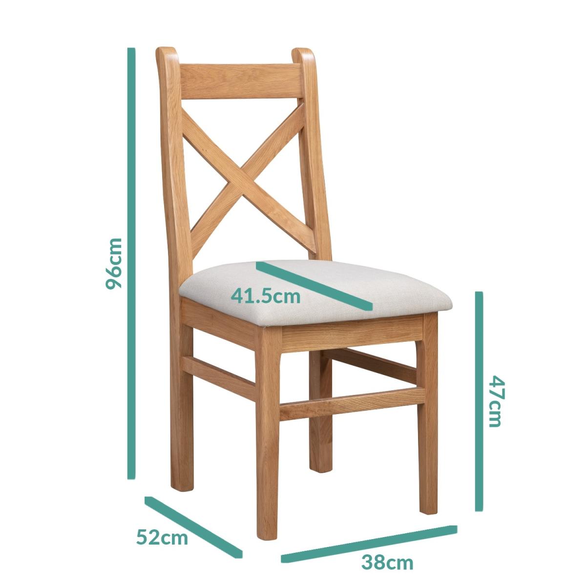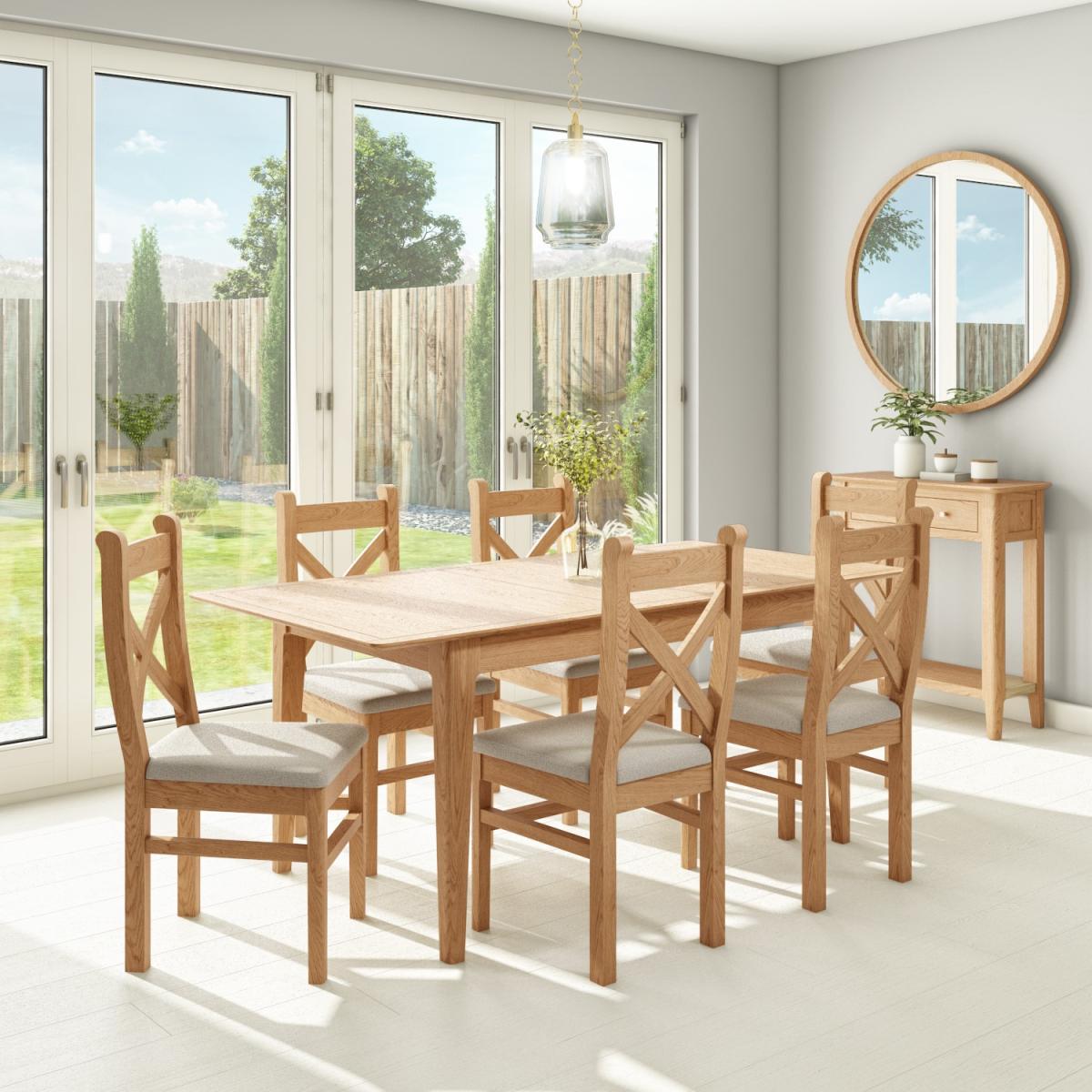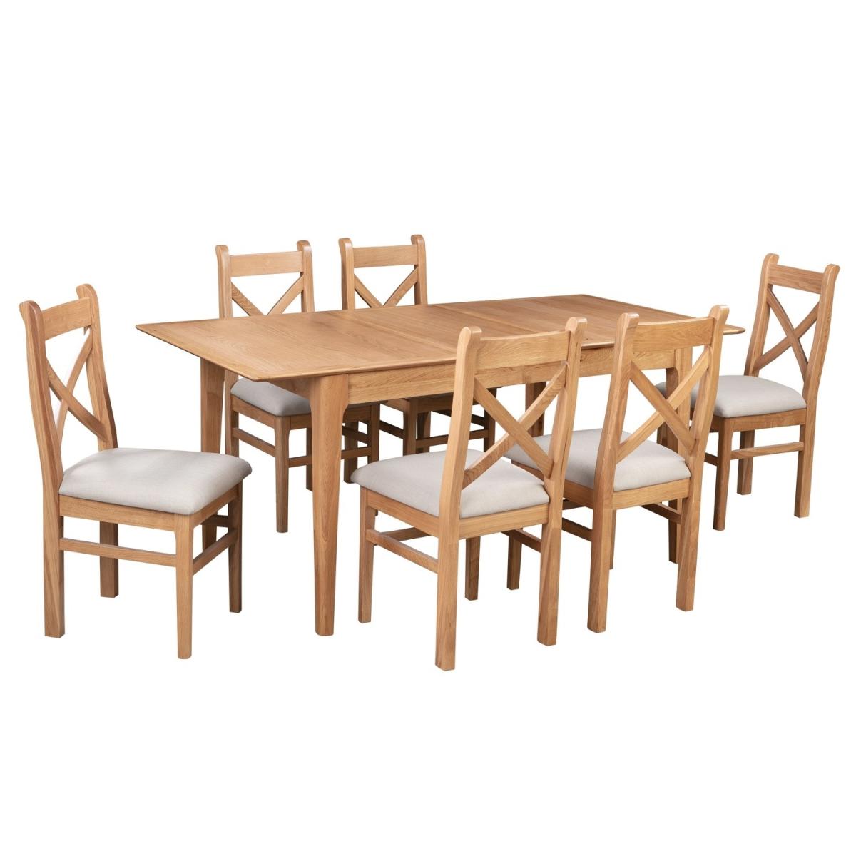. This bundle includes. 1 x Extendable Solid Oak Dining Table - Adeline. 6 x Solid Oak Dining Chairs with Off White Fabric Seat – Adeline Features we love Solid oak extendable dining table with oak veneer edge. Comfortably seats up to 6 people around the table. Comes with 6 solid oak chairs with classic cross back. High chair backs with foam-filled seats for comfort Timeless design that'll easily match any decor style Need to know. Dining Table Information. Dimensions closed. W140 x D90 x H78 cm Dimensions folded. W180 x D90 x H78 cm Seats. 6 Weight. 34kg Colour. Natural Finish. Lacquered Material. Solid oak with oak veneer Assembly required. Yes Dining Chair Information. Number of chairs. 6 Dimensions. H96 x W44 x D52 cm Floor to seat. 47cm Finish. Lacquered and fabric upholstery Material. Solid oak with oak veneer fabric and foam Assembly required. Yes.