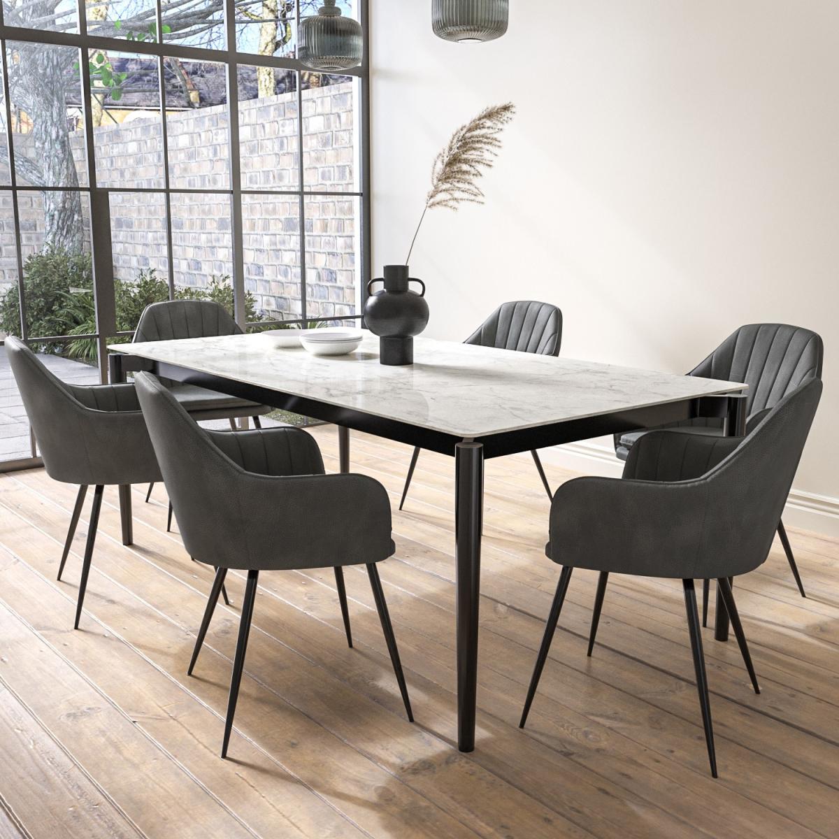 This bundle includes: Extendable White Marble Dining Table - Camilla 6 x Grey Faux Leather Dining Chairs - Logan Features we love Modern white extendable dining table Comfortably entertain up to 6 guests Upholstered in beautiful grey faux leather with modern vertical stitching Stain, scratch and heat resistant ceramic table top Minimal assembly required for the chairs, just attach the legs Need to know Dining Table Information Dimensions (closed):H75.2 x W160 x D85cm Dimensions (open): H75.2 x W200 x D85cm Packaging dimensions (Box 1): H20.5 x W170 x D95 cm Packaging dimensions (Box 2): H15 x W96 x D79 cm Weight: 105kg Max load weight: 120kg Seats: 6 Colour: White Finish: Ceramic top with marble effect design and dark grey, powder-coated metal legs Material: Ceramic, tempered glass and metal Assembly required: Yes- simply just attach the legs Dining Chair Information Number of chairs: 6 Dimensions:H85 x W59 x D45 cm Package dimensions: H63 x W64 x D54 cm Product weight: 5.5kg Maximum Load Weight:150kg per chair Material: Faux leather & metal Finish: Two tone - Grey & Black Assembly required: Yes