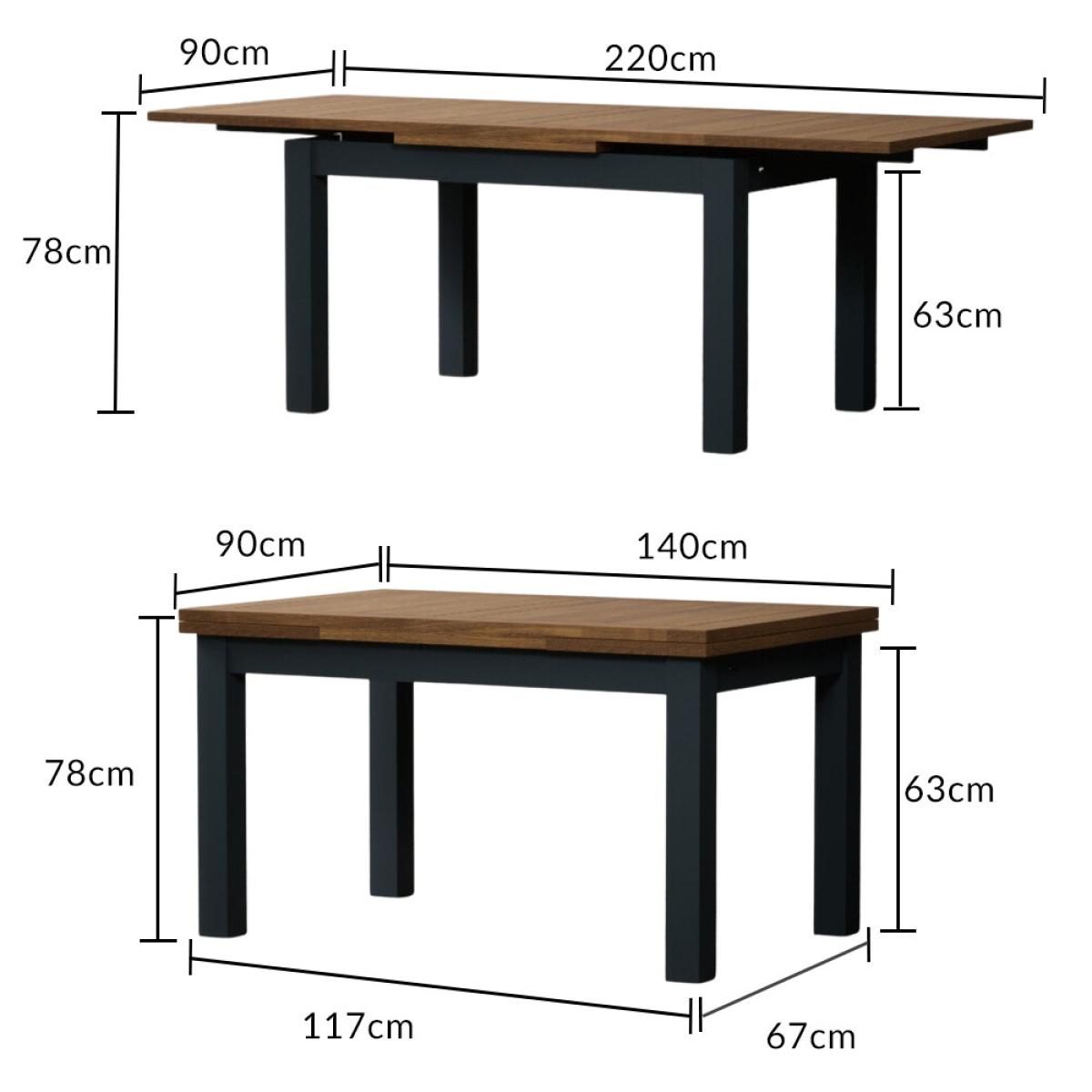 The Extending Buxton 140cm Oak and Dark Blue Dining Table with Scroll Back Chairs is a stylish painted solid wood and solid oak extending dining set perfect for every occasion.