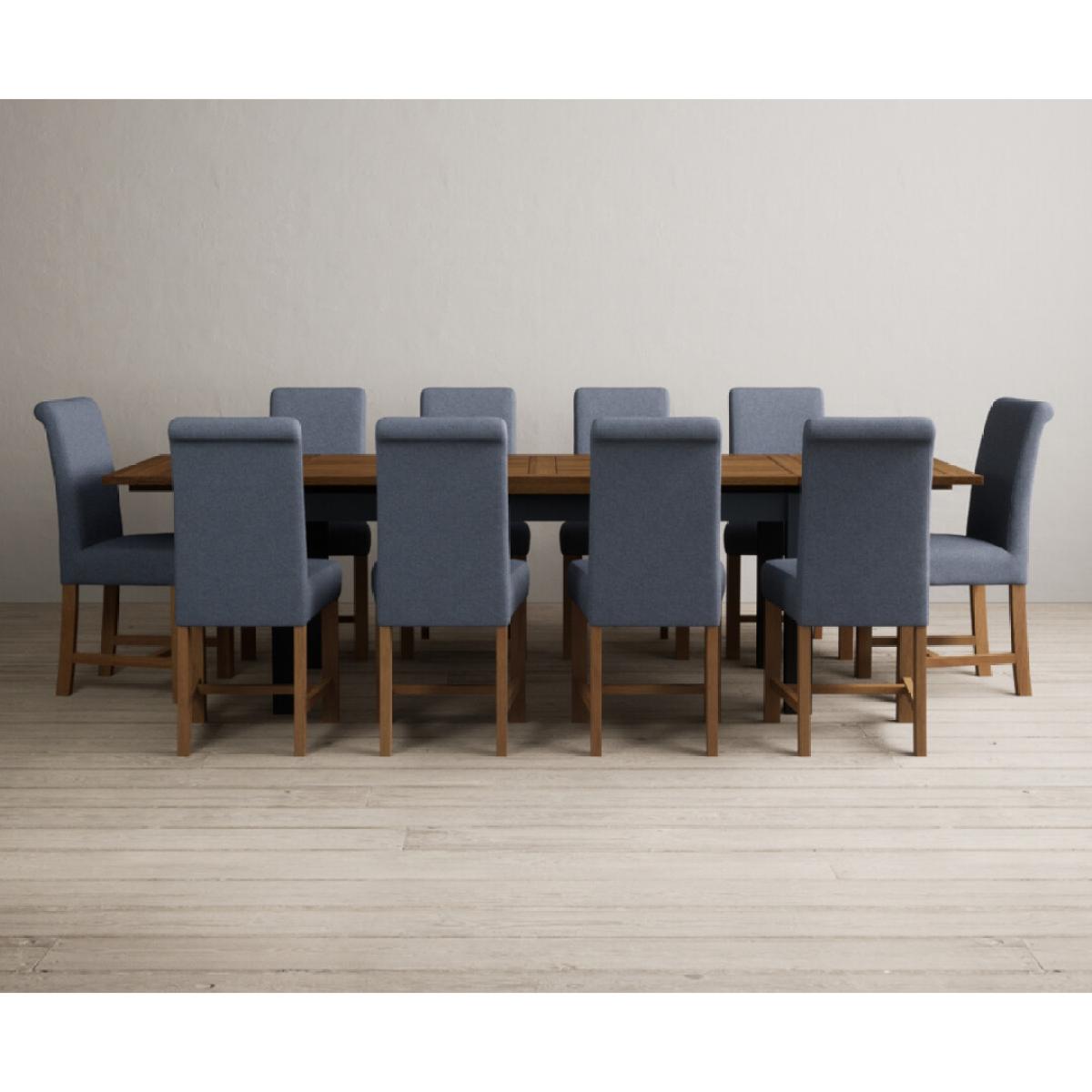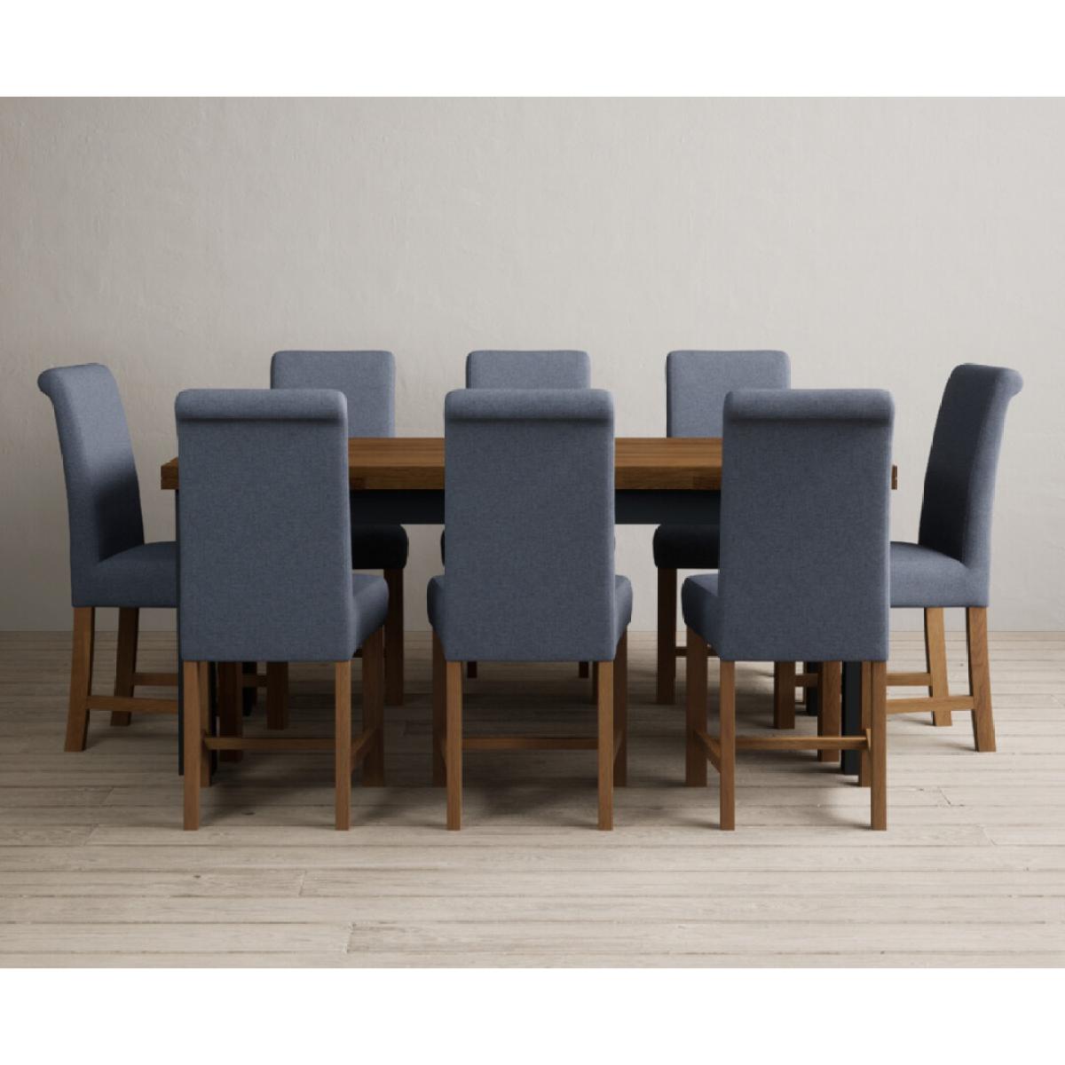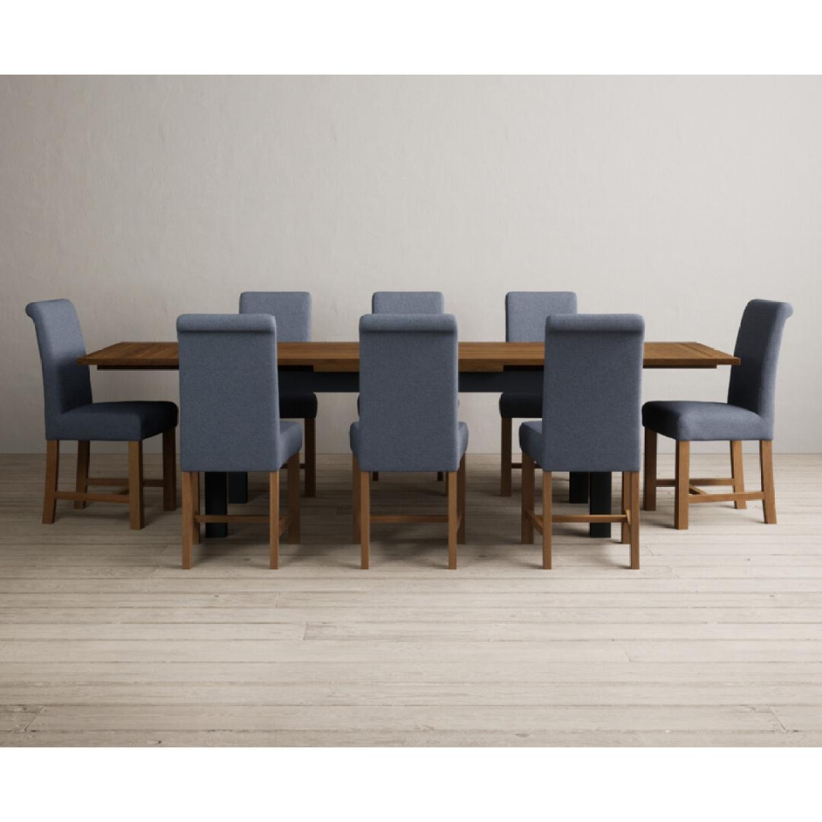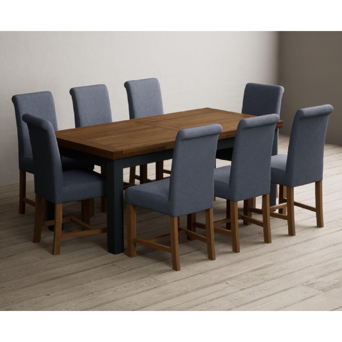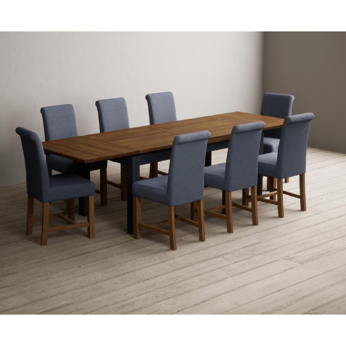 Extending Buxton 180cm Oak and Dark Blue Painted Dining Table with 8 Blue Scroll Back Chairs