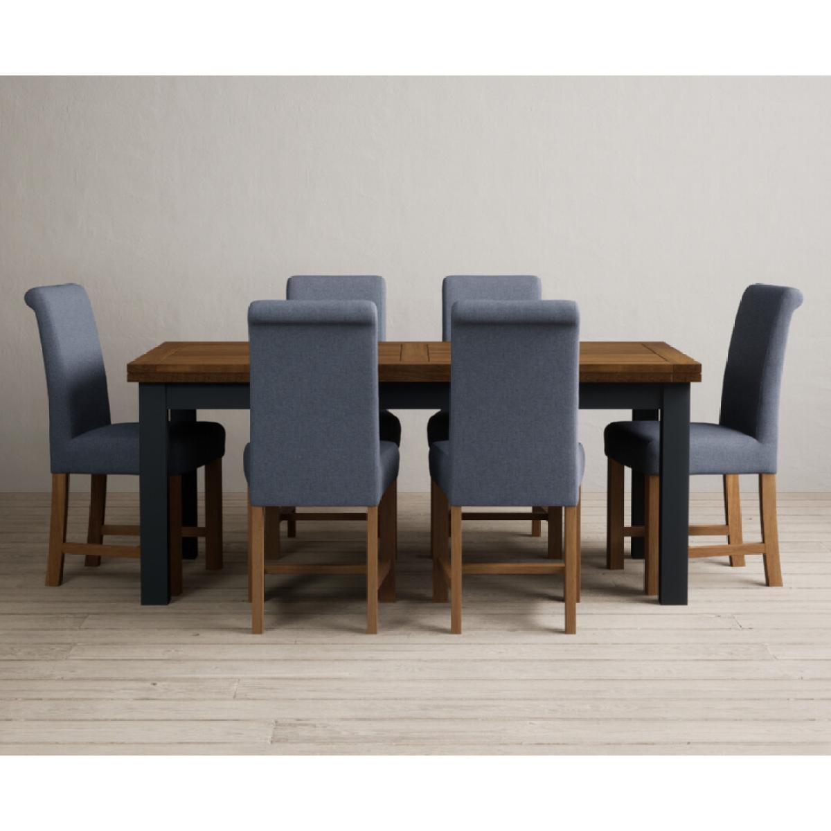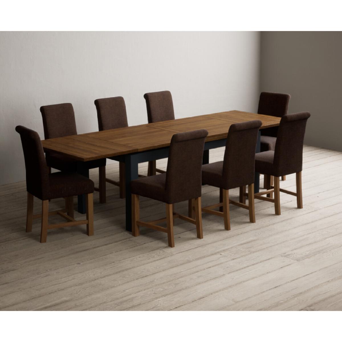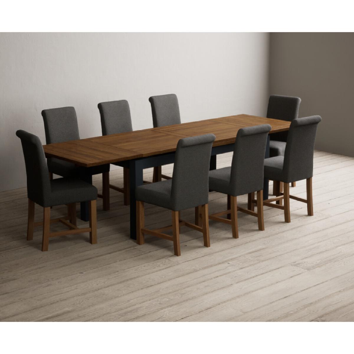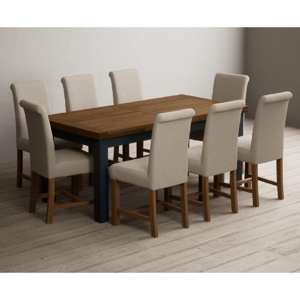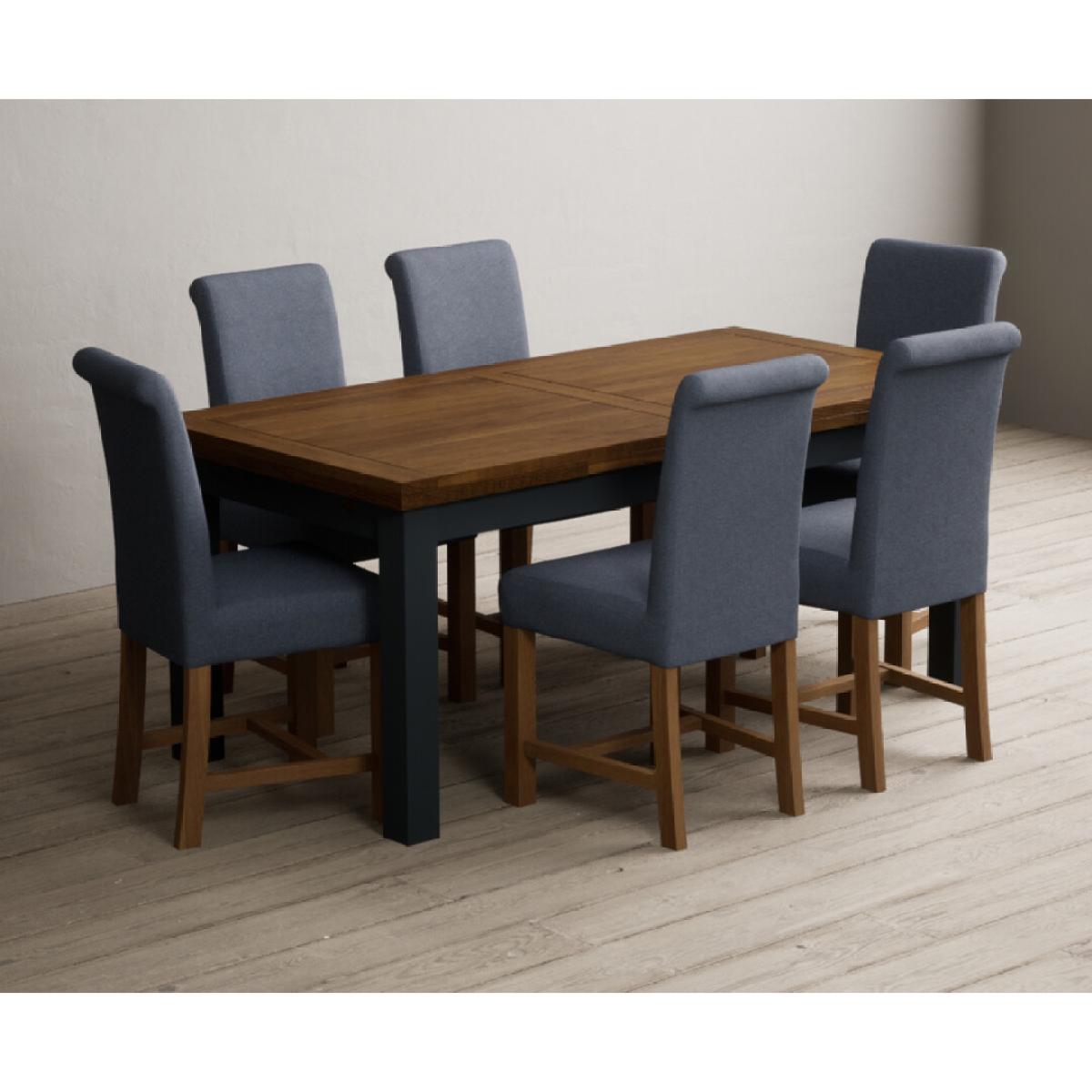 Extending Buxton 180cm Oak and Dark Blue Painted Dining Table with 8 Blue Scroll Back Chairs
