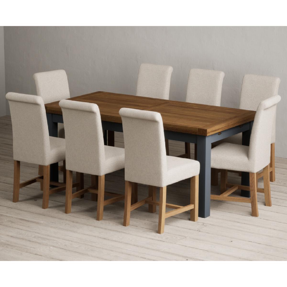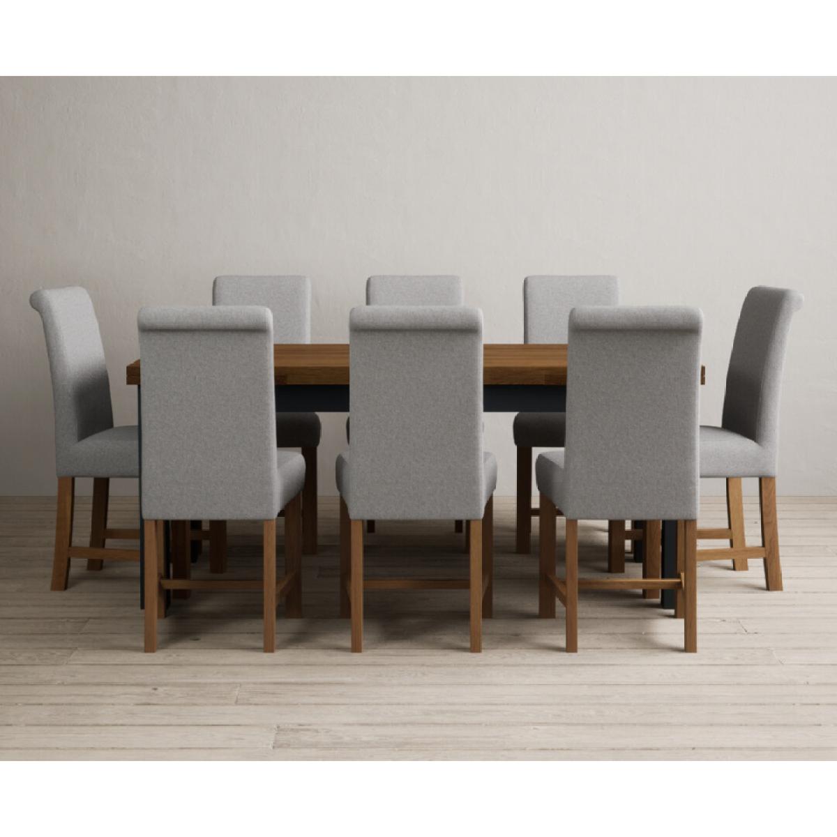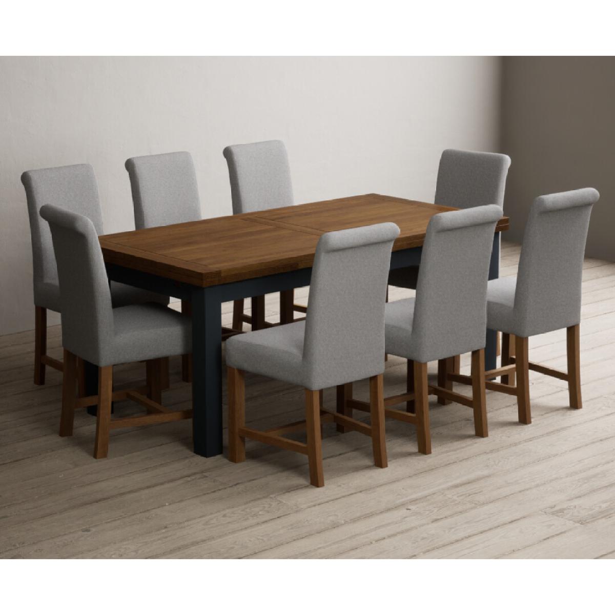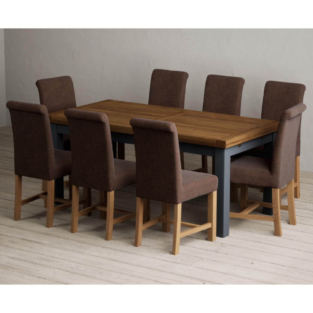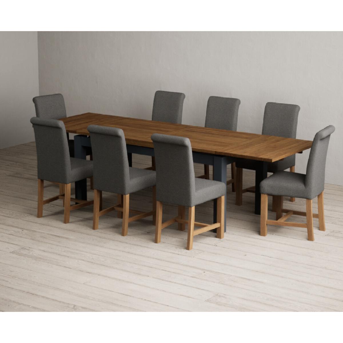 Extending Buxton 180cm Oak and Dark Blue Painted Dining Table with 8 Blue Scroll Back Chairs