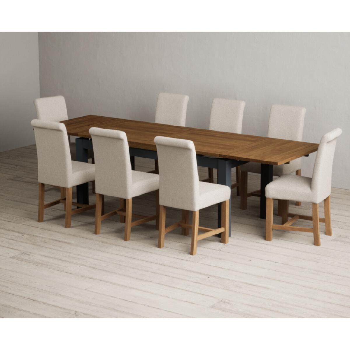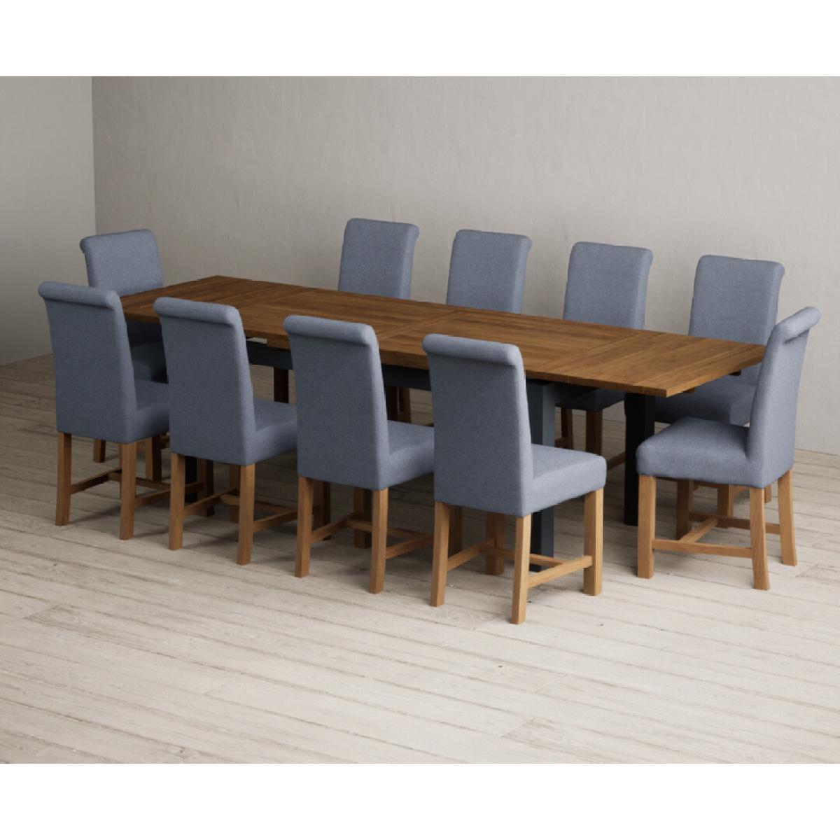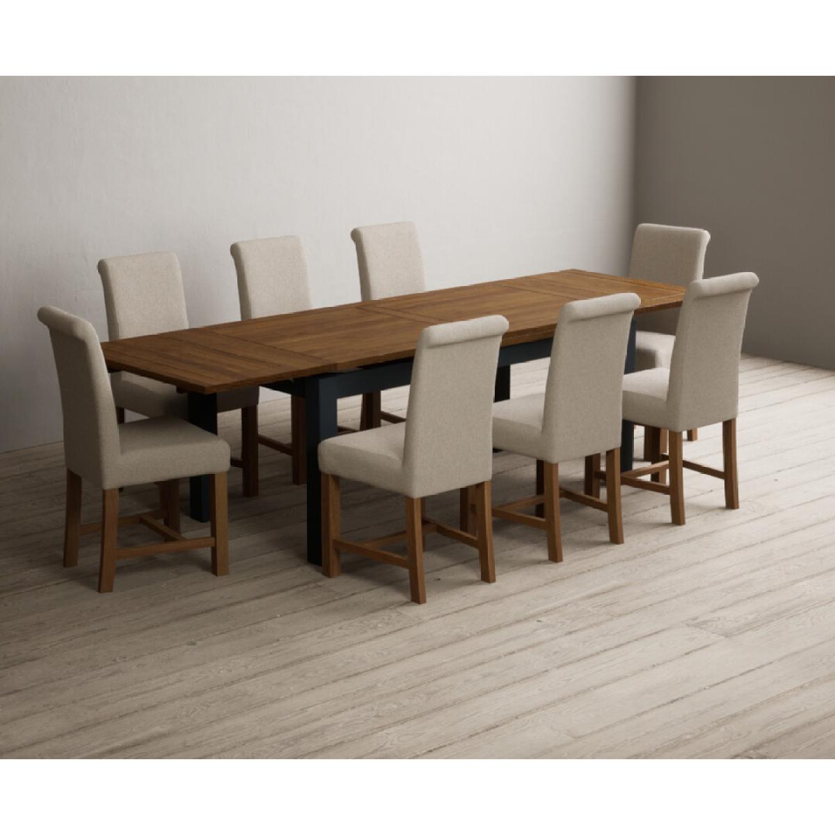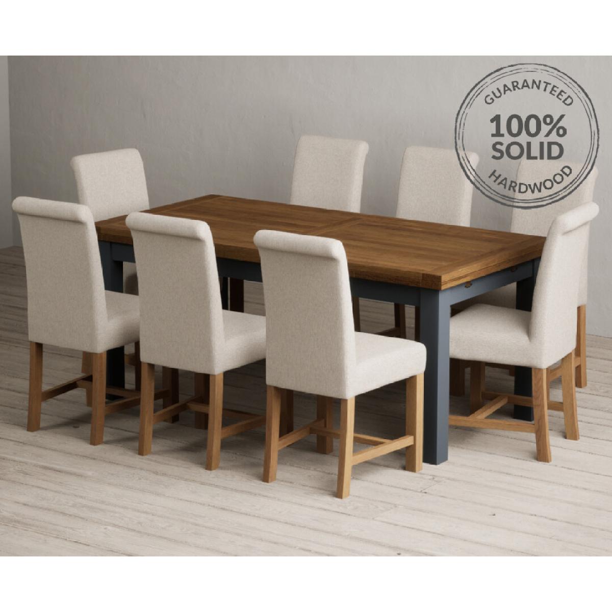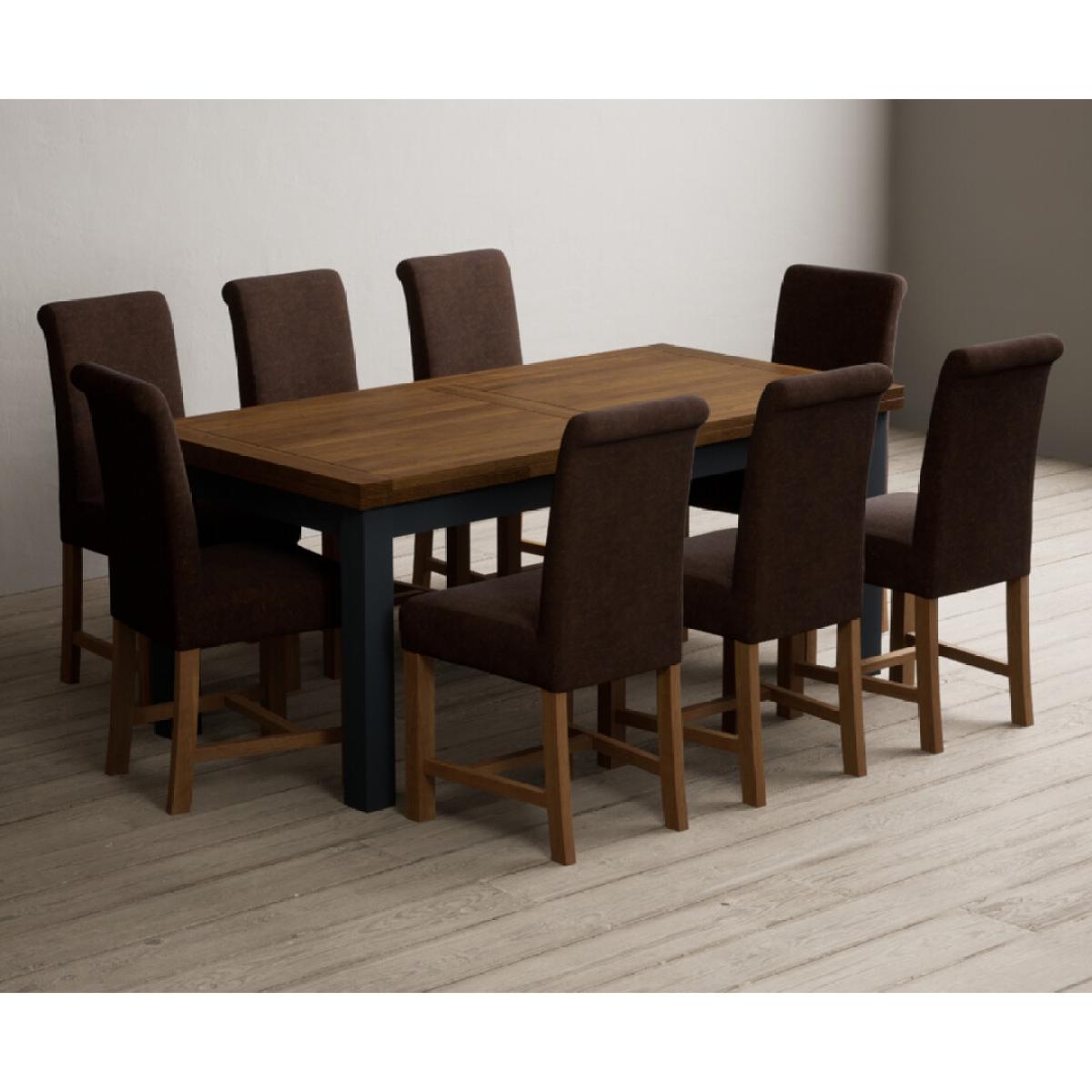 Extending Buxton 180cm Oak and Dark Blue Painted Dining Table with 8 Blue Scroll Back Chairs
