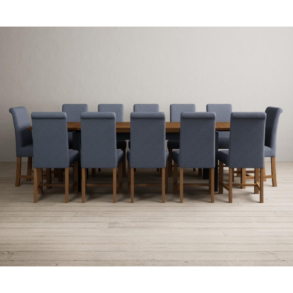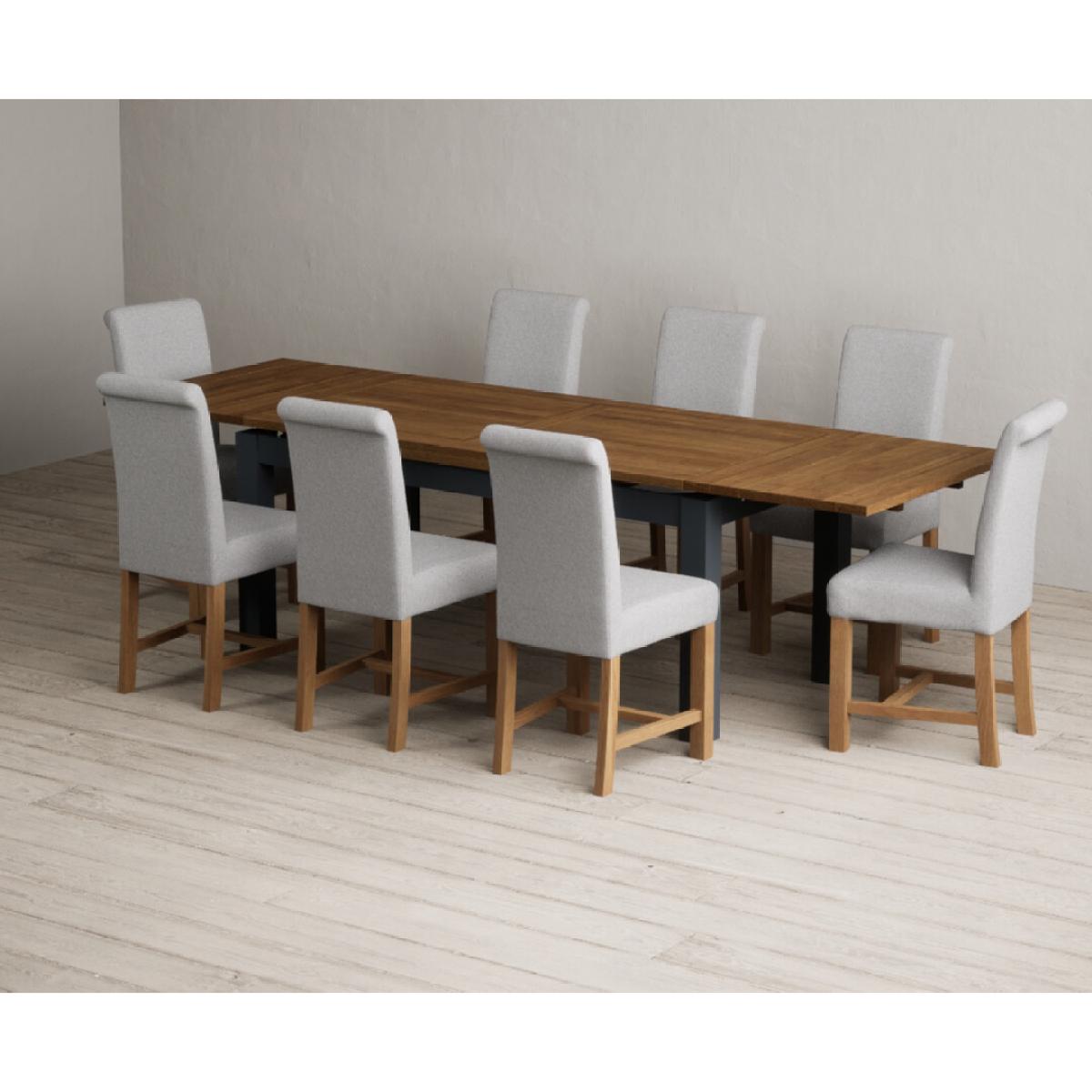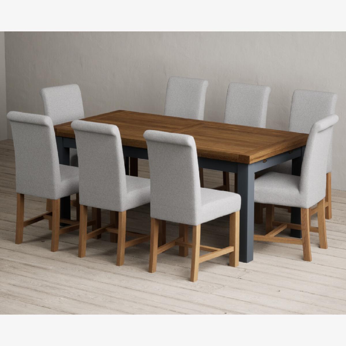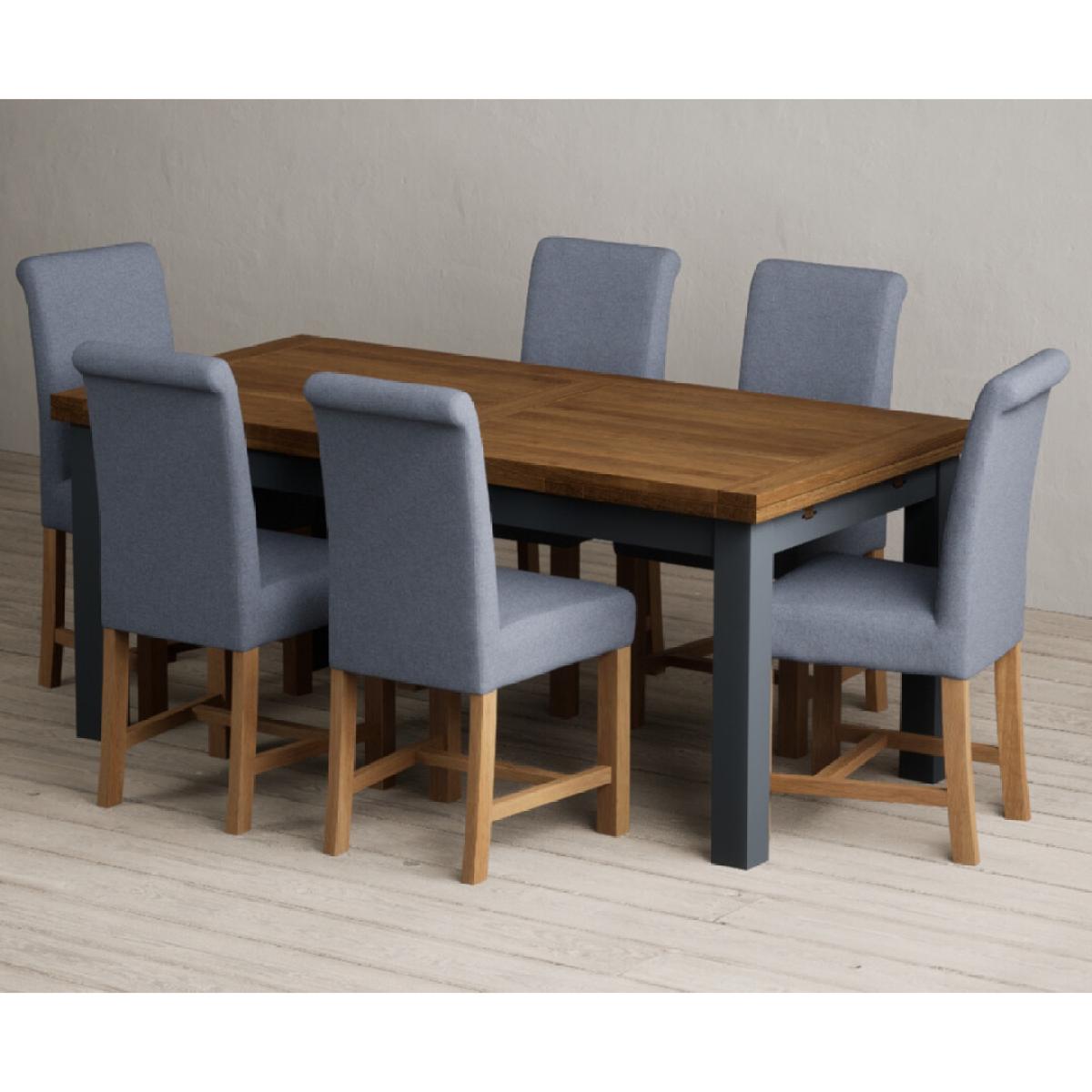 Extending Buxton 180cm Oak and Dark Blue Painted Dining Table with 8 Blue Scroll Back Chairs